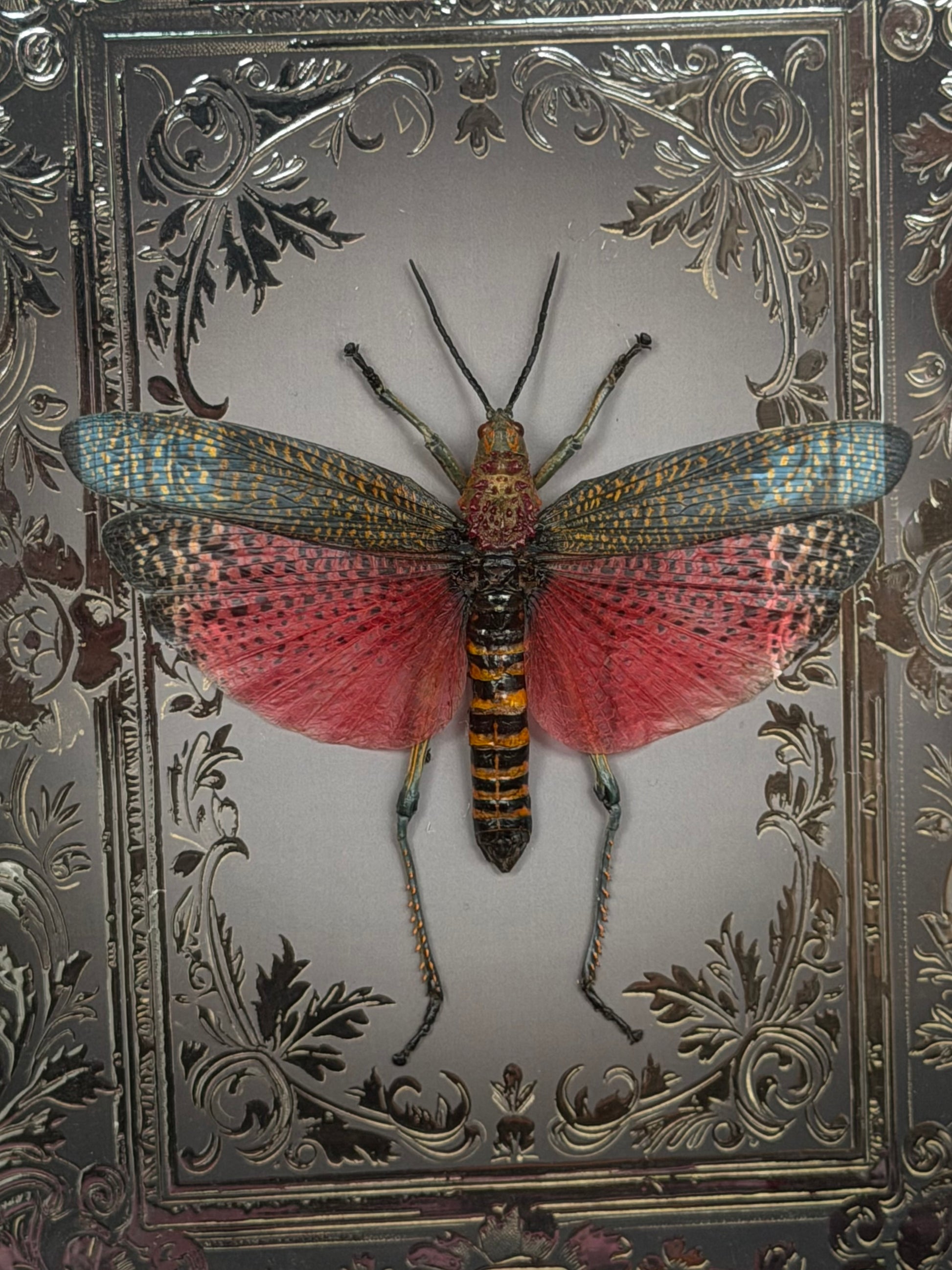 Rainbow Milkweed Locust Phymateus saxosus madagascariensis Tulear Framed Specimen (SILVER)
