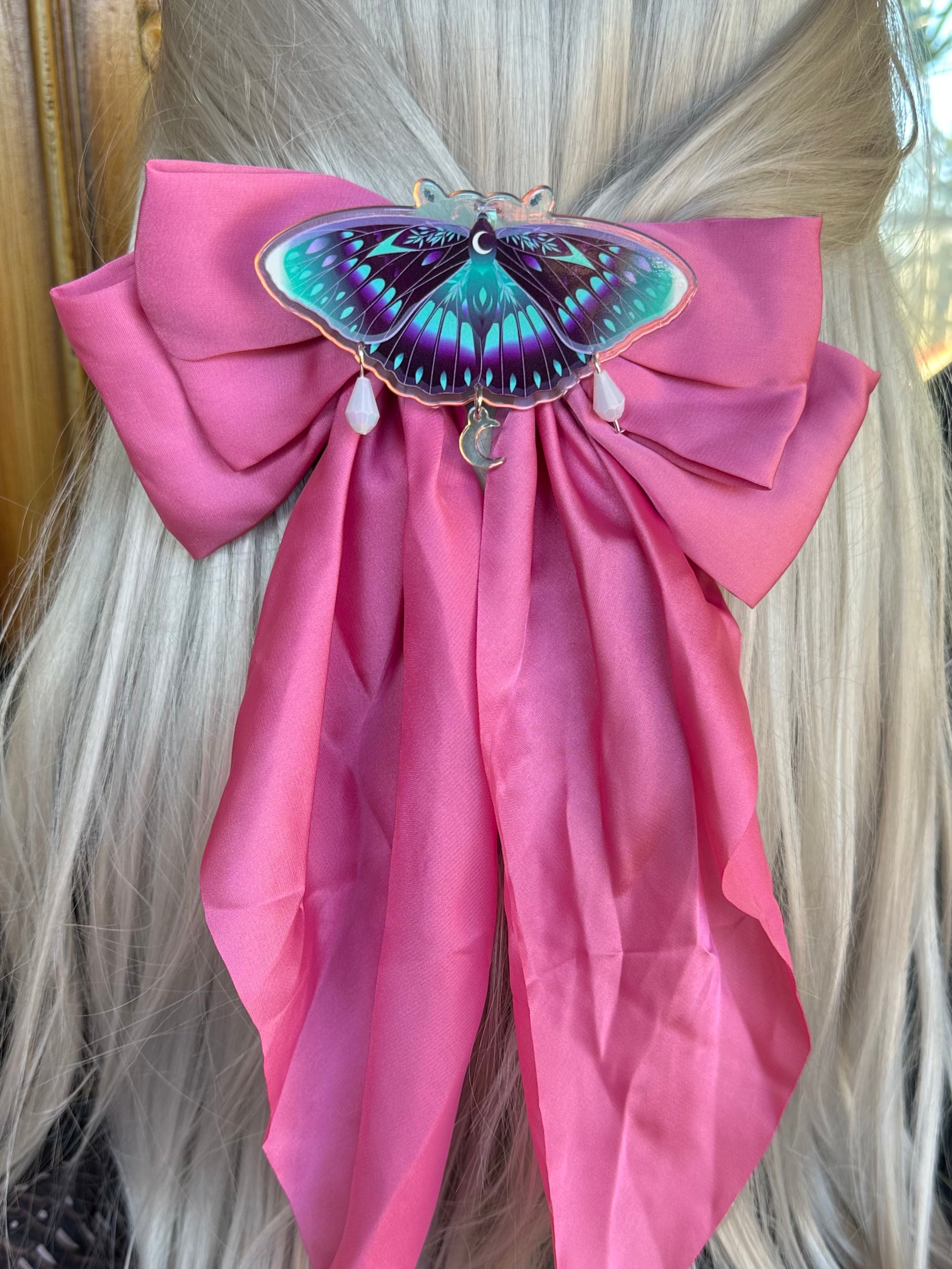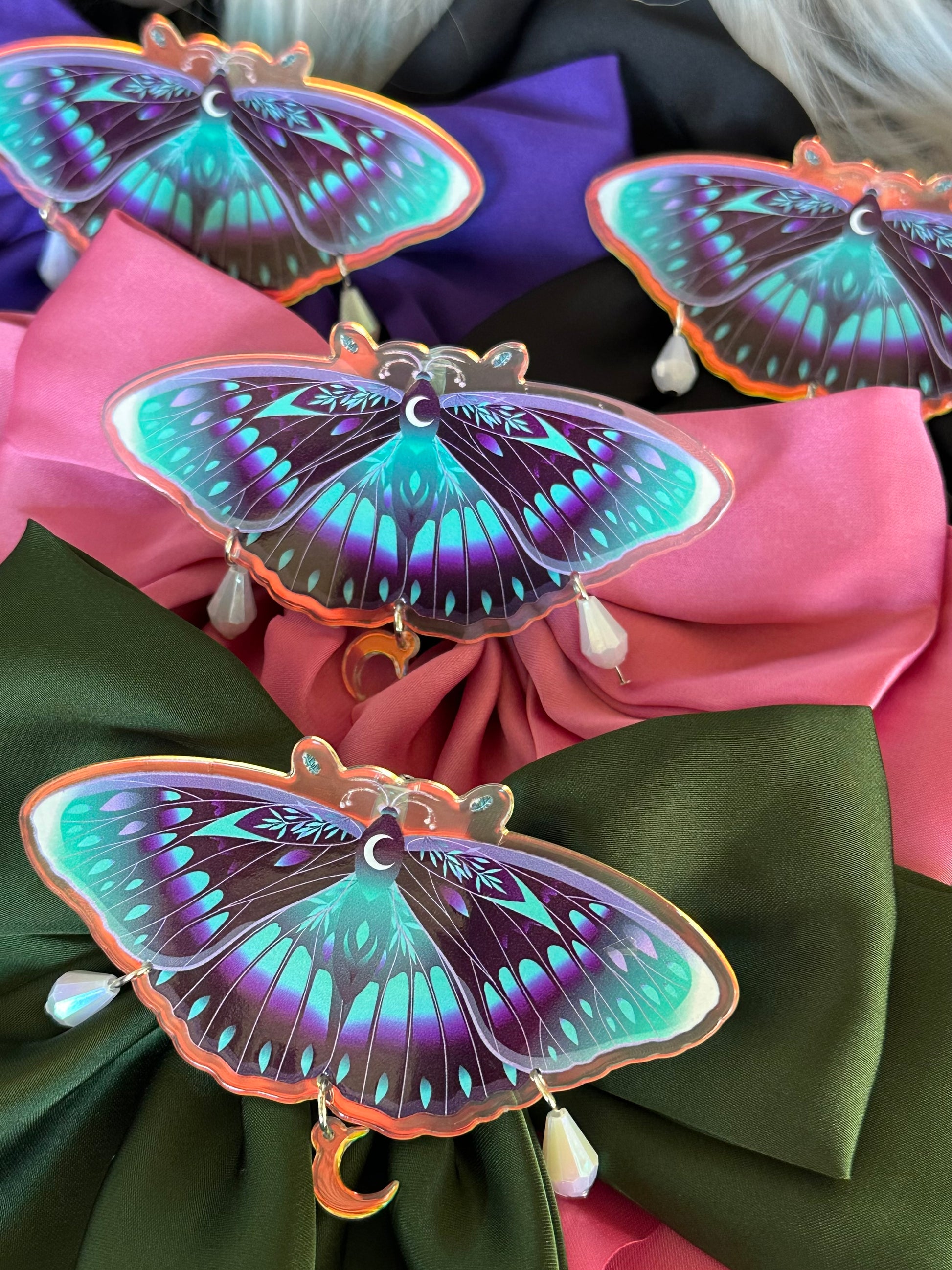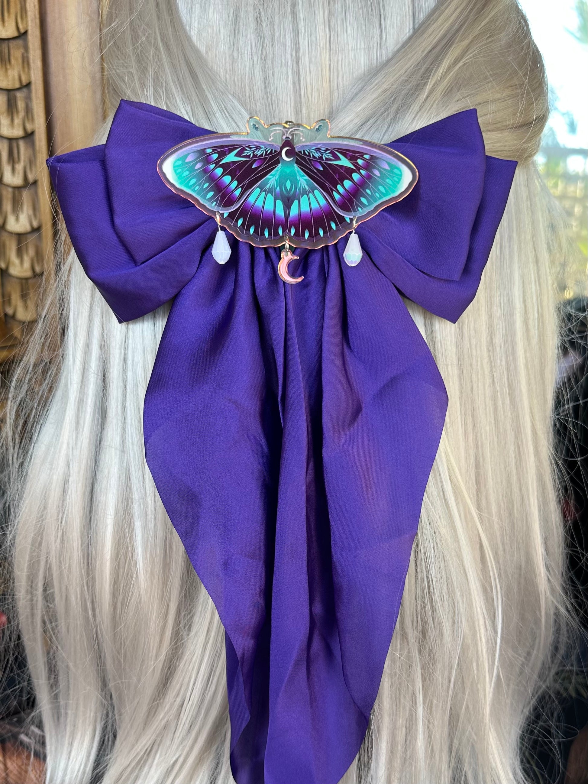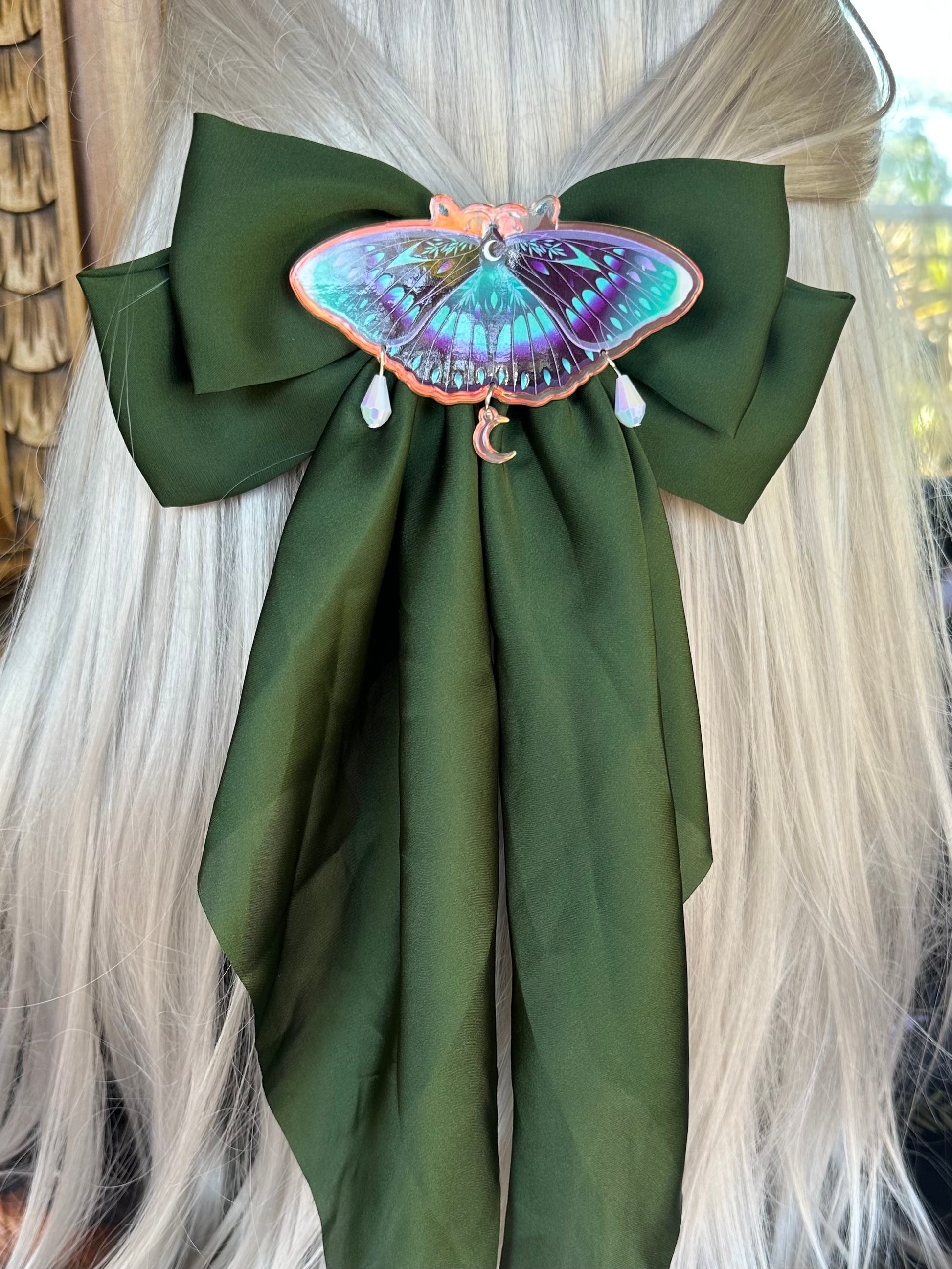 Beautiful handmade satin swallow-tail bow with a gorgeous custom made La Bella Luna moth broach. Snap-close hairclip clasp for securing to your hairstyle.