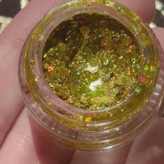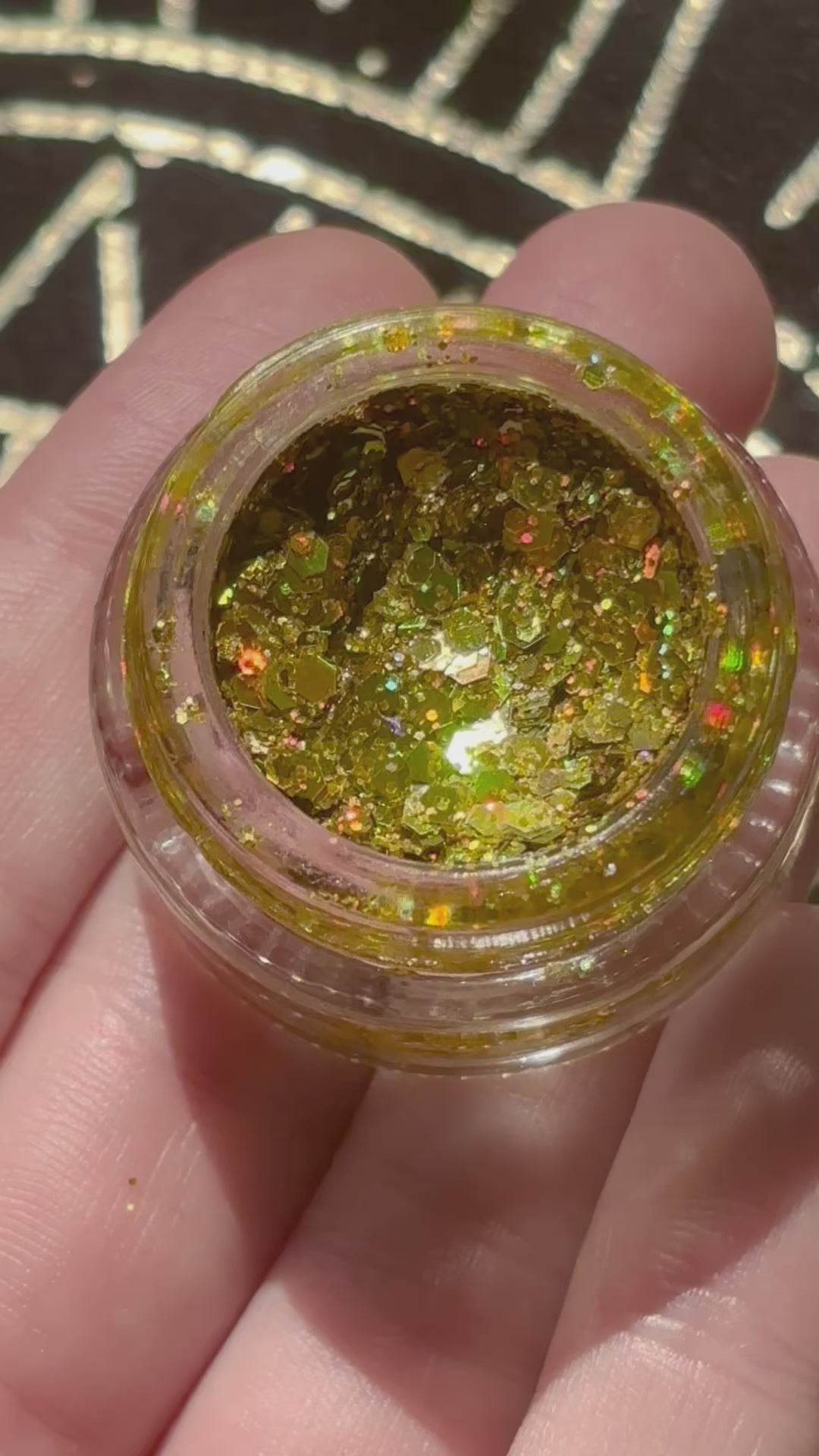 Self adhering mixture of glitter, Mylar and balm to add the perfect pop of ethereal glow.