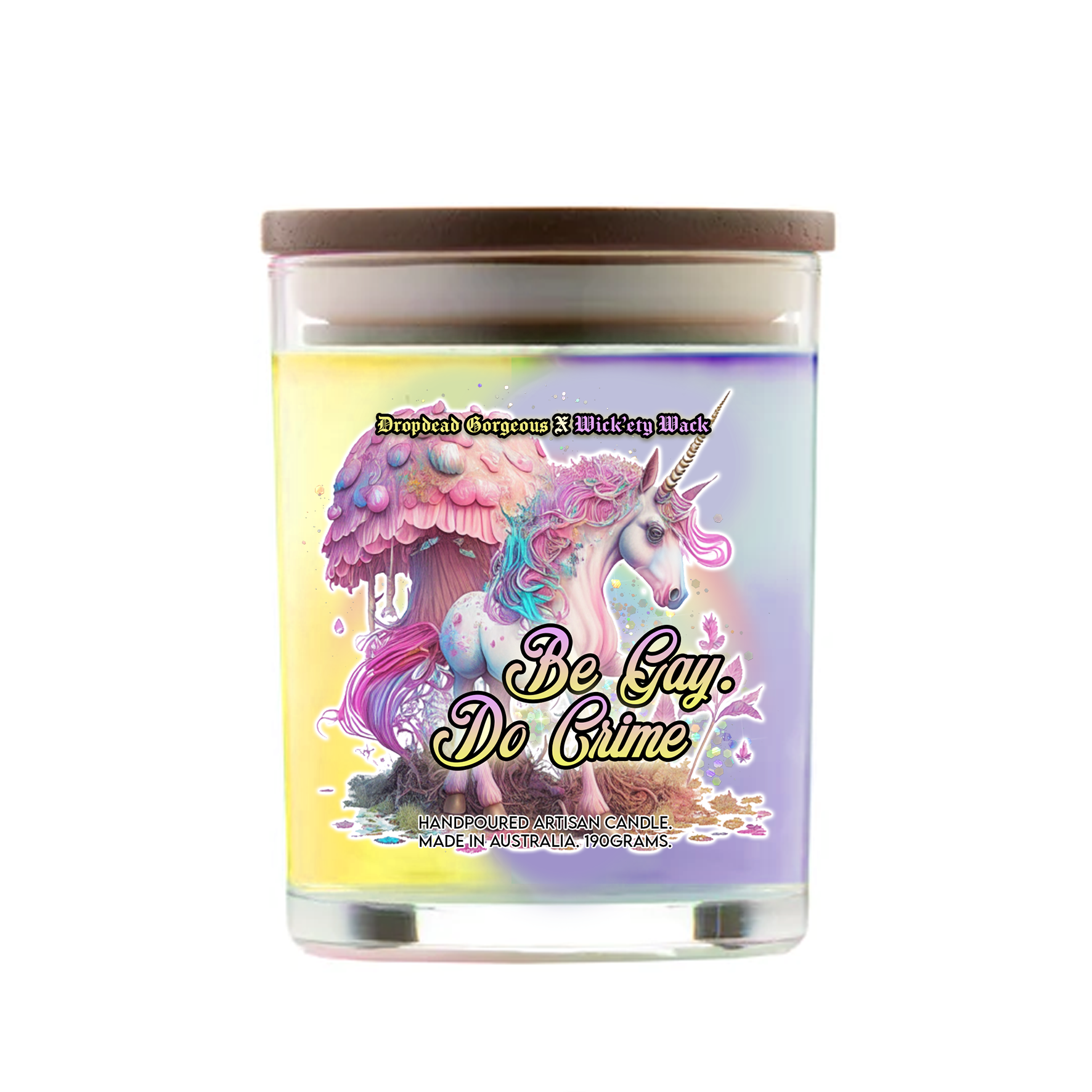 BE GAY DO CRIME is a Fruit Loops fragranced candle, hand poured with all the love and care by our super gay unicorn team.