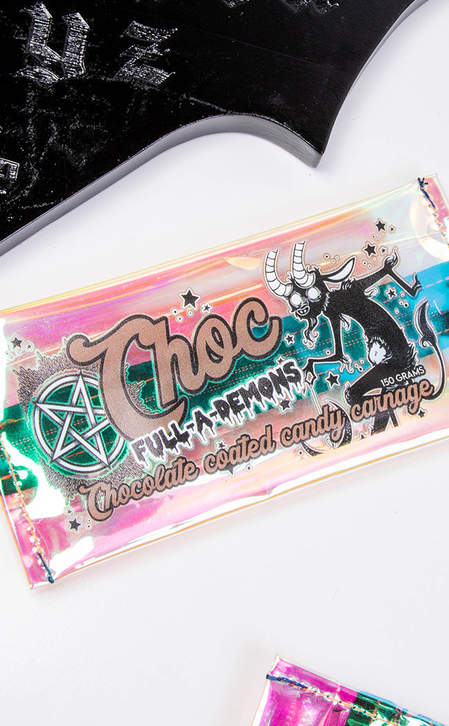 Take a bite outta the Choc Full-A Demons Coin & Card Purse! This handy little accessory is the perfect handbag companion: sturdy holo plastic printed with an adorable chocolate demon in the style of a chocolate bar.
