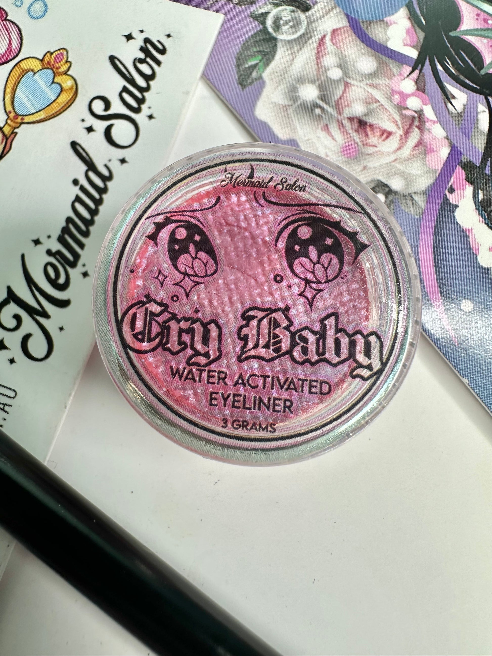 Mermaid Salon CryBaby Aqua-Liner is a traditional eyeliner / face paint hybrid. Cauldron smoke is a beige to lilac to aqua pastel shift.