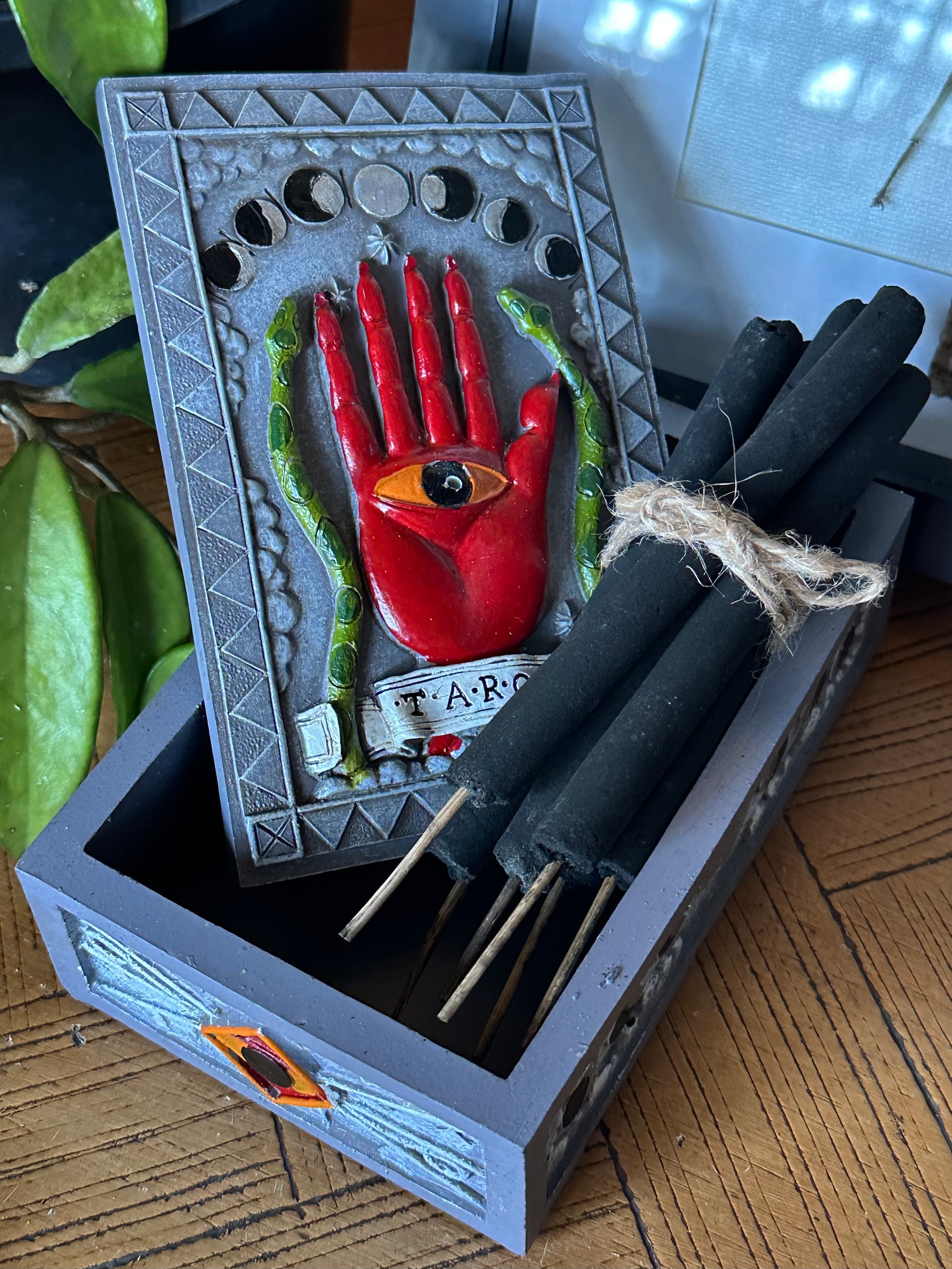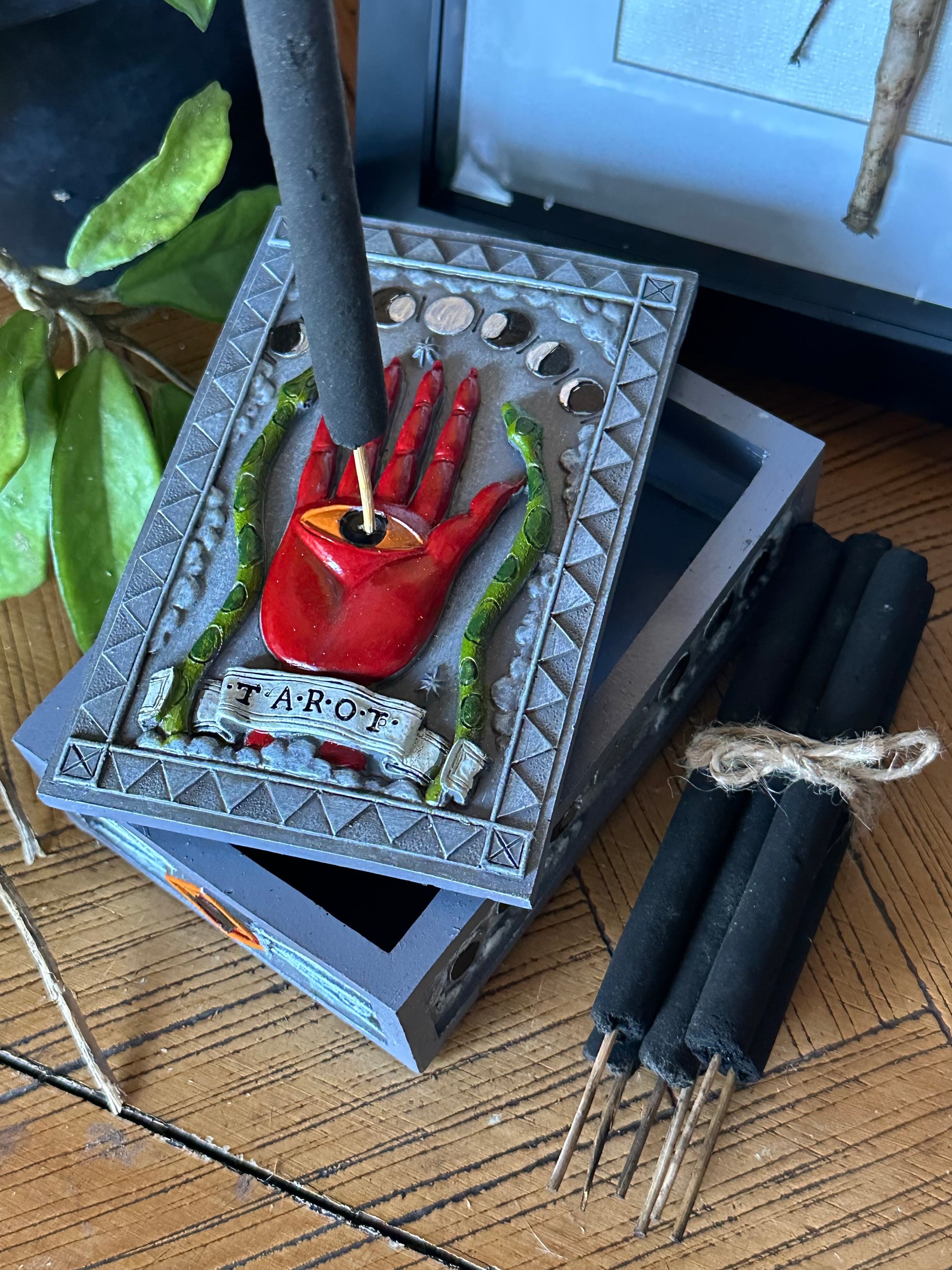 Tarot box perfect for your deck. Plus 6 incense sticks and a spot to burn them while you’re doing witchcraft.