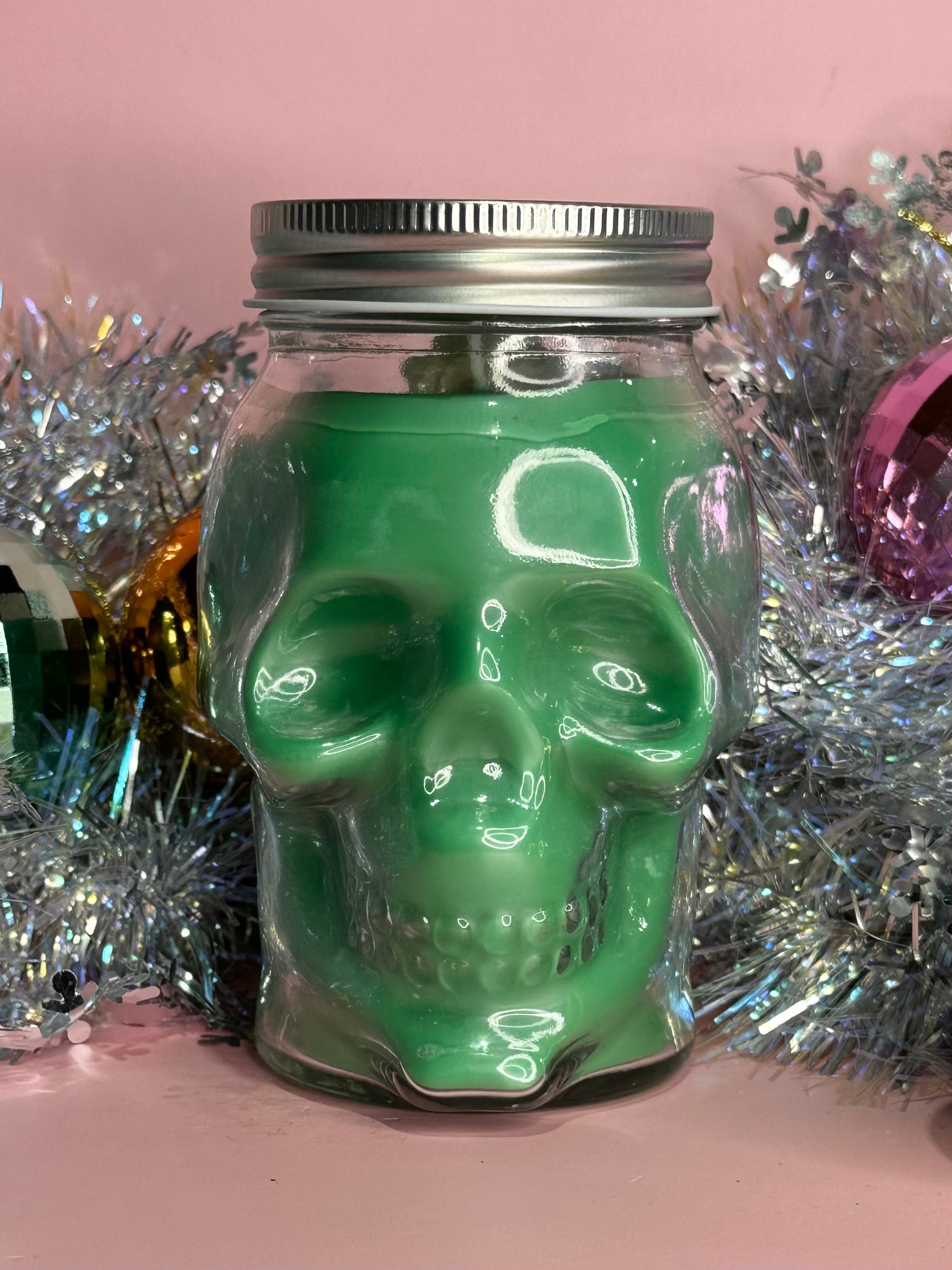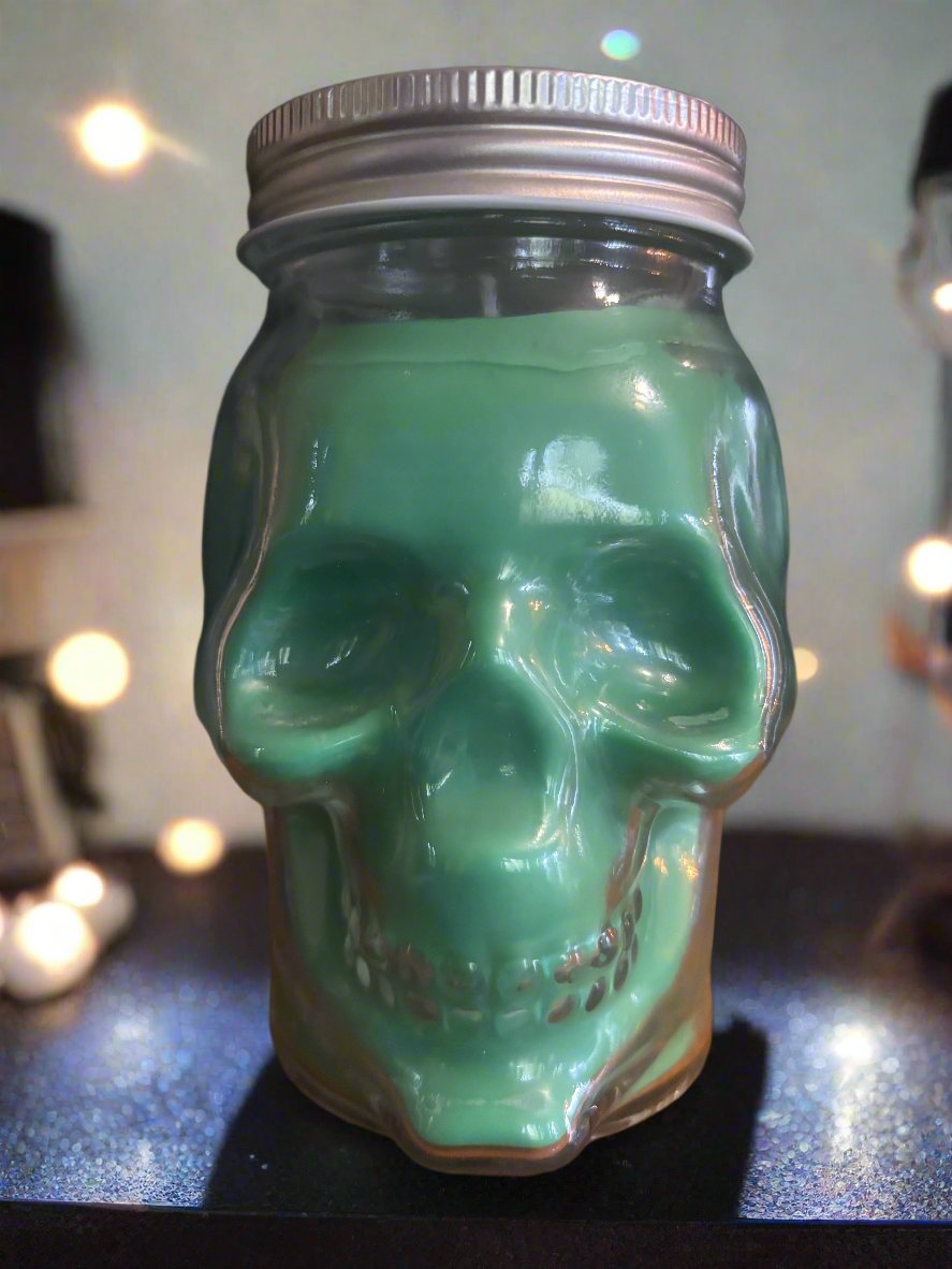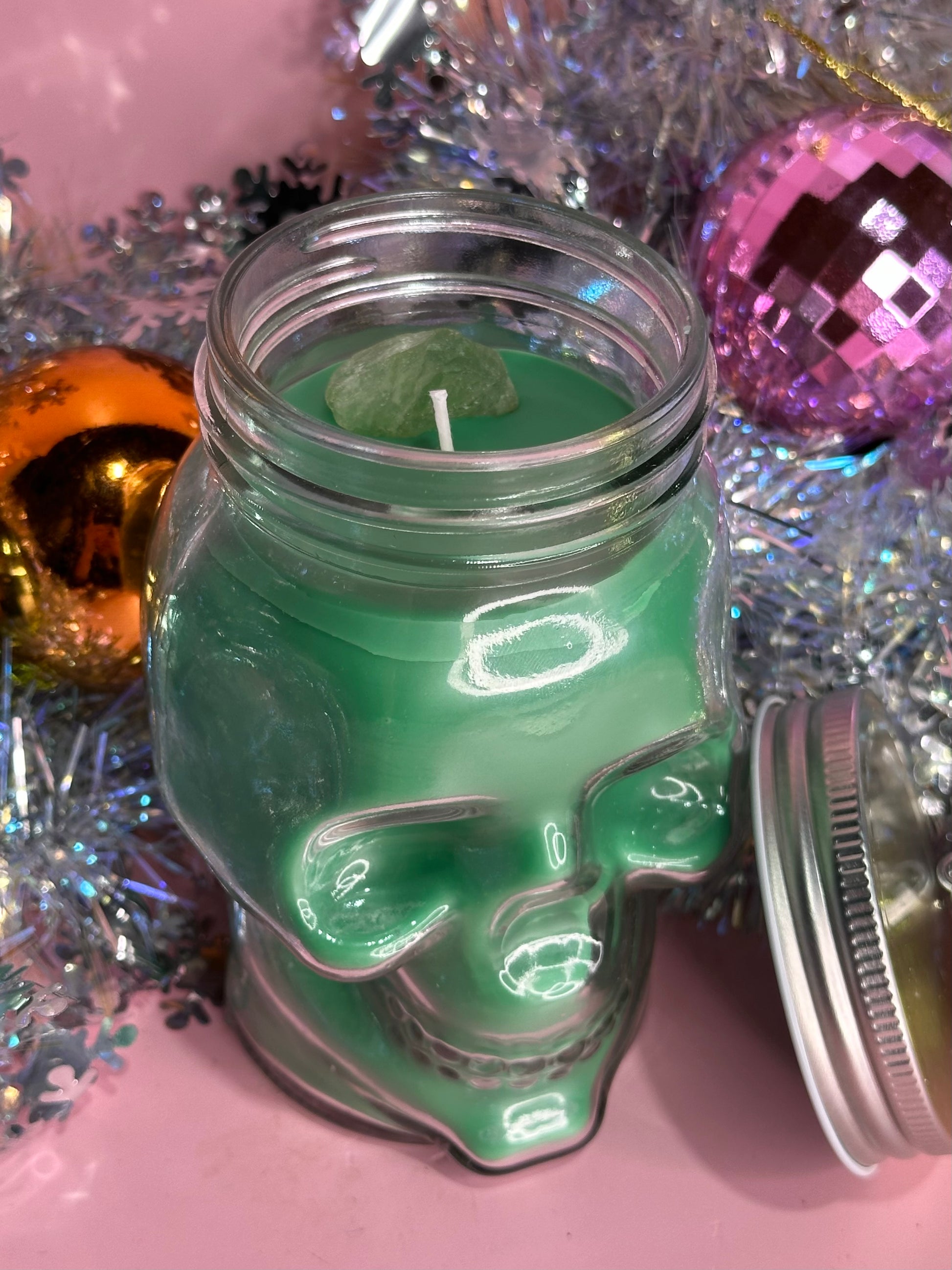 This beautiful hand poured candle is 100% soy wax, topped with a chunk of genuine adventurine in a glass, skull shaped, reusable vessel.