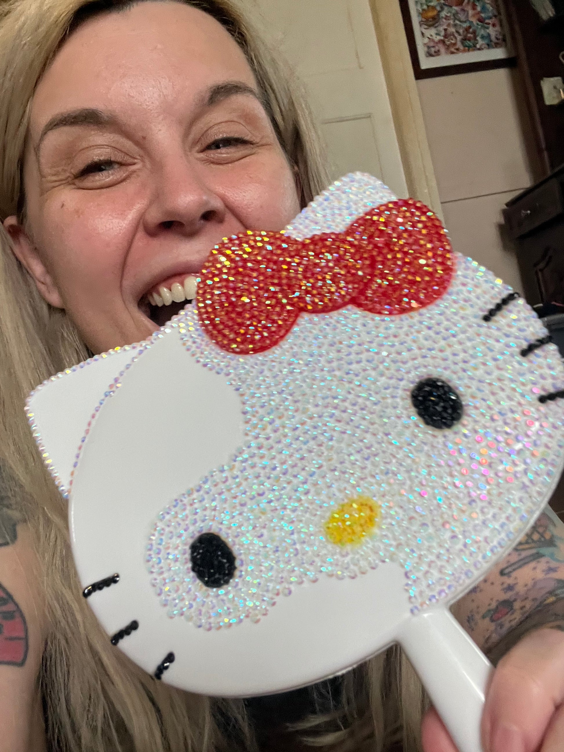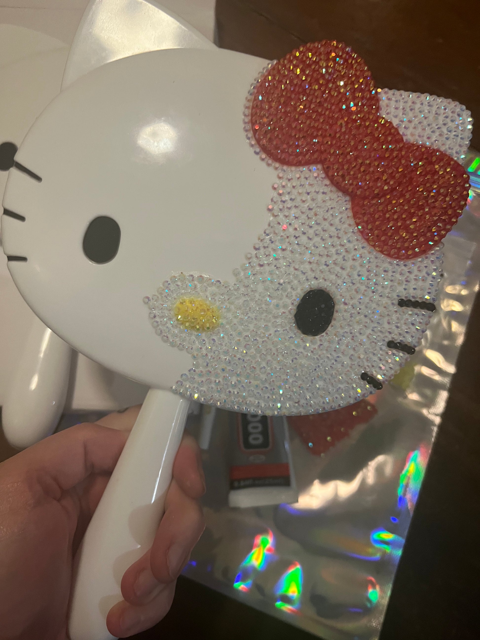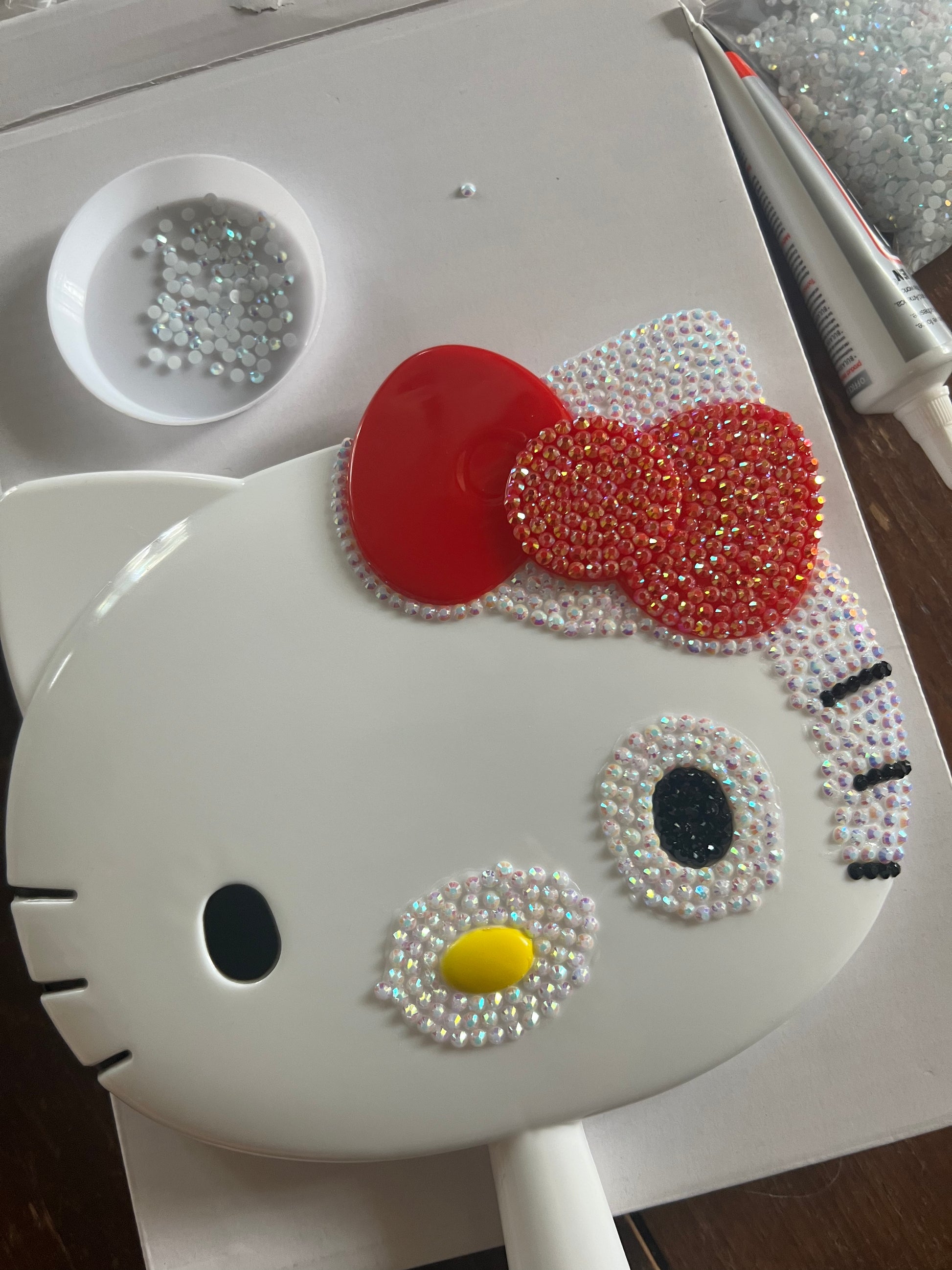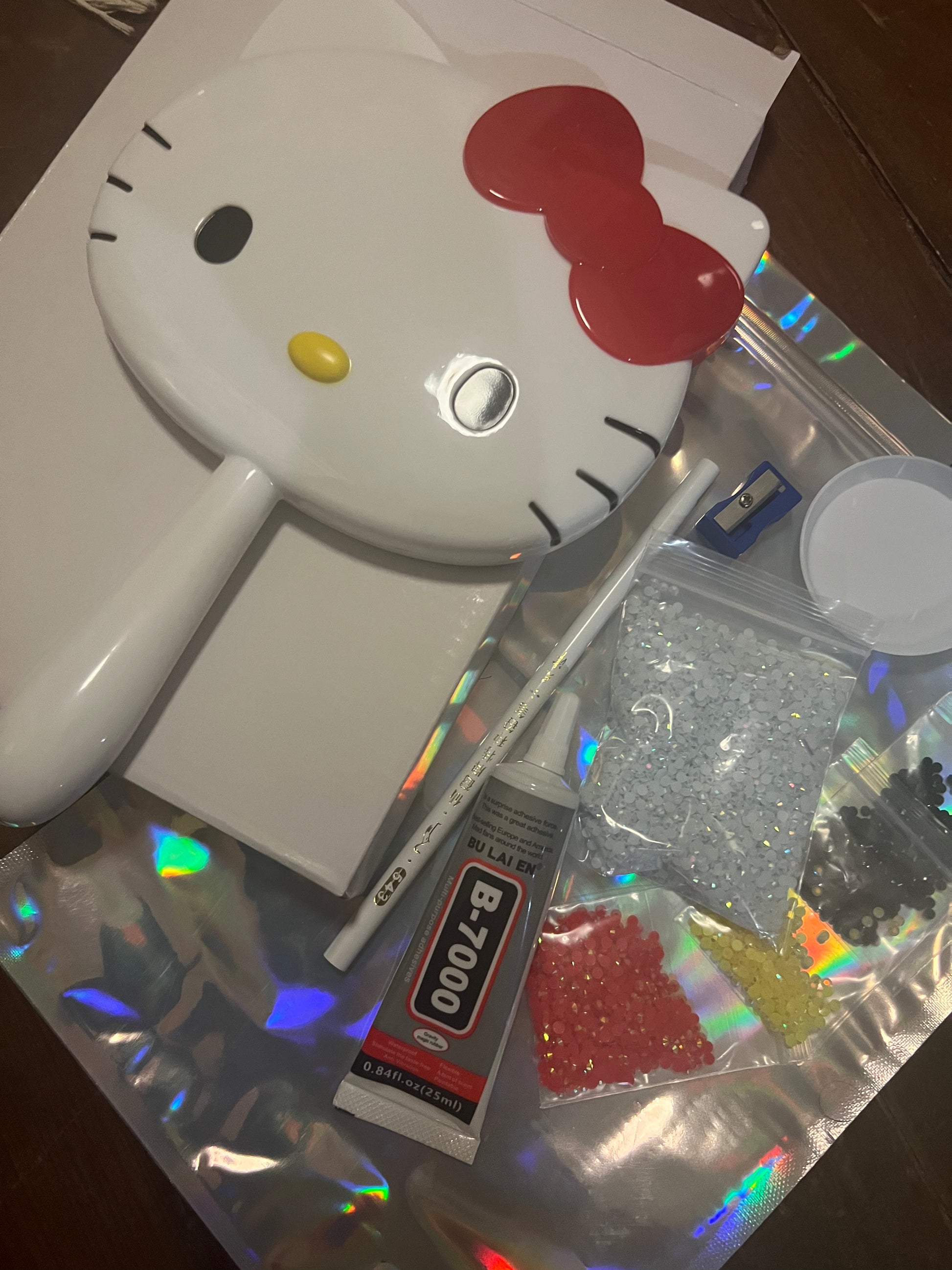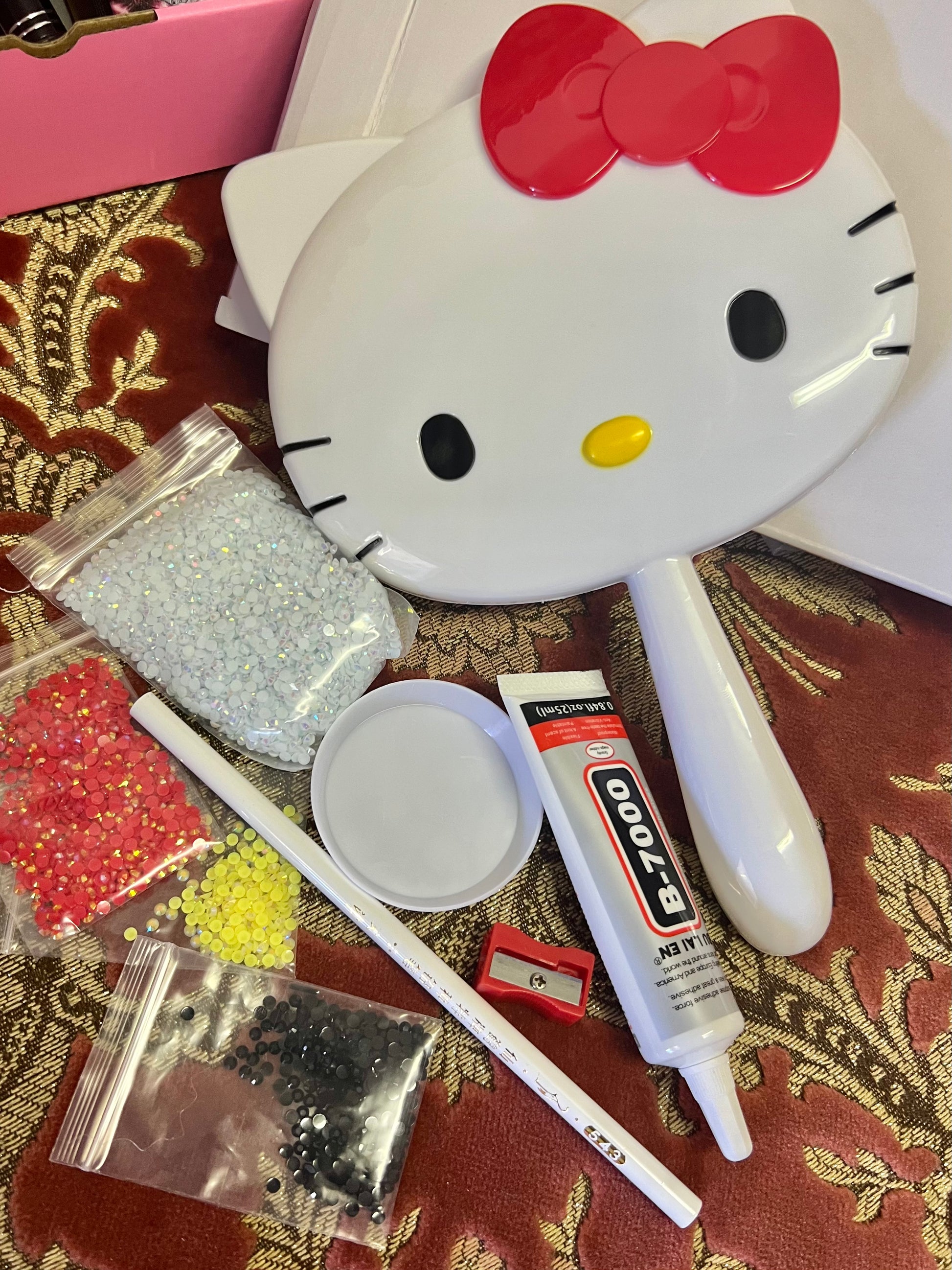1x kitty mirror, 1x wax pick up pencil, 1x sharpener, 1x mini shake tray, white, black, red and yellow crystals and a 25ml b7000 glue.