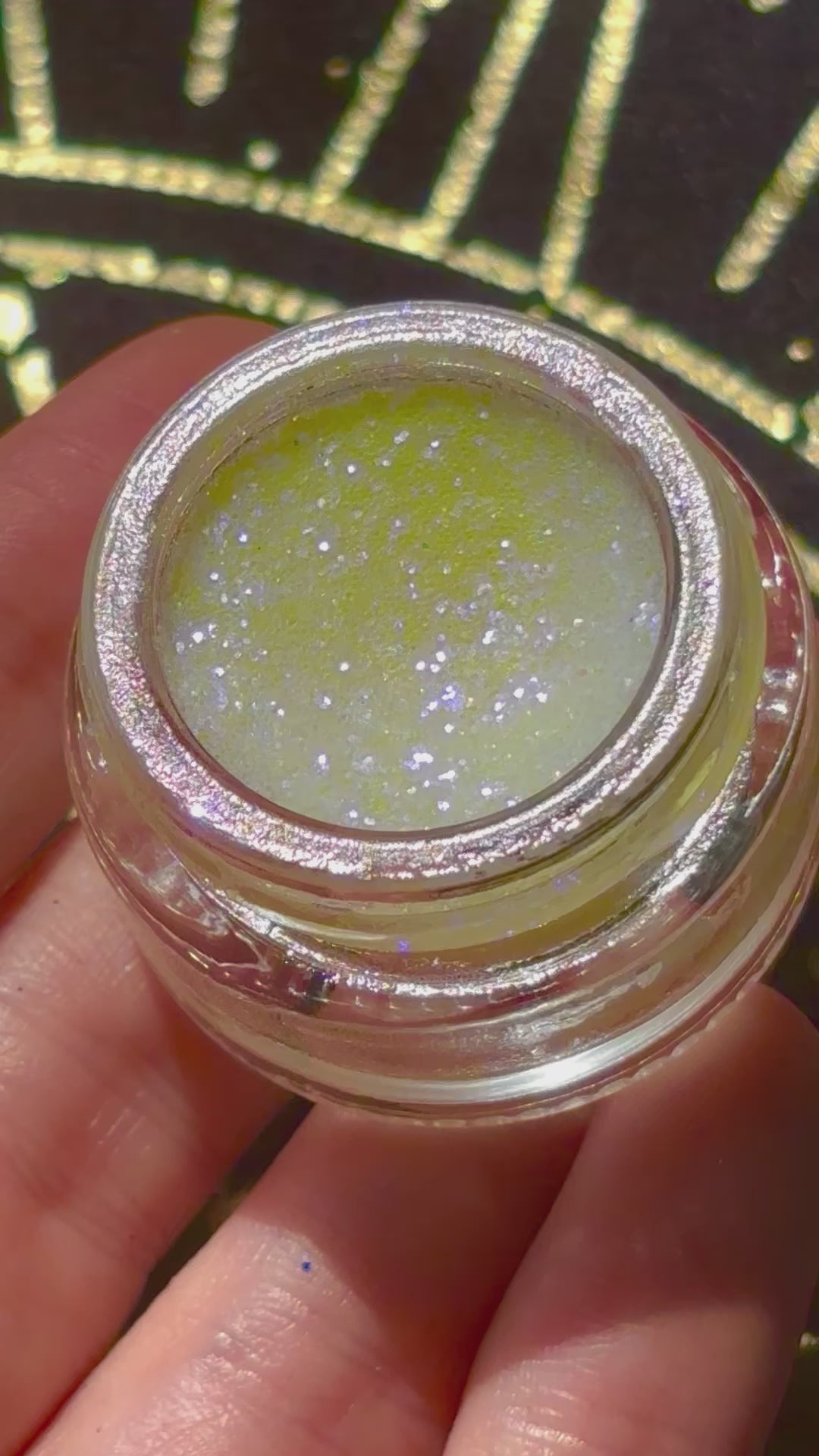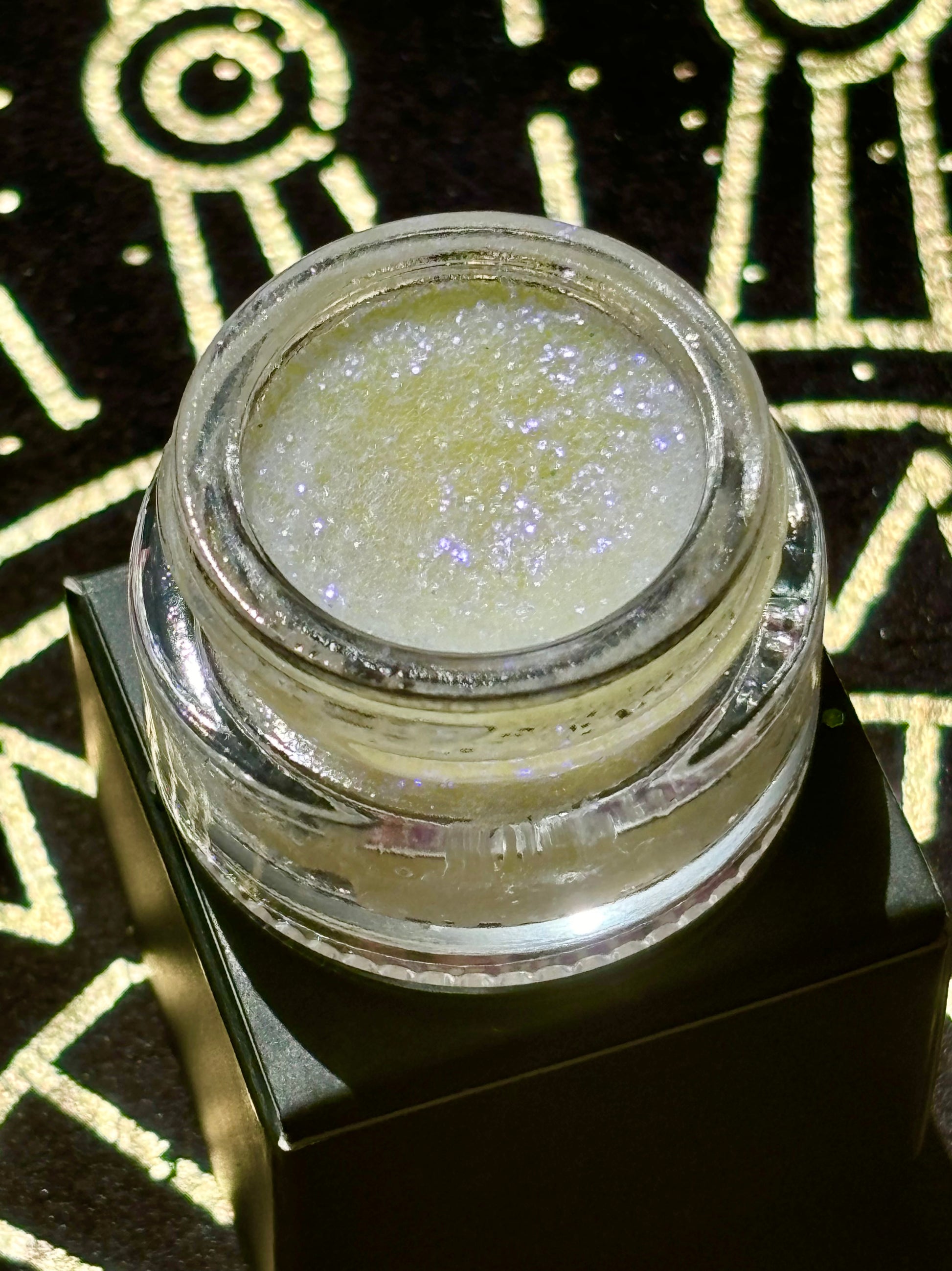 Self adhering mixture of glitter, Mylar and balm to add the perfect pop of ethereal glow.