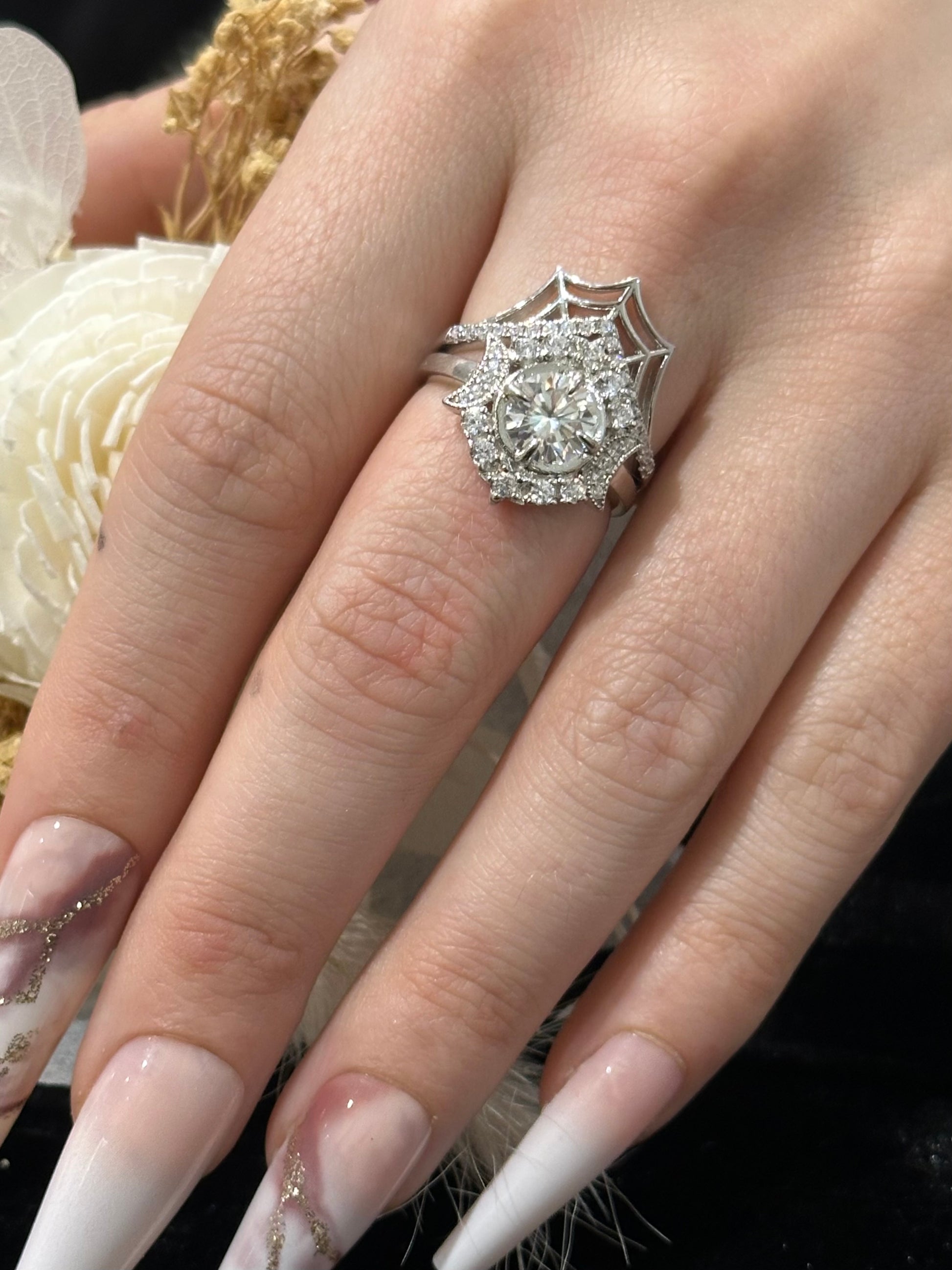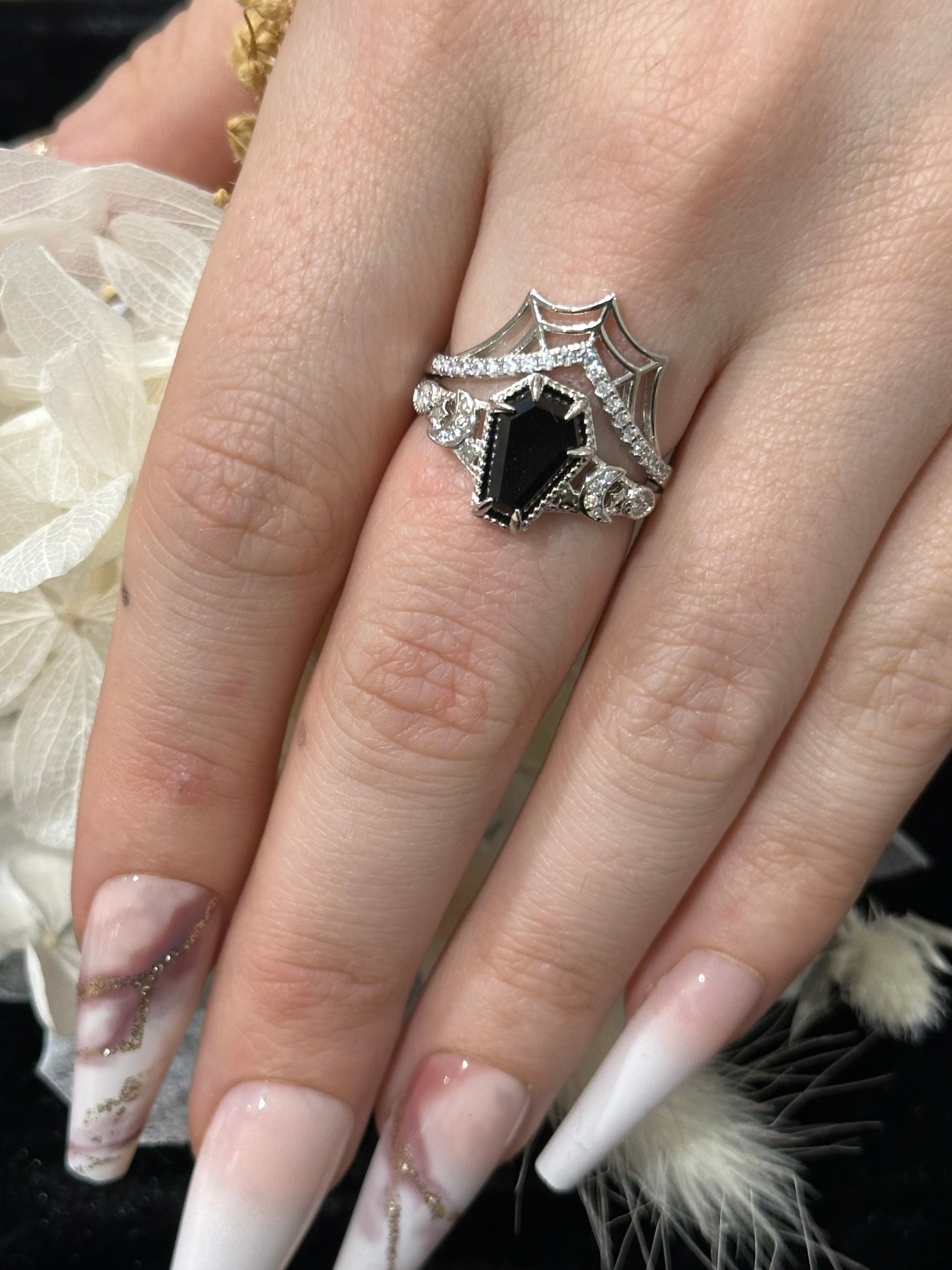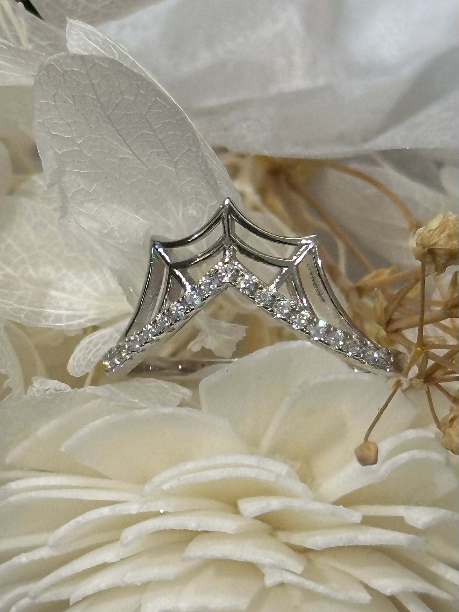 Spider web featured lined with cubic zirconia stones. Our stones are lab created - which means they are not glass, they are stones created in the same circumstances as a natural occurring stone is created , in a supervised lab to “grow” the stones. These stones are mine-free.