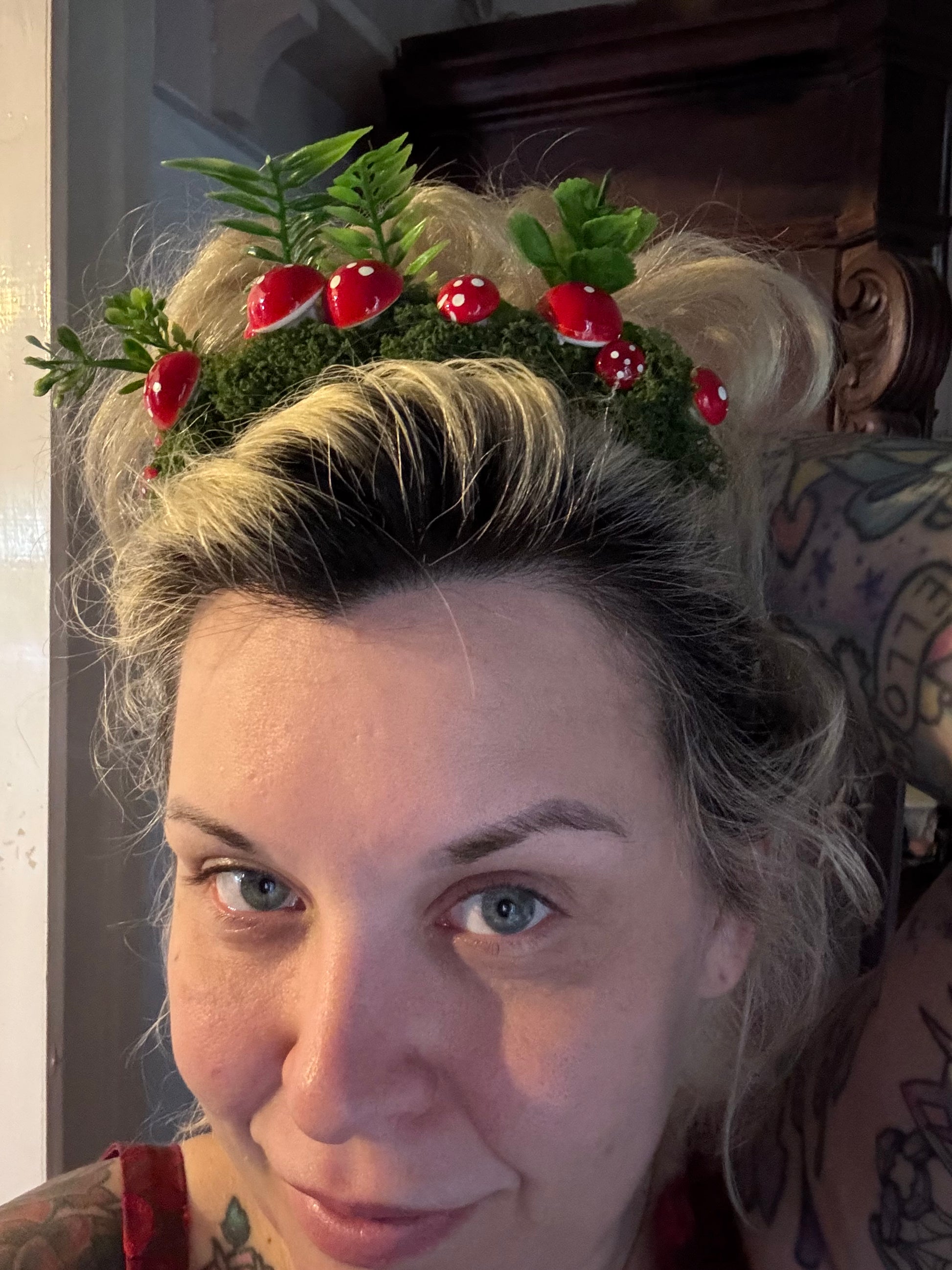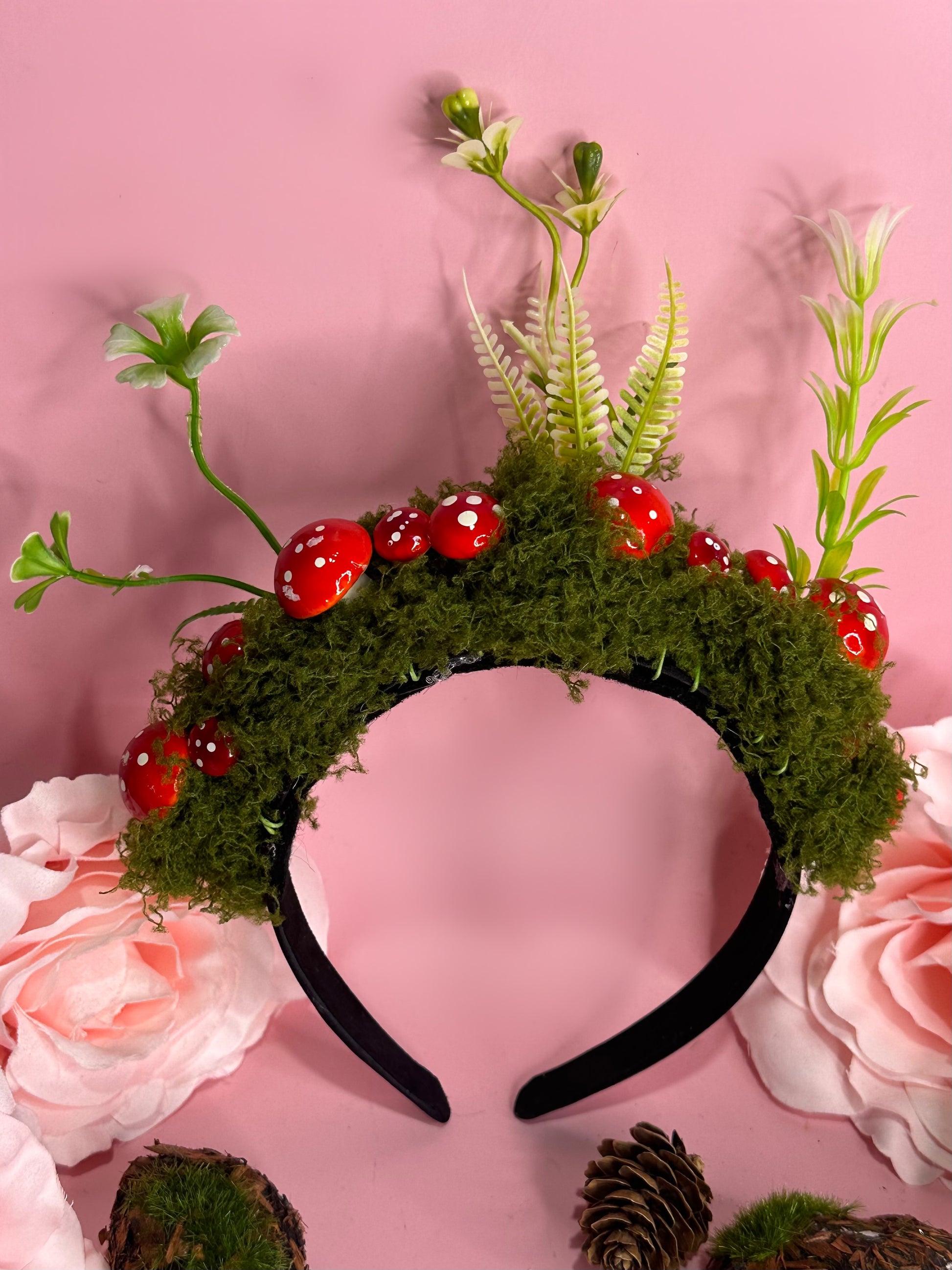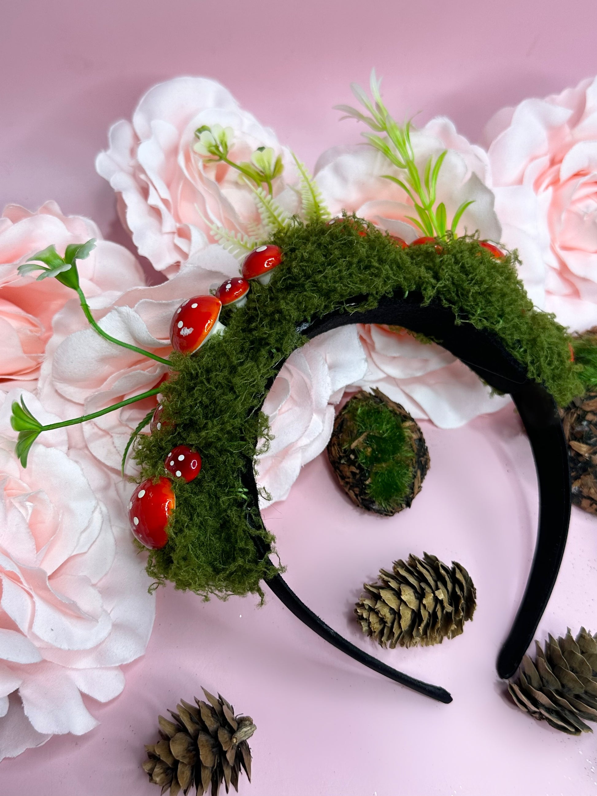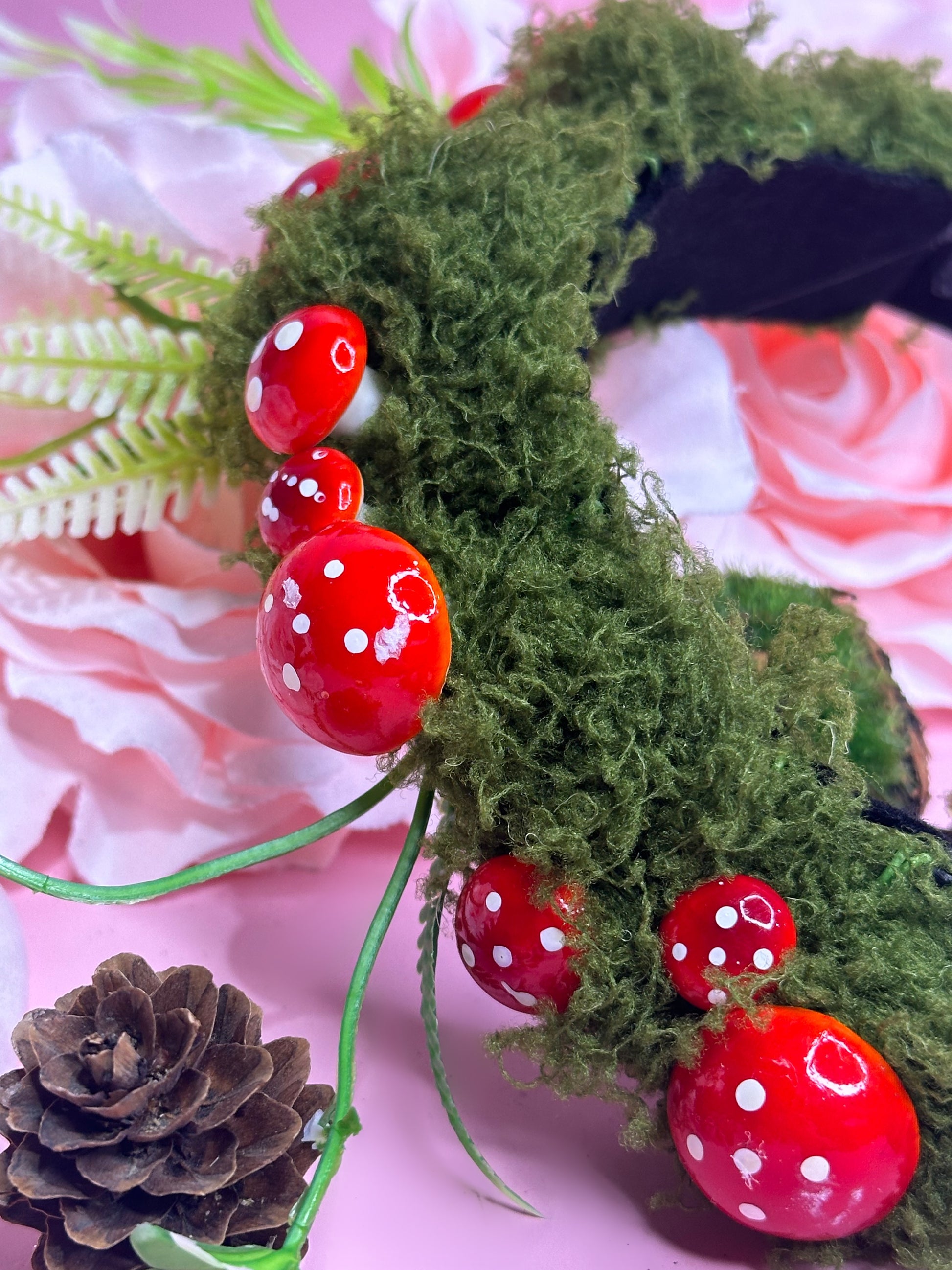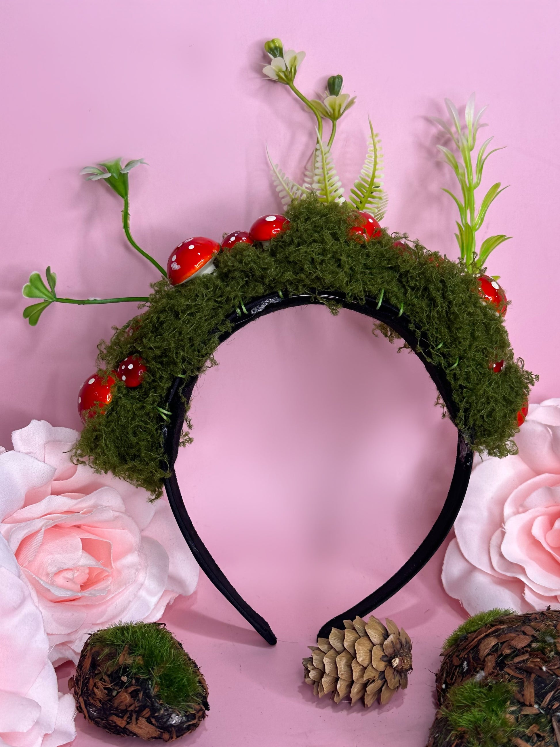 Faux mushroom, moss and greenery hand stitched to a durable headband.