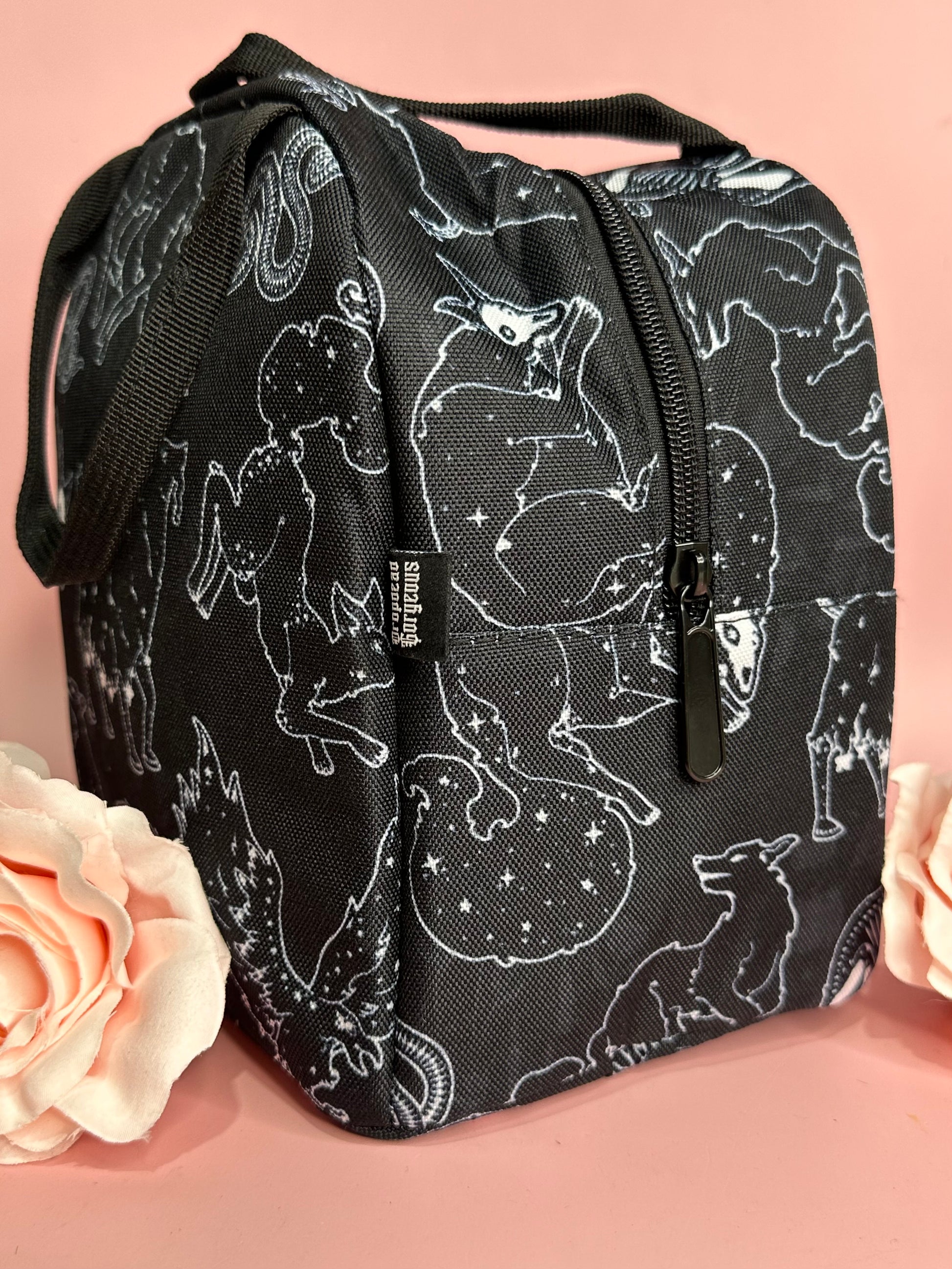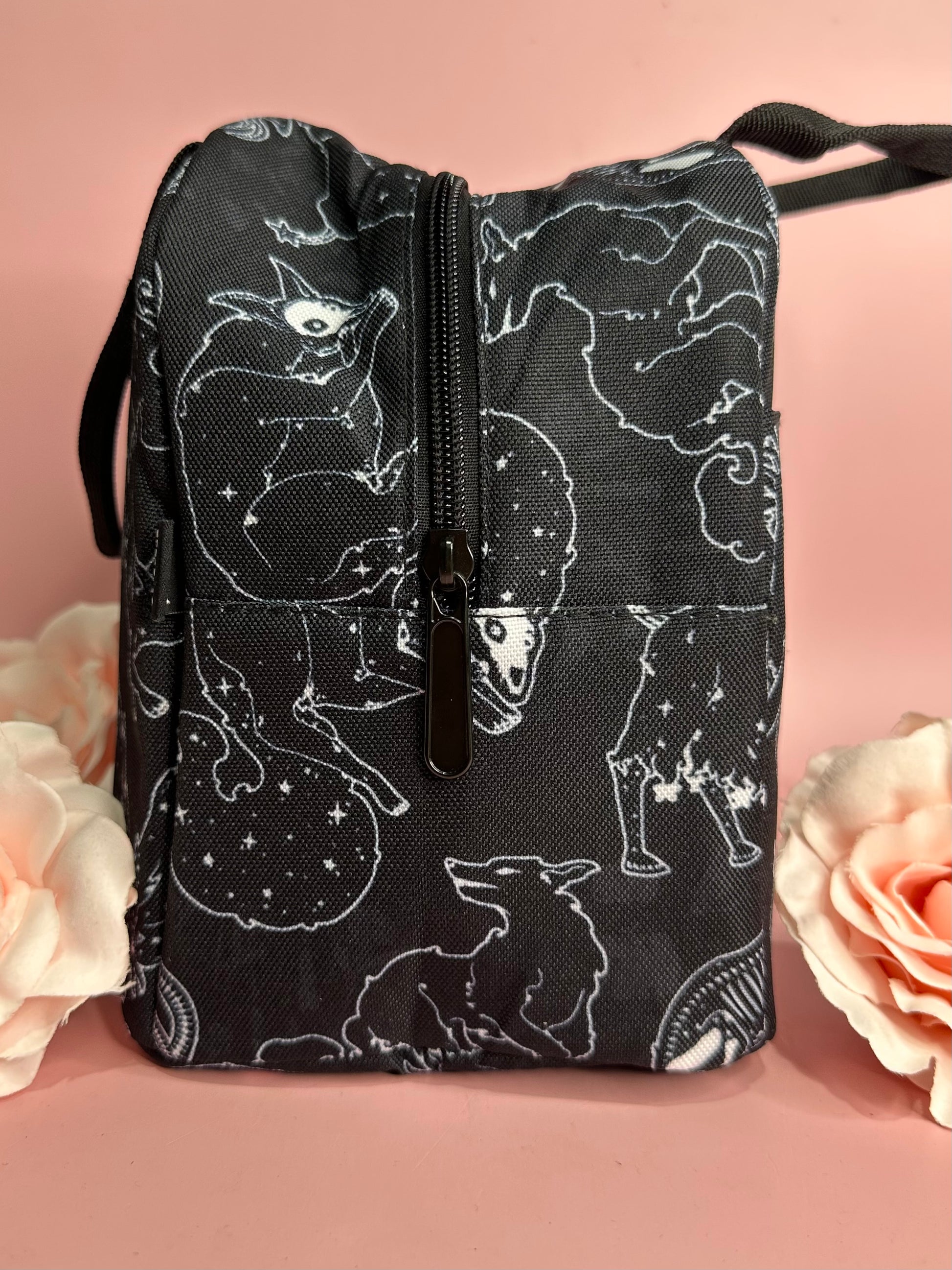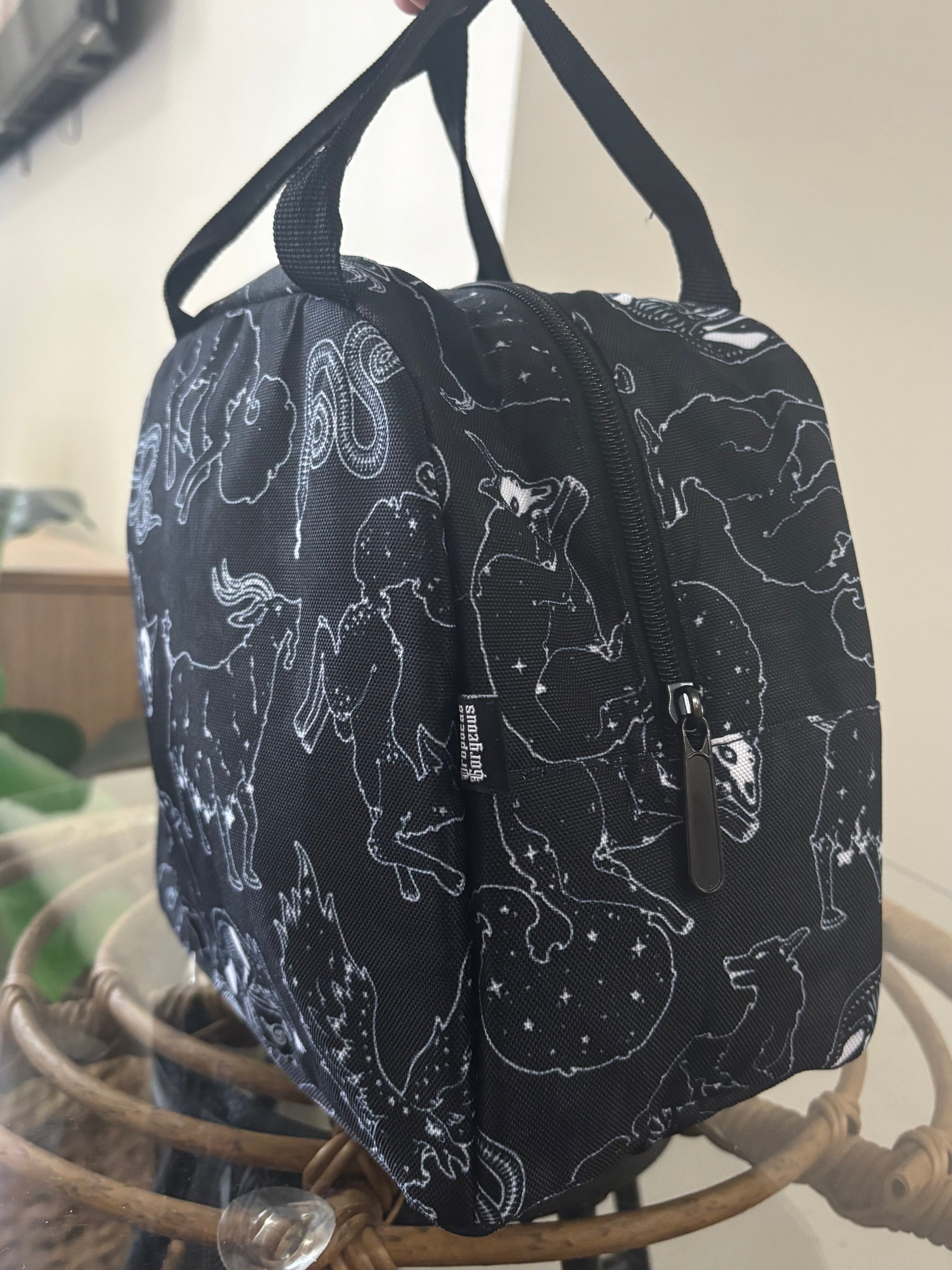 Spend your lunch time in magical style with our insulated, zipper top lunch bags! Heavy duty poly canvas construction with insulated lining to keep your lunch either cold as the night or hot as hell.