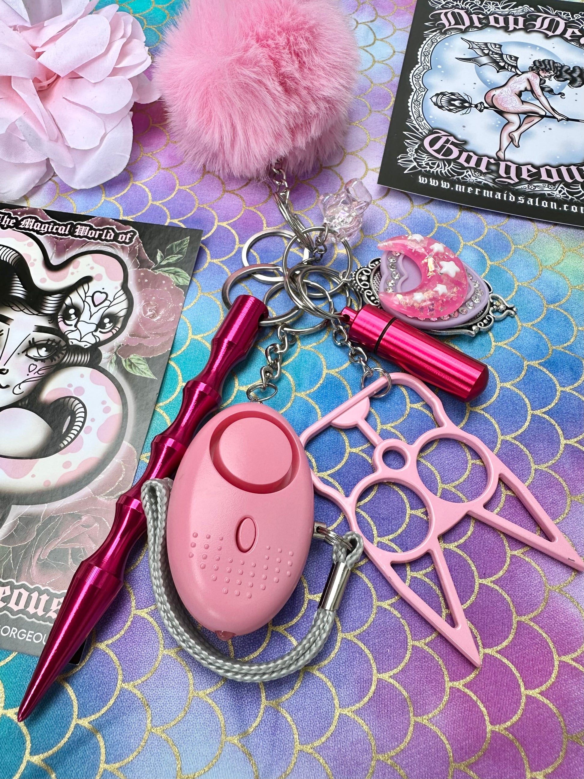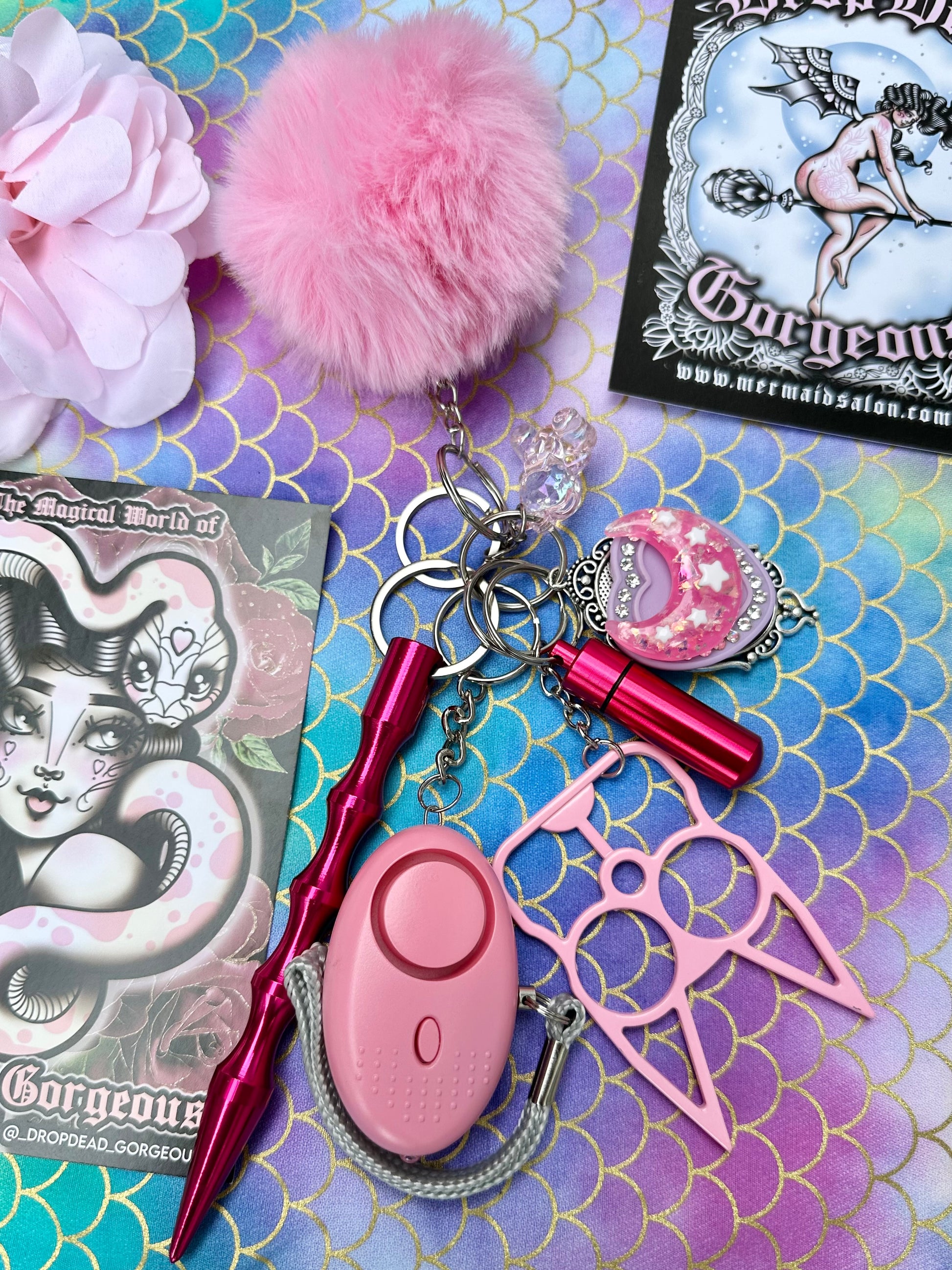 Personal safety keychain equipped with Window breaker, pill container keychain, personal alarm, and a cute lil metal kitty that cares for your safety.Topped with the fluffiest and softest pompom EVER.