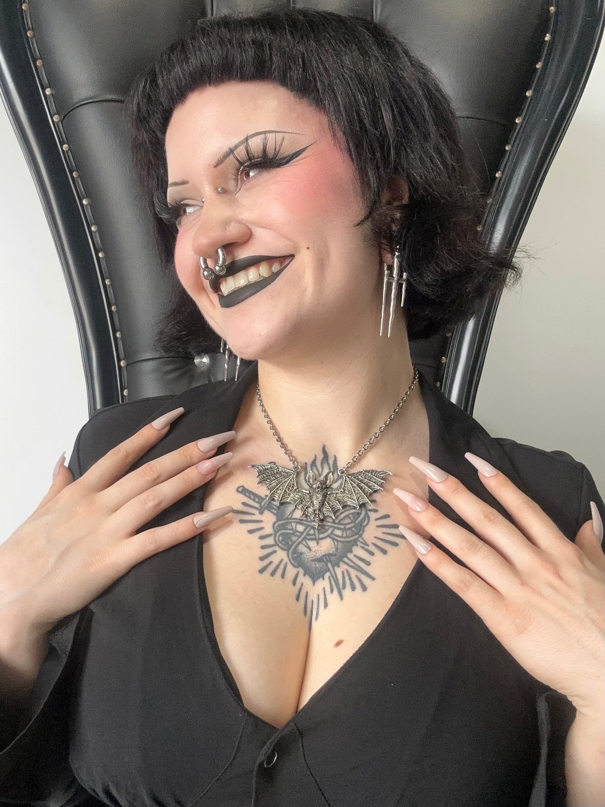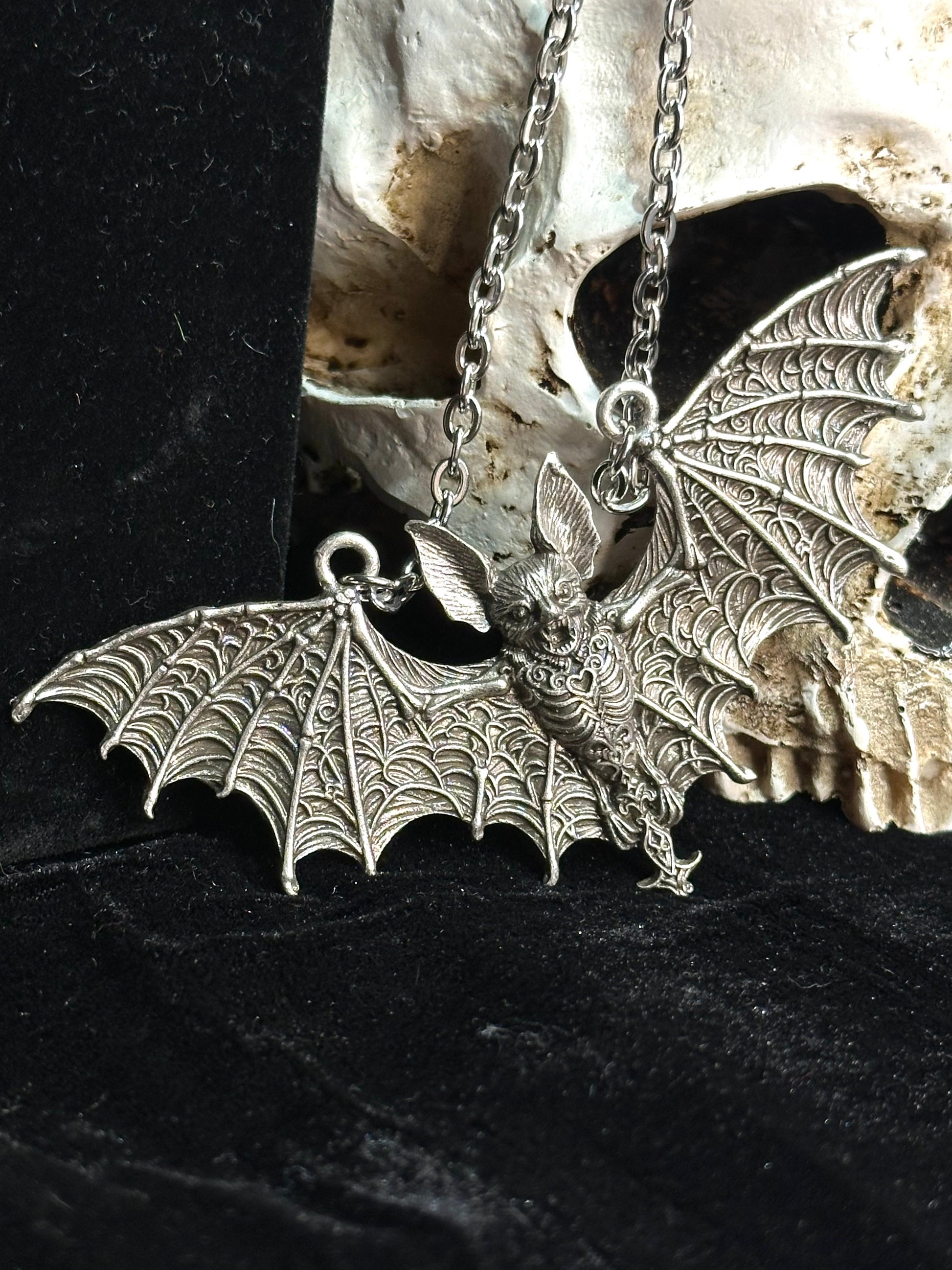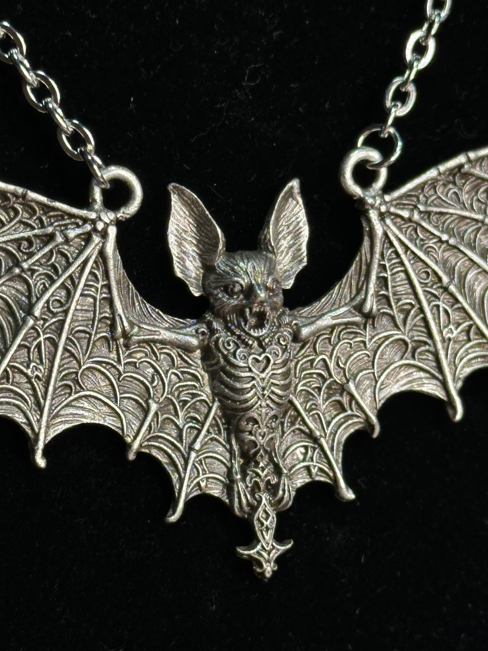 Elaborate bat pendant with fine, engraved and cast details. This sky puppies outstretched wings are the perfect addition to your spooky outfit.