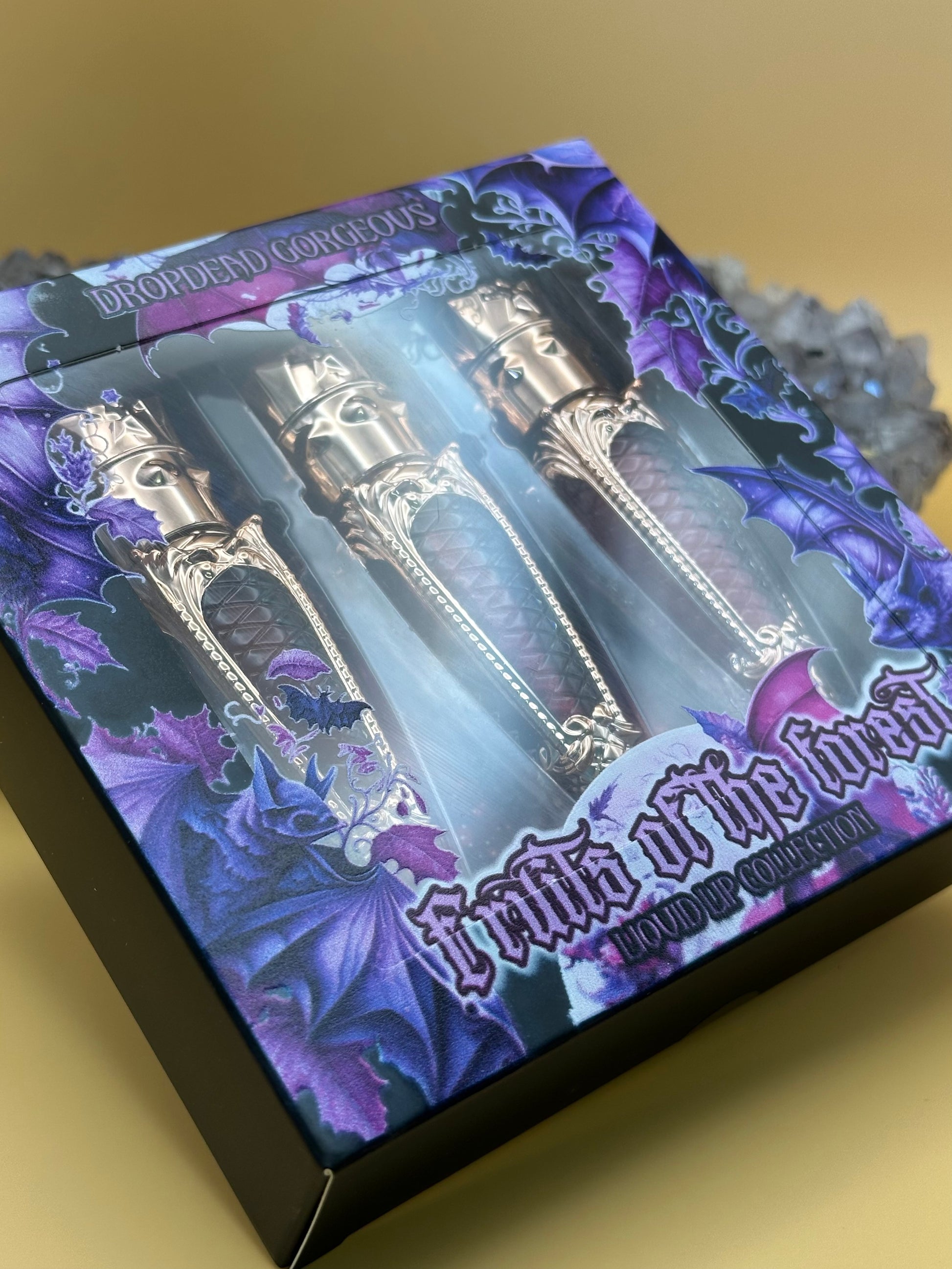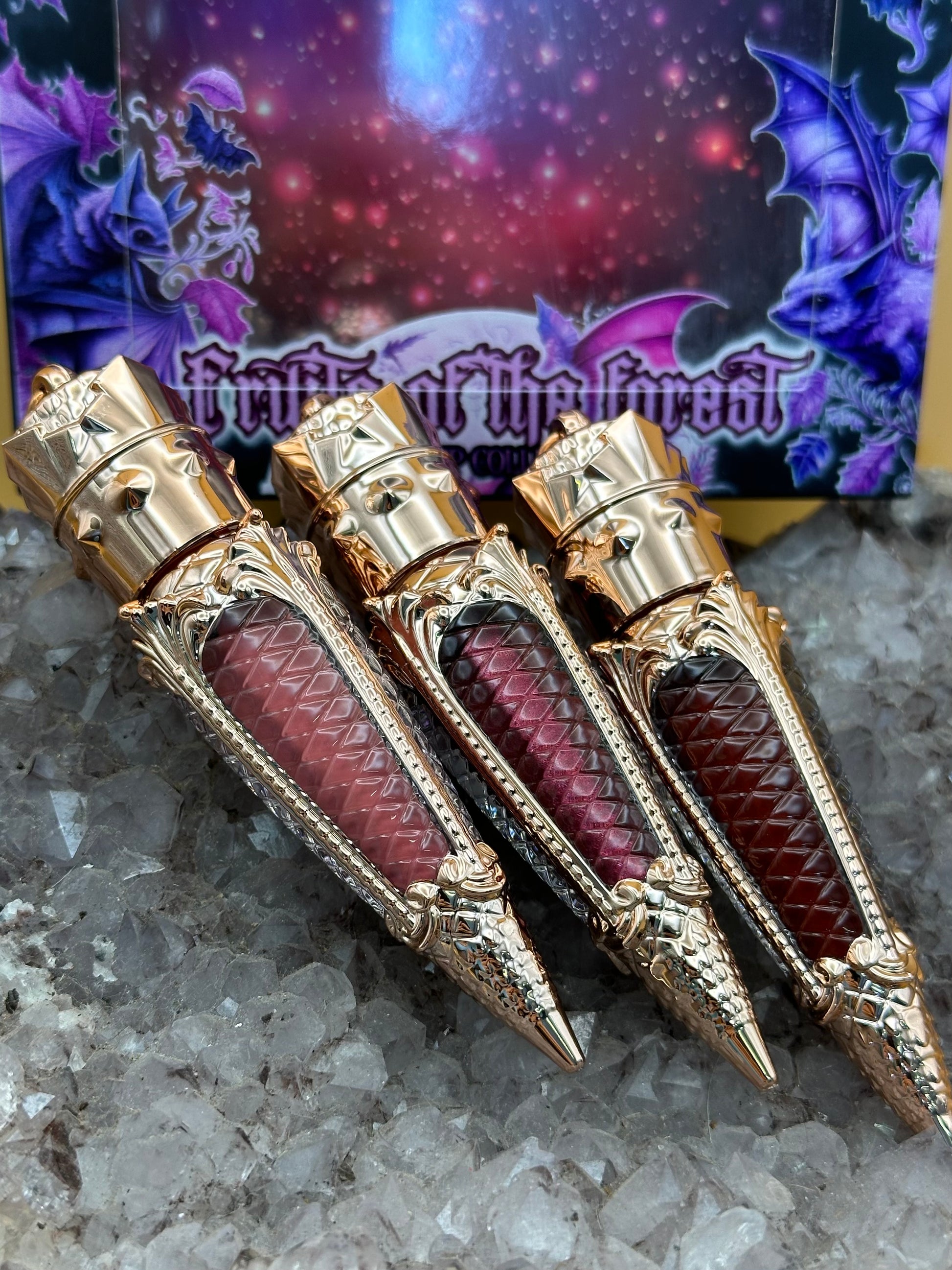 Introducing Fruits of the Forest, a trio of matte lipsticks with dark berry inspired colors that will transport you to a world of mystery and intrigue. These lipsticks are perfect for those who dare to embrace their dark side and crave a touch of the unknown. With their rich and velvety texture, they will leave your lips feeling soft and supple, while their deep and alluring hues will leave a lasting impression. Shop now and discover the magic that awaits.