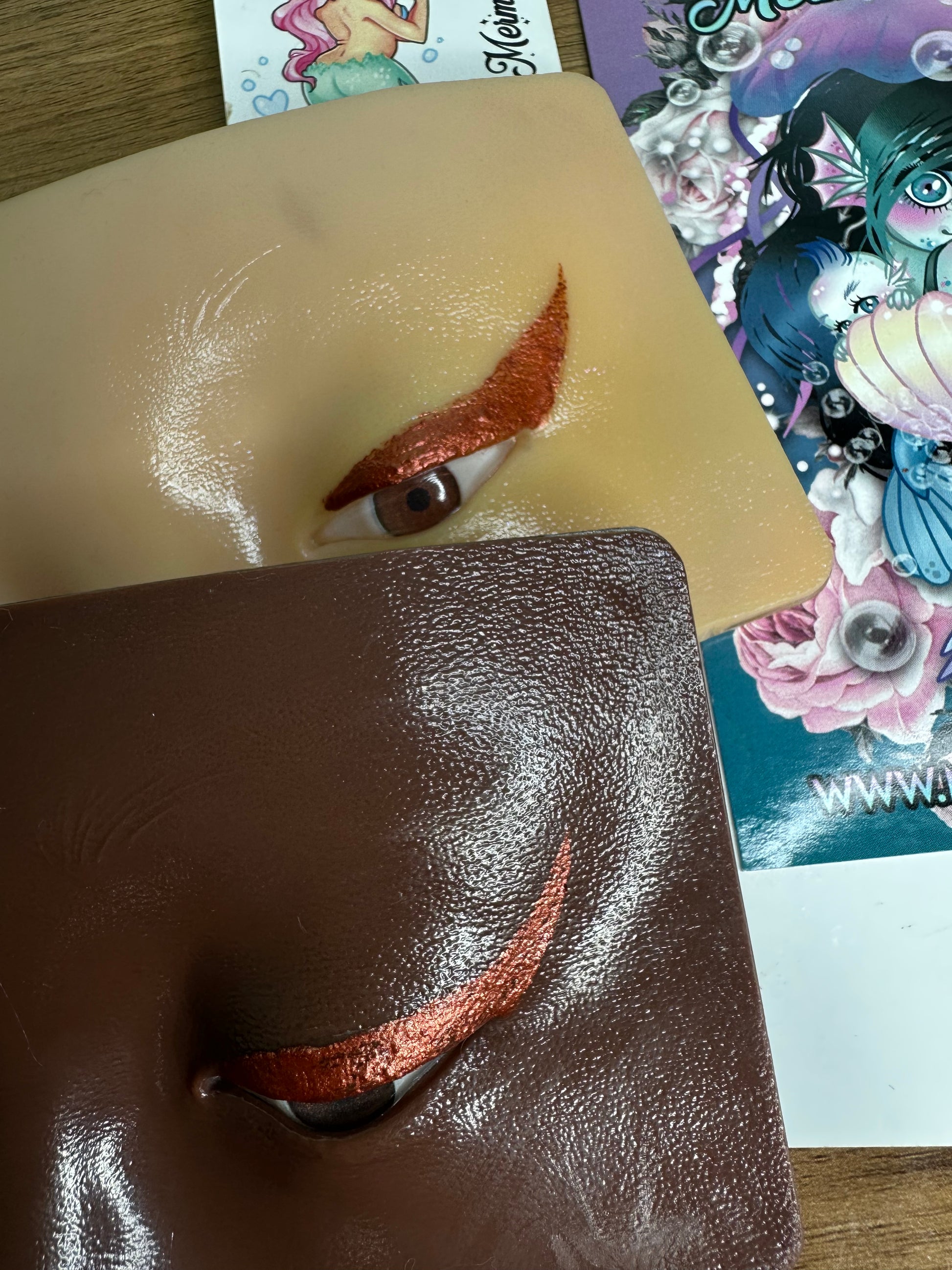 Use a wet brush of desired size to mix water with the pigment cake to produce a creamy that is ready to apply! It can be used on your eyelid as a liner or as a faceaint.