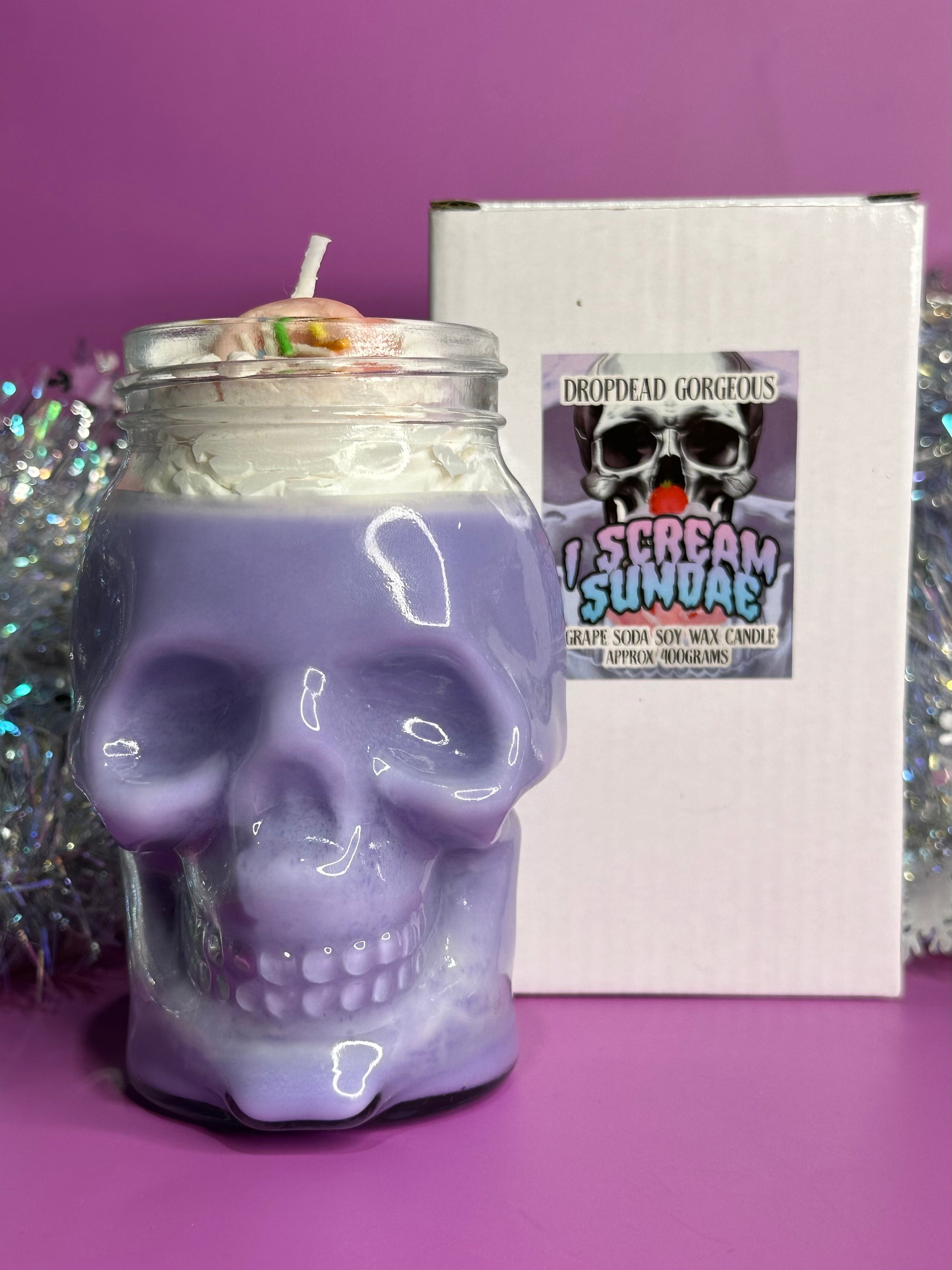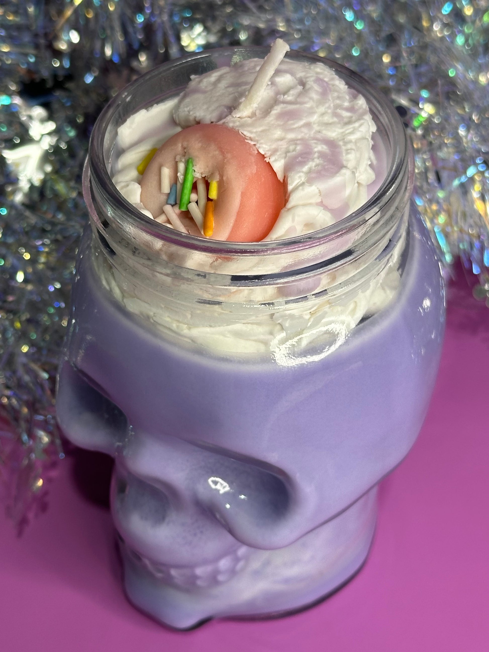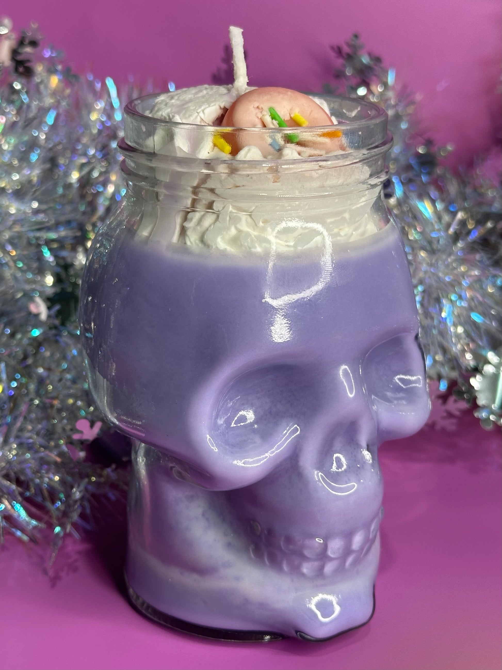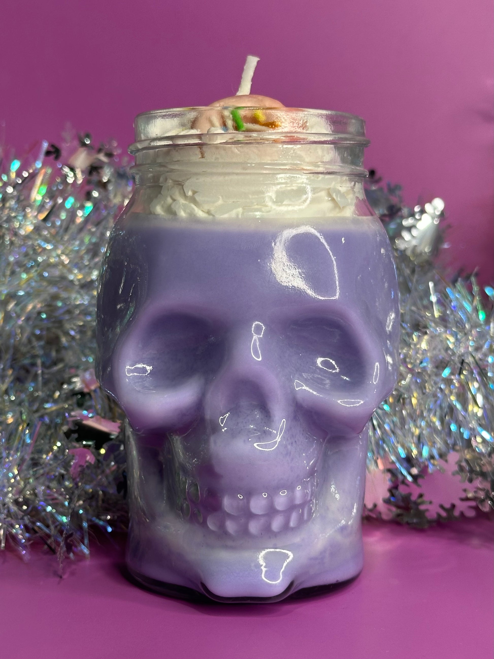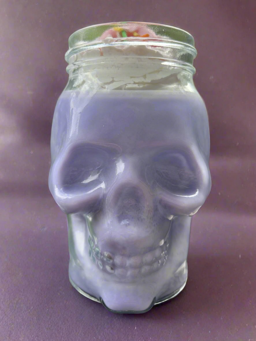 This beautiful hand poured candle is 100% soy wax, topped with faux soy wax cream, in a glass, skull shaped, reusable vessel.