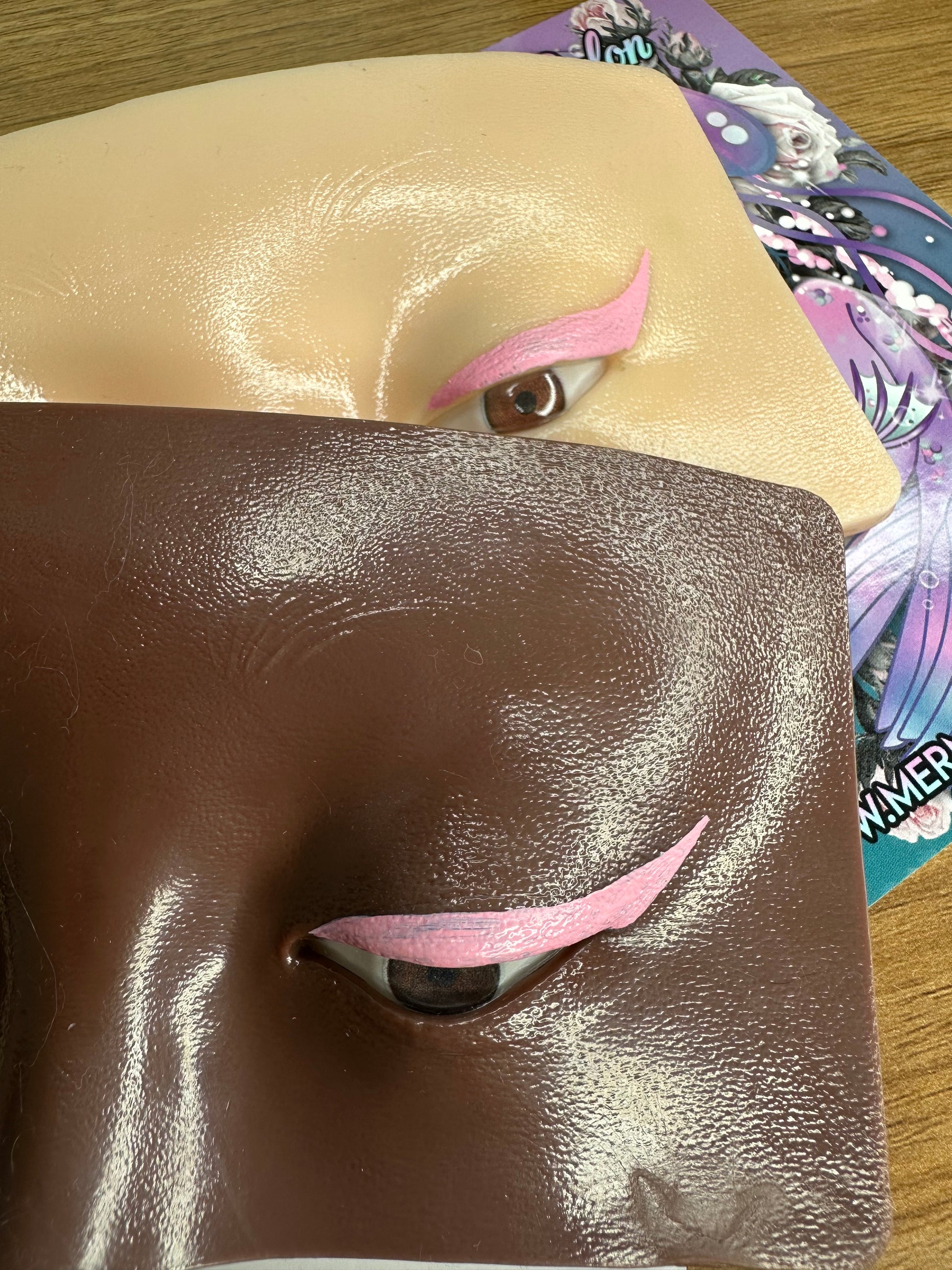 Use a wet brush of desired size to mix water with the pigment cake to produce a creamy that is ready to apply! It can be used on your eyelid as a liner or as a faceaint.