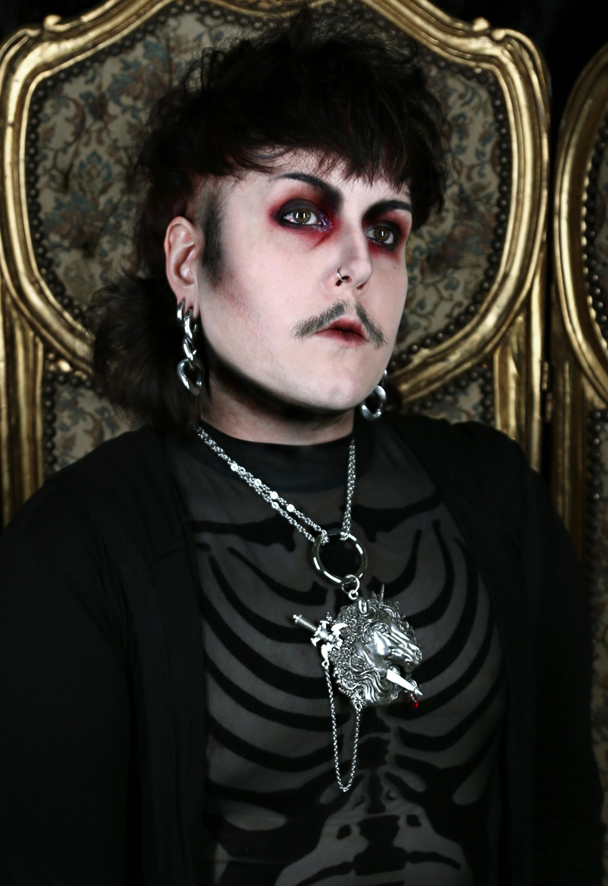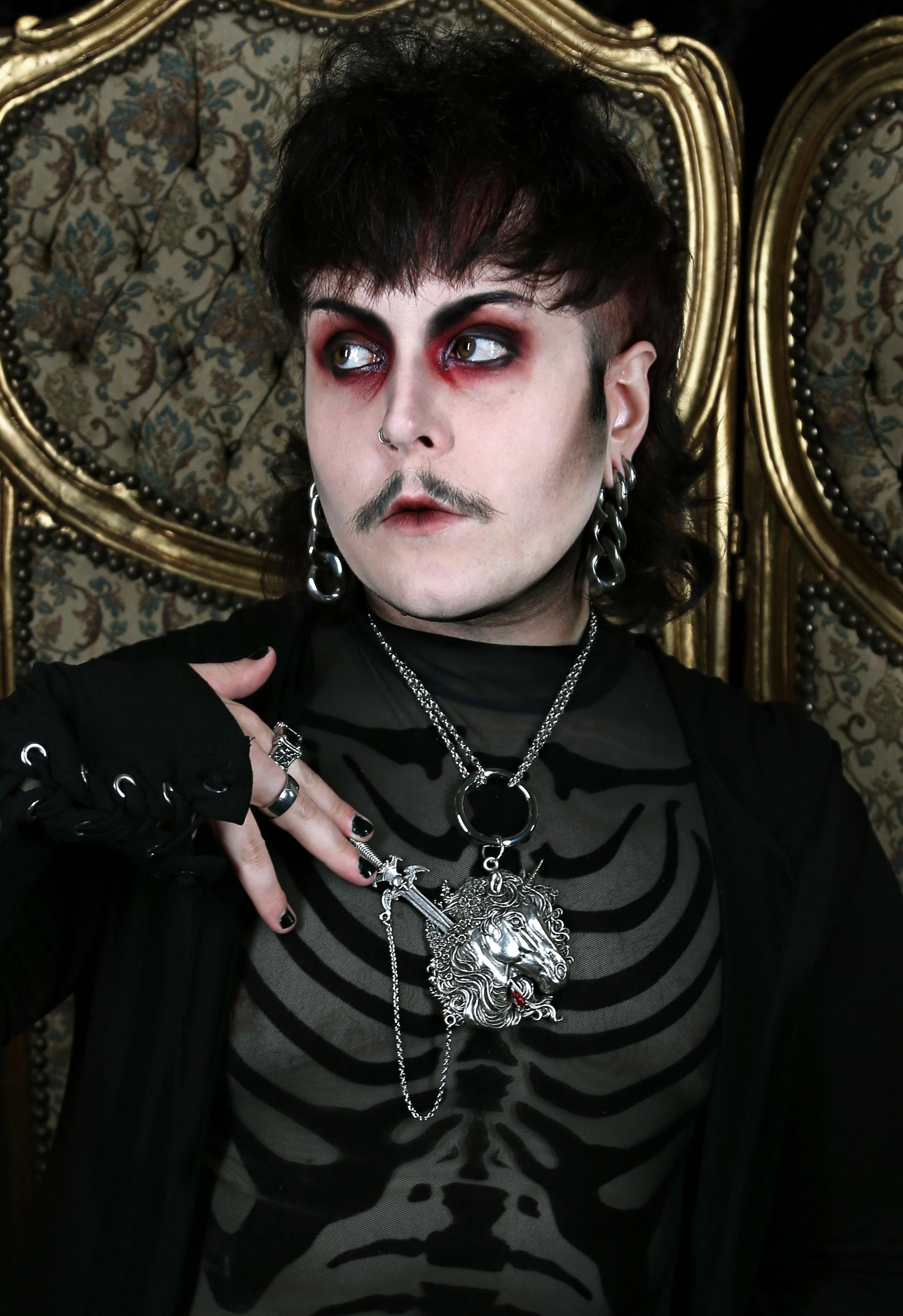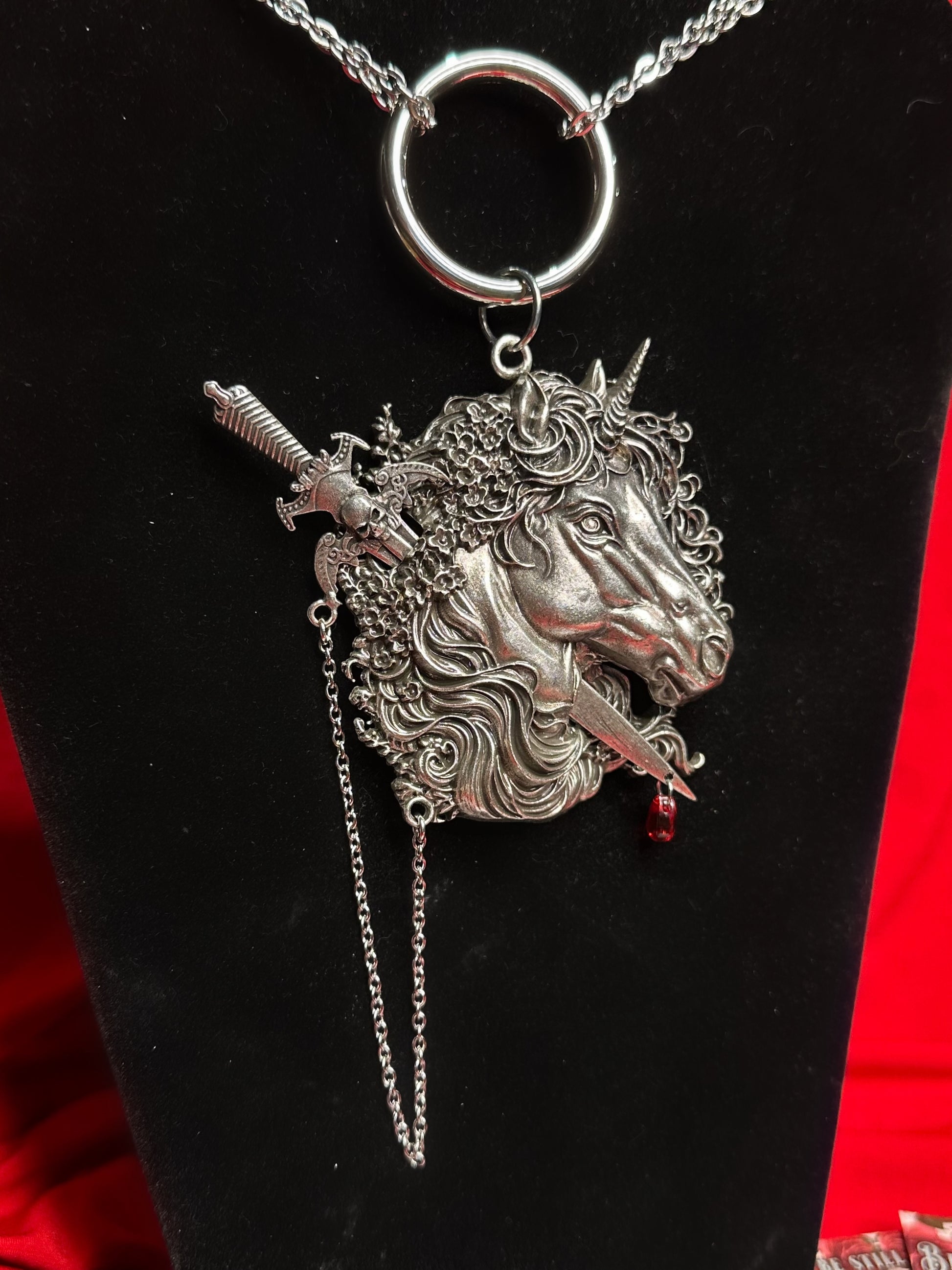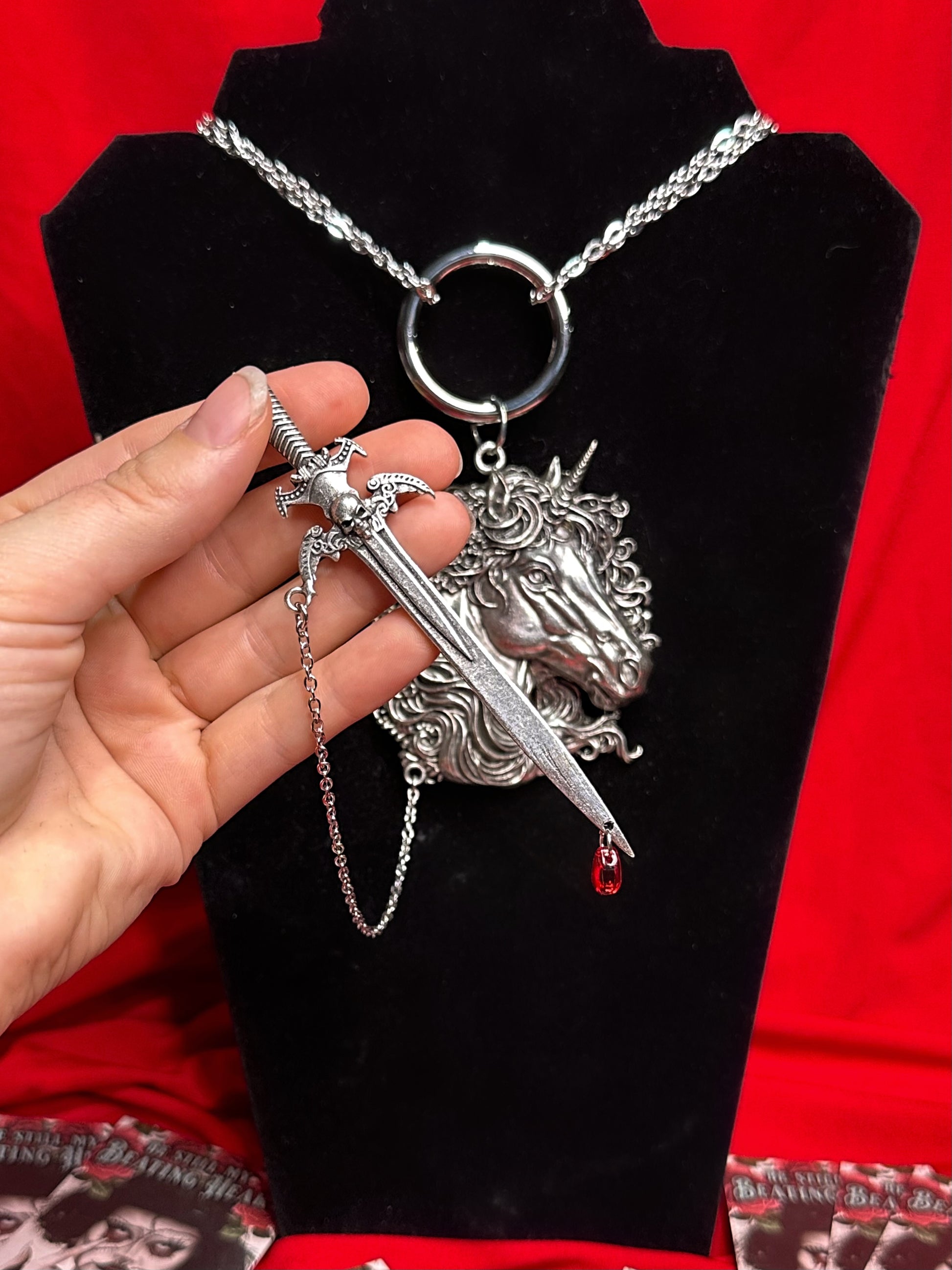 Dark, magical and malevolent. Our unicorn Blood necklace features a unicorn head with removable sword with a resin "blood droplet" fixed to the end. Truly unique in every way and an iconic statement piece for goths, goblins and Fae Alike.