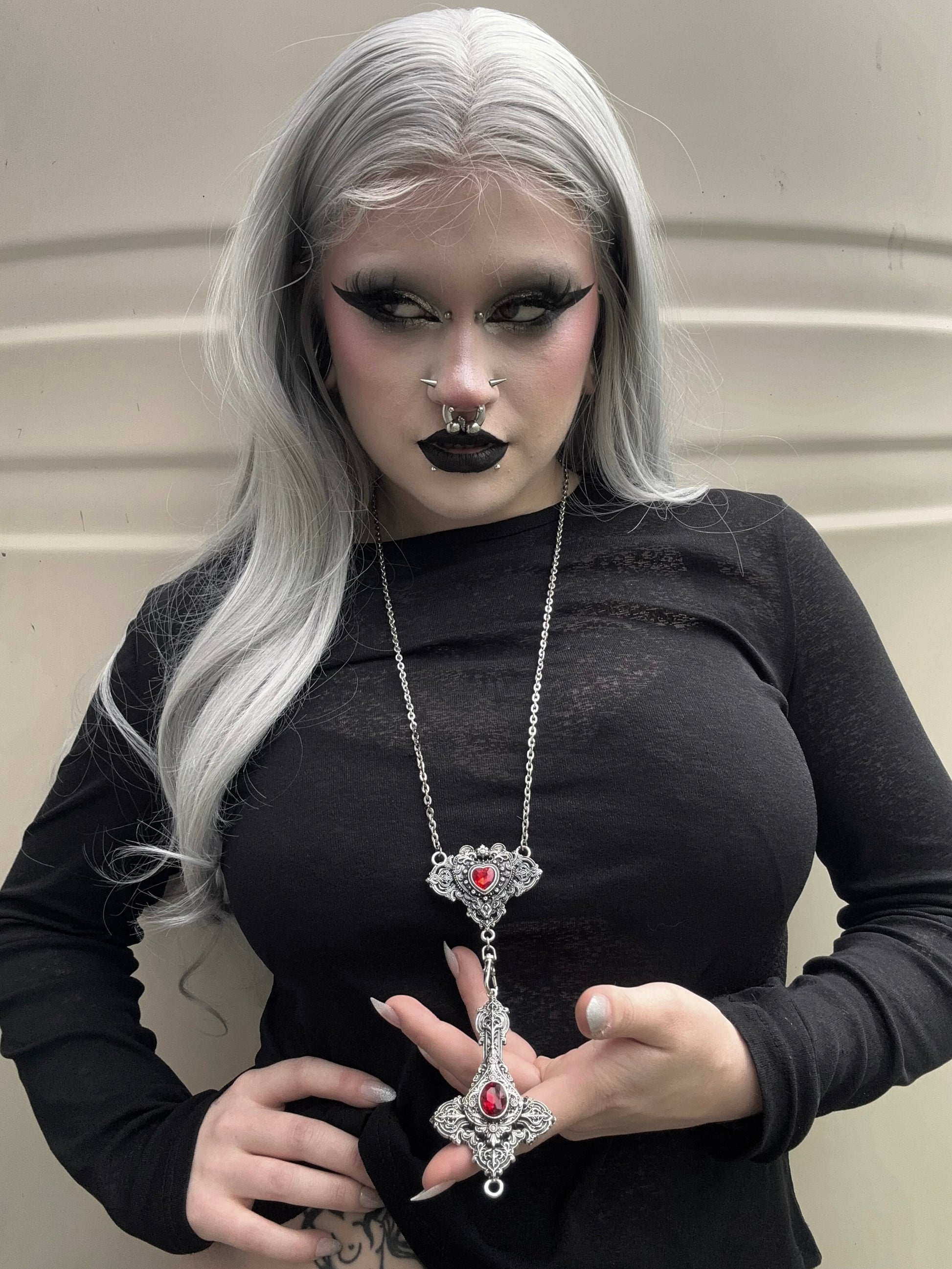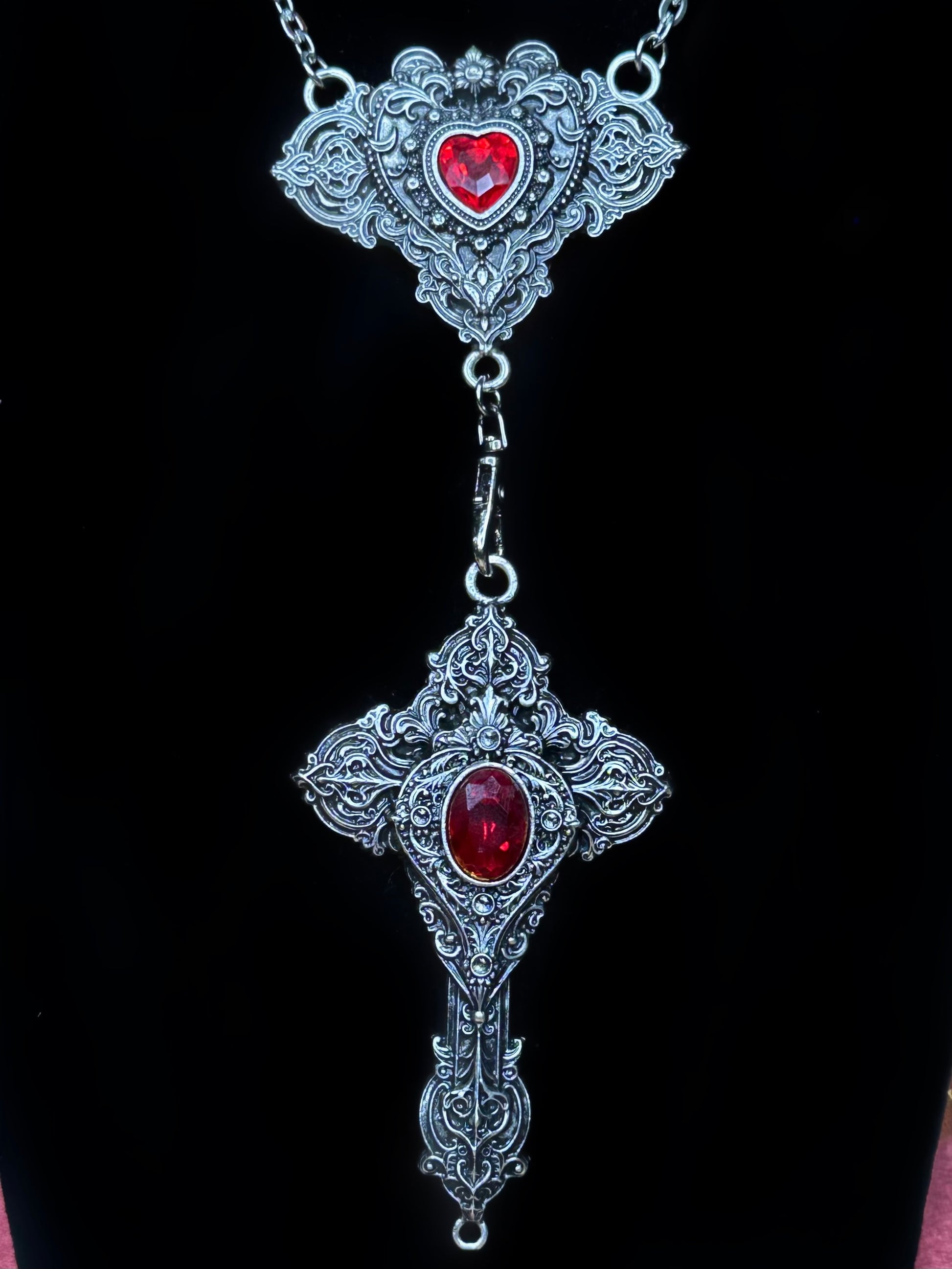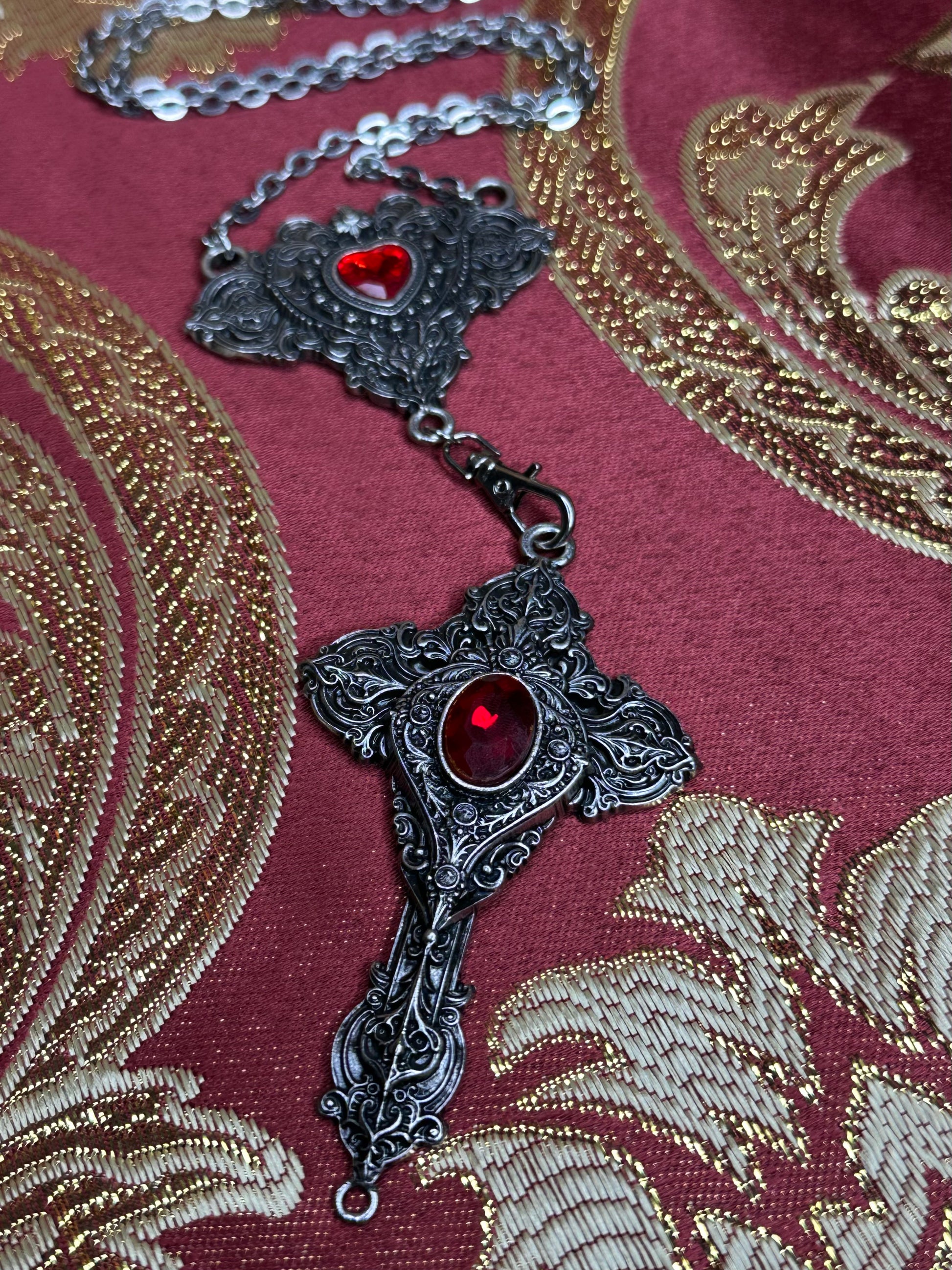 Mother of Hades rosary returns, but in a newer & unique form. Cross My Heart is an interactive piece that allows those who wear it to express their real selves. With the help of a lobster clasp, the cross is reversible and can be worn 2 ways. Centred in each pendant features 2 pieces of red glass surrounded by endless detail. Metals used are zinc alloy & stainless steel.