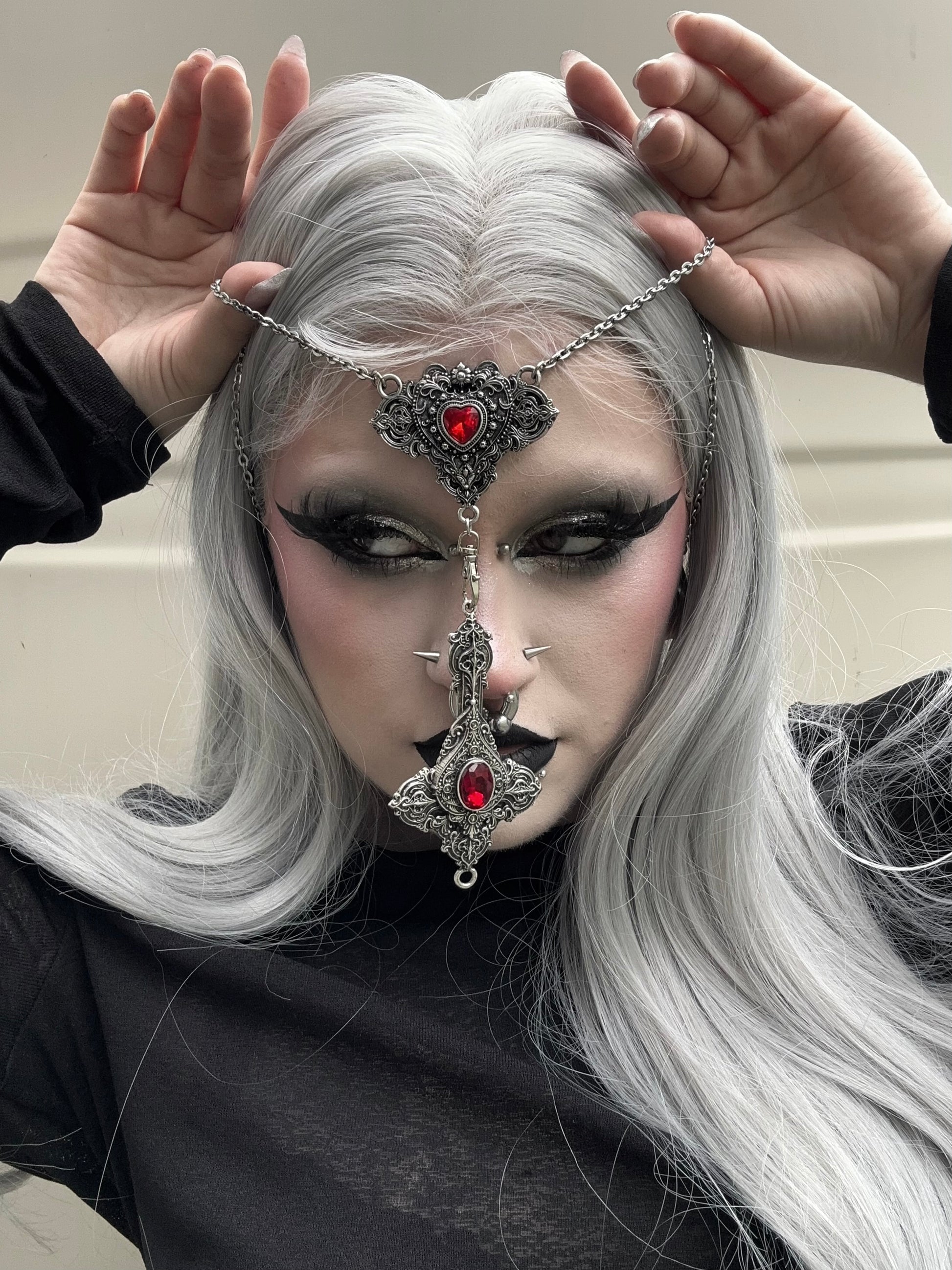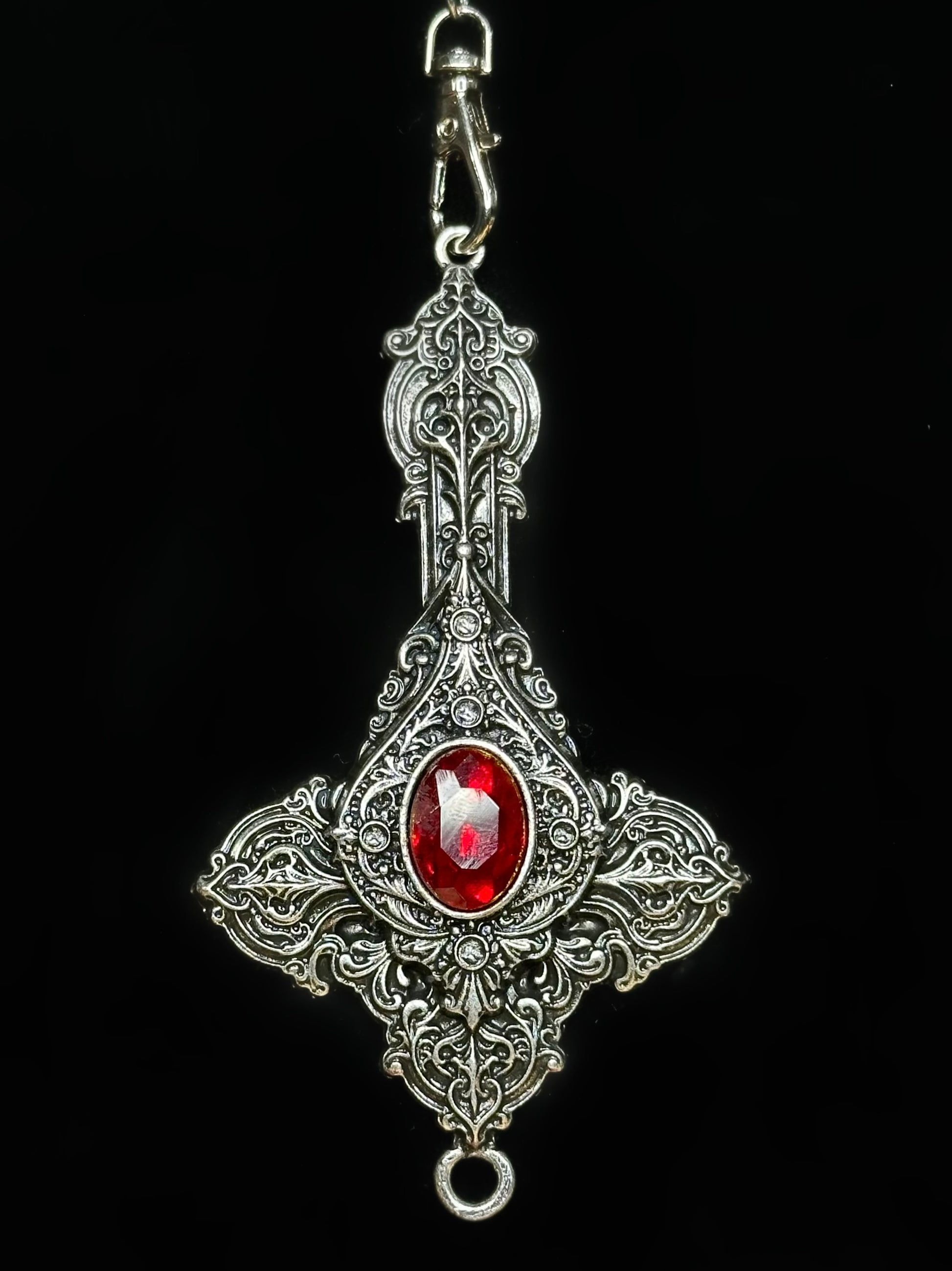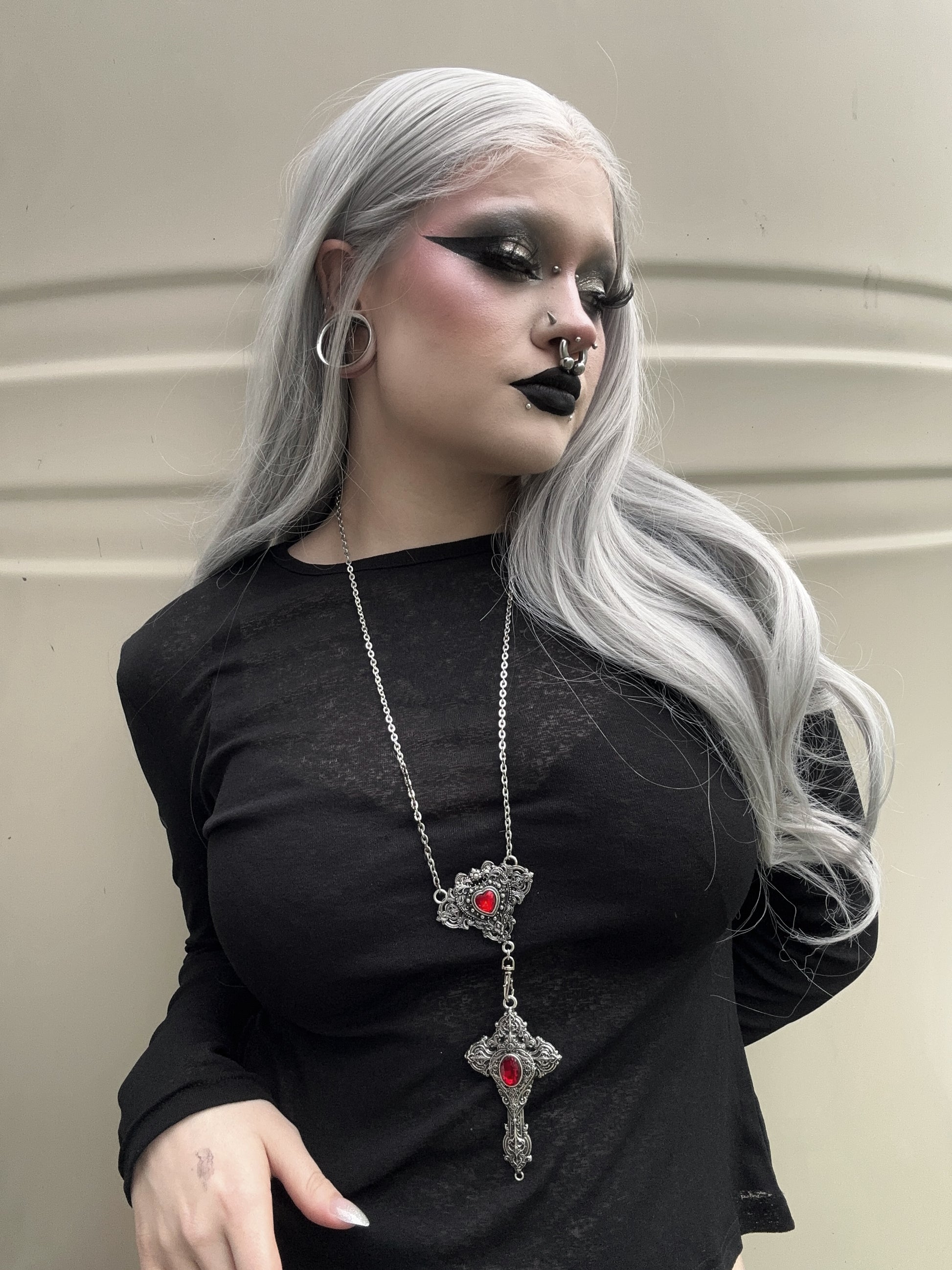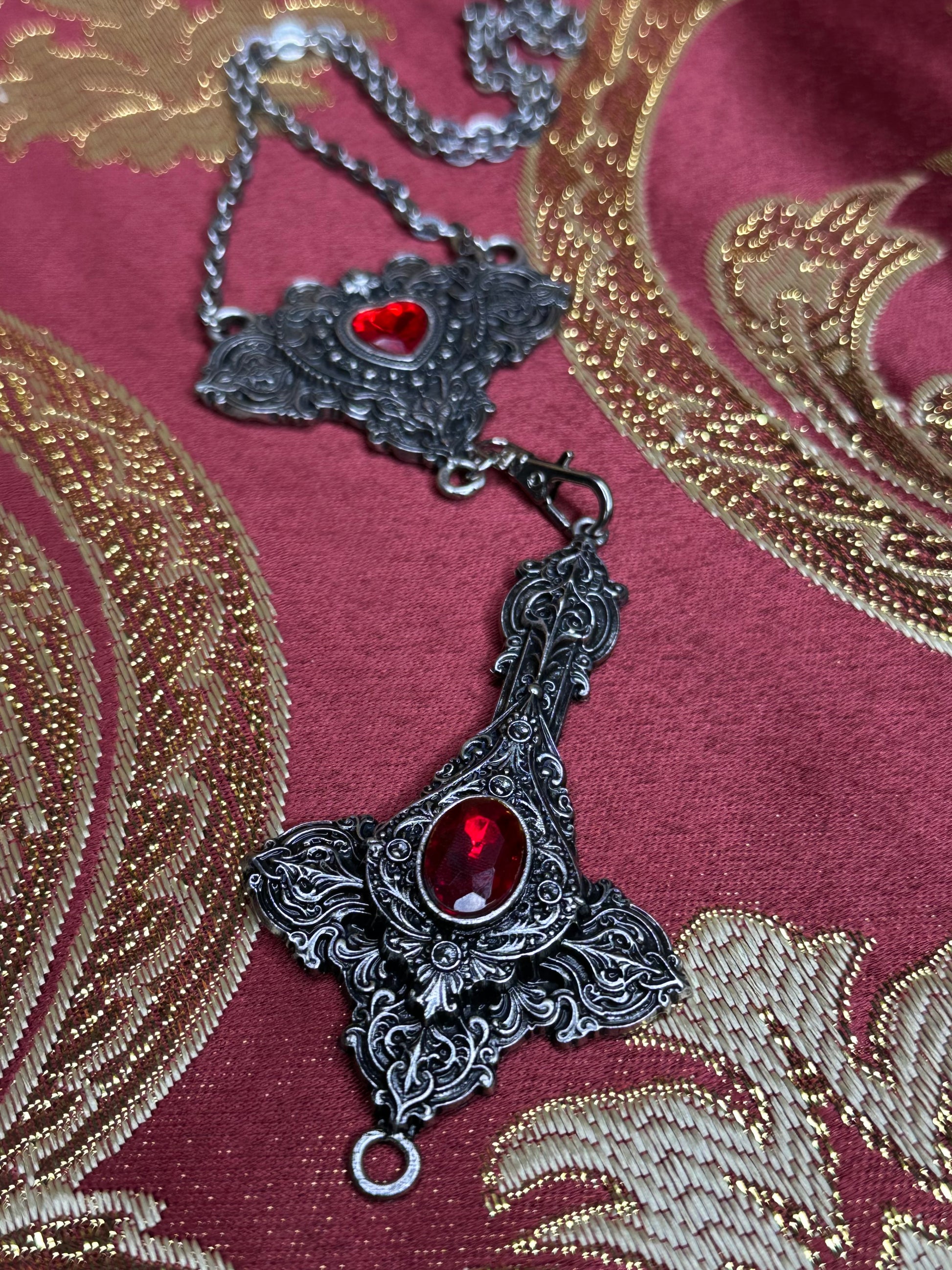 Mother of Hades rosary returns, but in a newer & unique form. Cross My Heart is an interactive piece that allows those who wear it to express their real selves. With the help of a lobster clasp, the cross is reversible and can be worn 2 ways. Centred in each pendant features 2 pieces of red glass surrounded by endless detail. Metals used are zinc alloy & stainless steel.