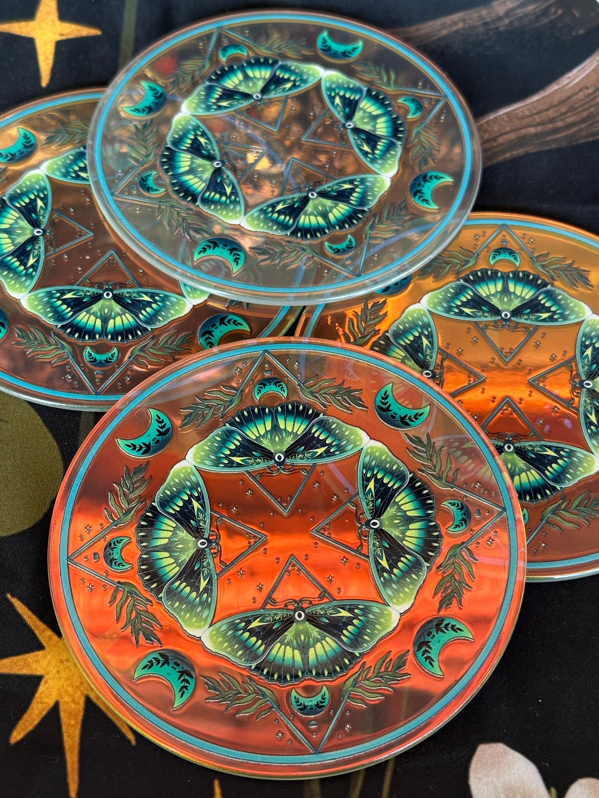 Add a touch of futuristic flora & fauna with these gorgeous holographic butterfly coasters. Featuring a multi-colour holographic base and kaleidoscopic design of butterflies & moons; these sleek coasters are the perfect feature for your dining room, kitchen or bar!