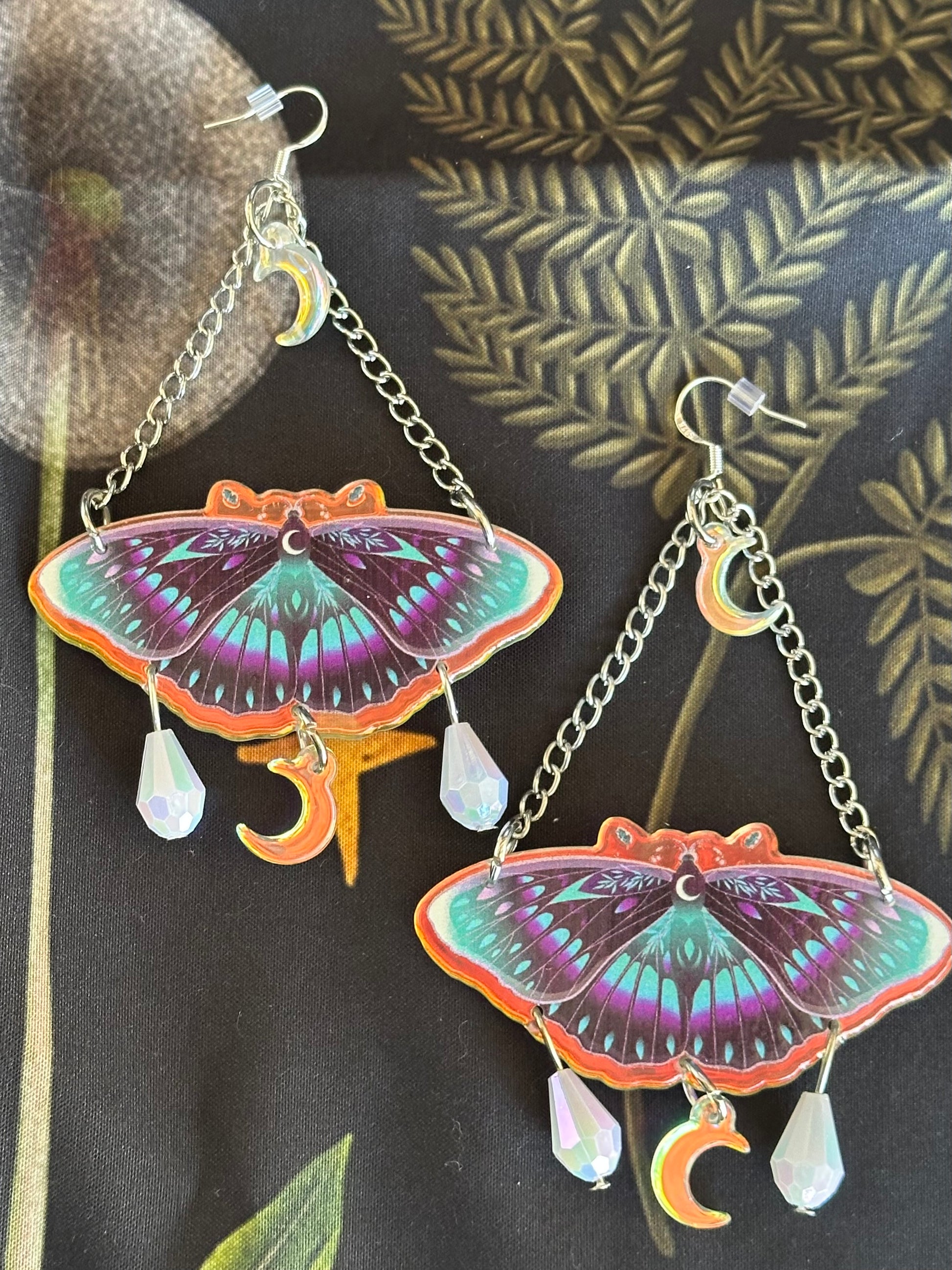 Find yourself being the flutter about town in these La Bella Luna Dew Drop Chain Earring. With beautiful hues of blues and purples dancing amongst holographic jewels and crescent moons, these gorgeous earrings will have you feel ever so effervescent.