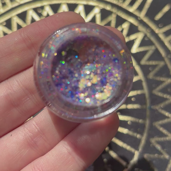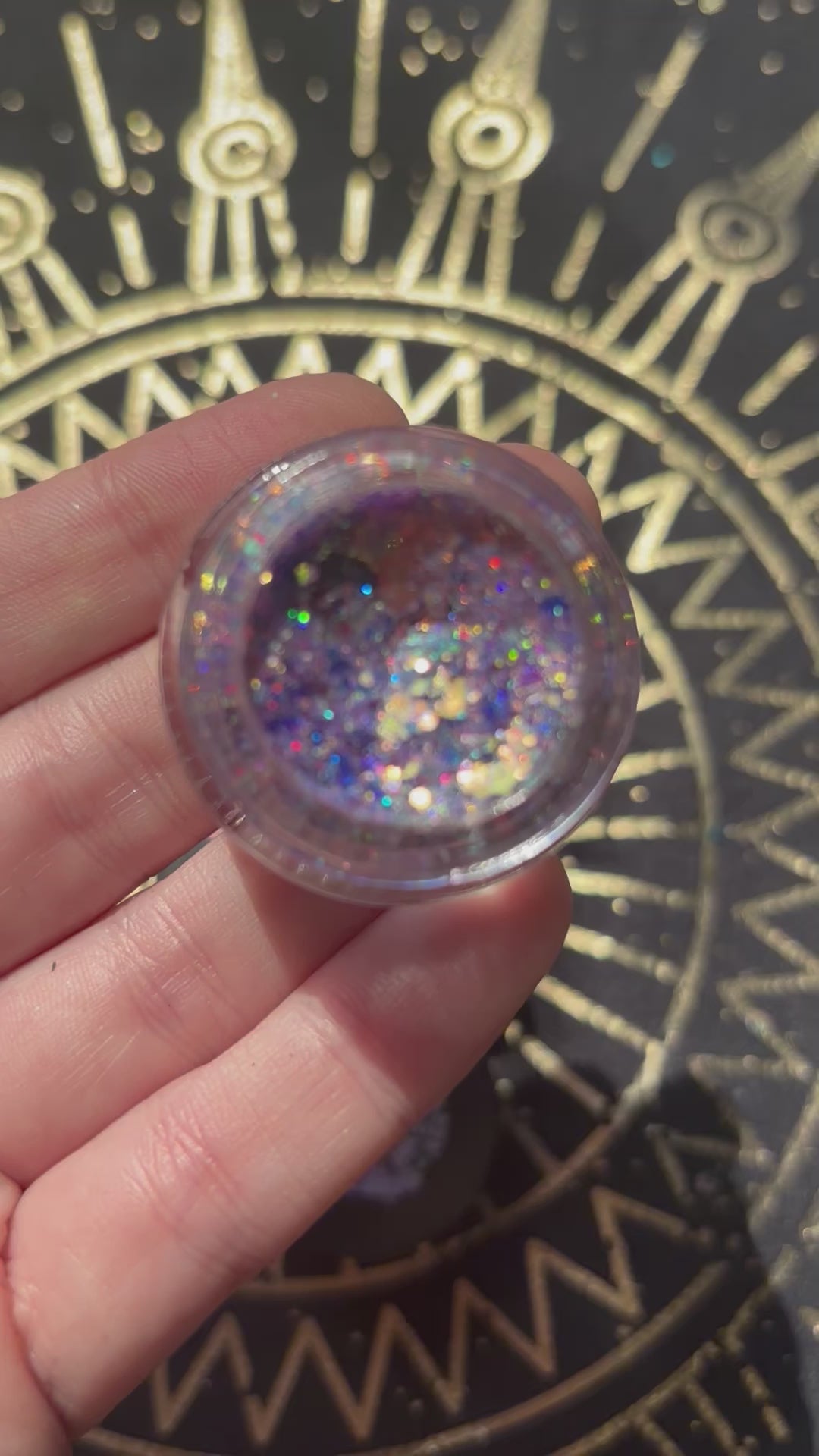 Self adhering mixture of glitter, Mylar and balm to add the perfect pop of ethereal glow.