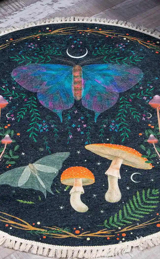 The most magical cottage core rug to ever grace the floors of your haunt. Lunar moths, mushrooms and germs.