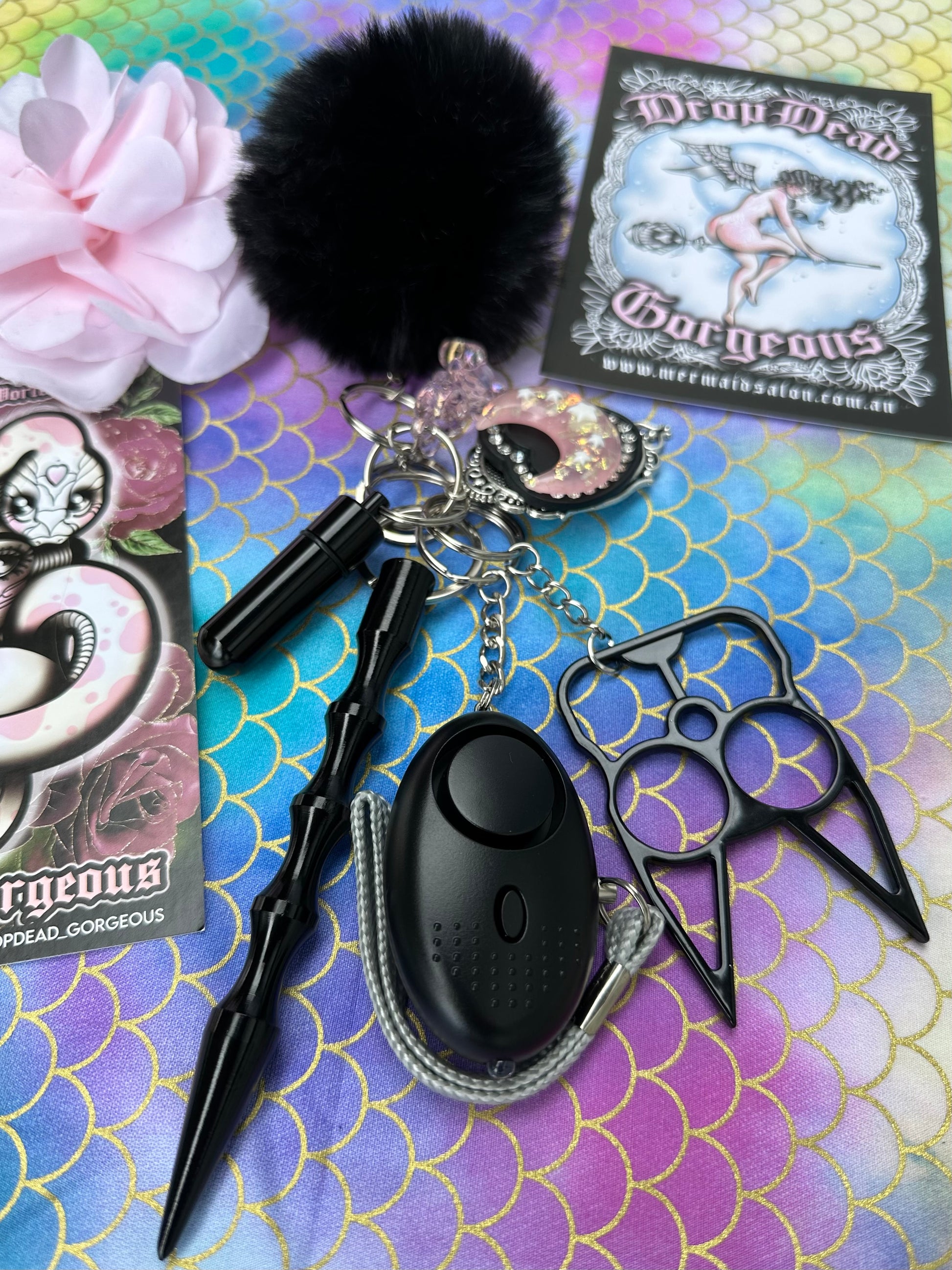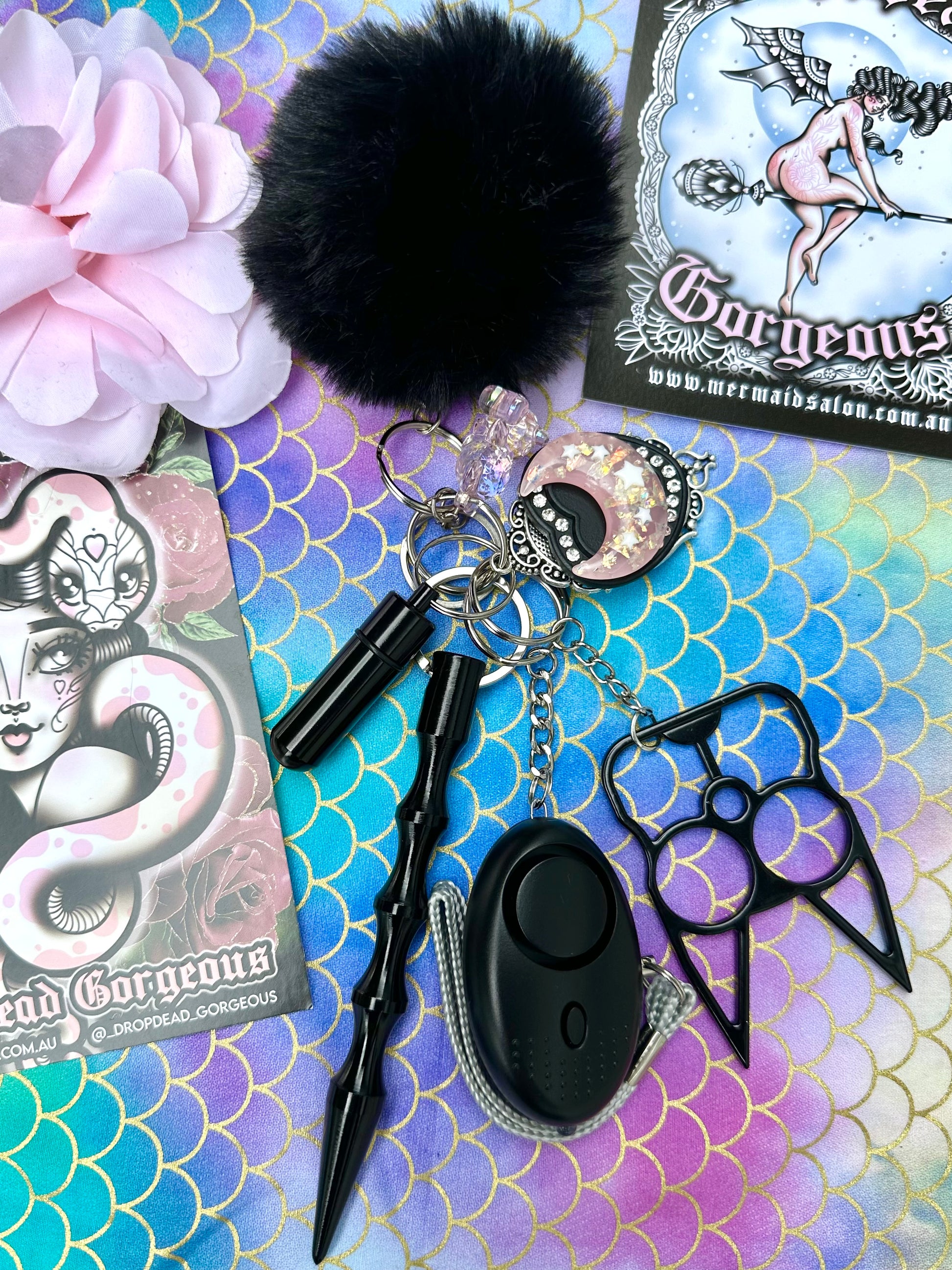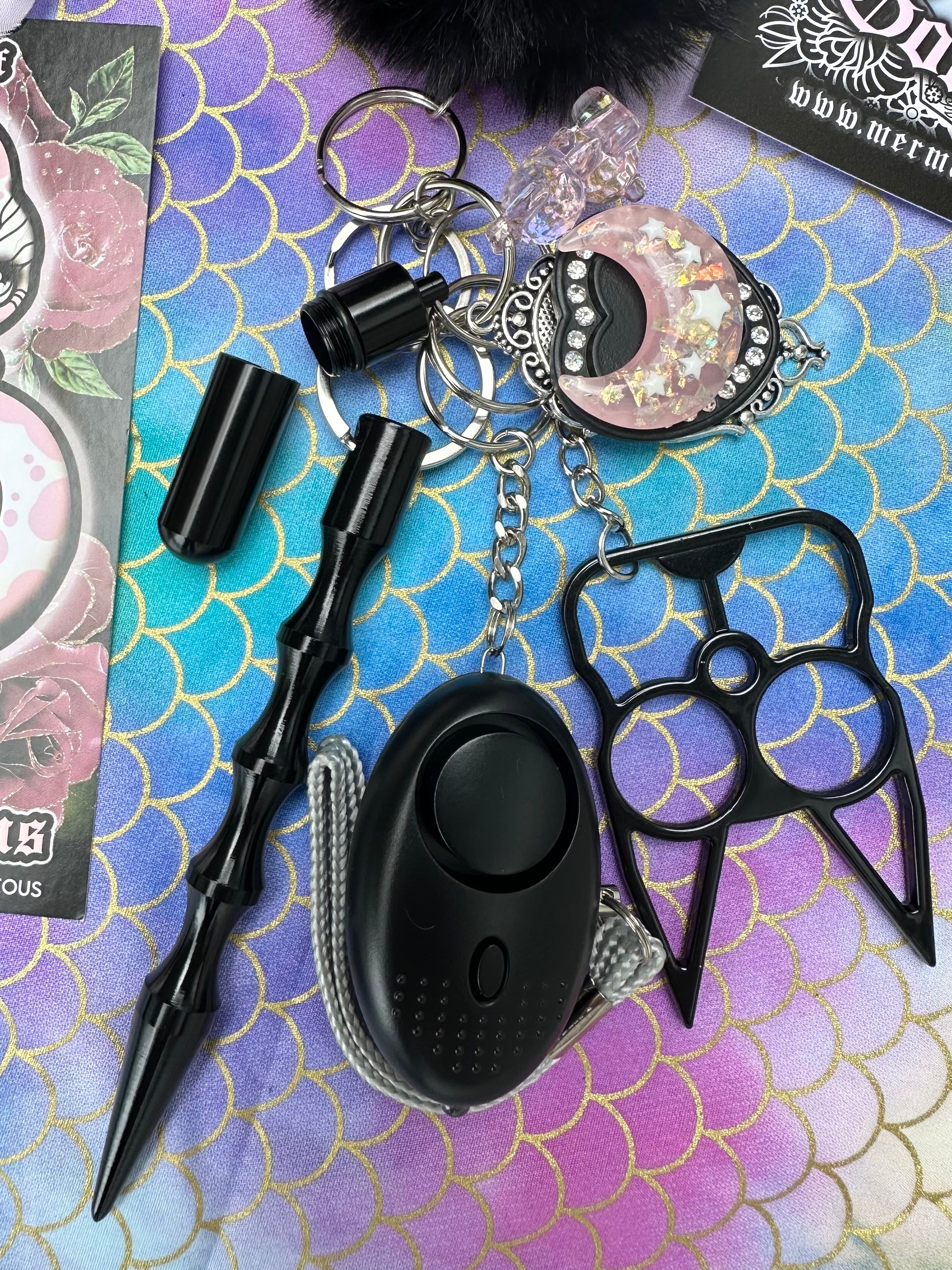 Personal safety keychain equipped with Window breaker, pill container keychain, personal alarm, and a cute lil metal kitty that cares for your safety.Topped with the fluffiest and softest pompom EVER.