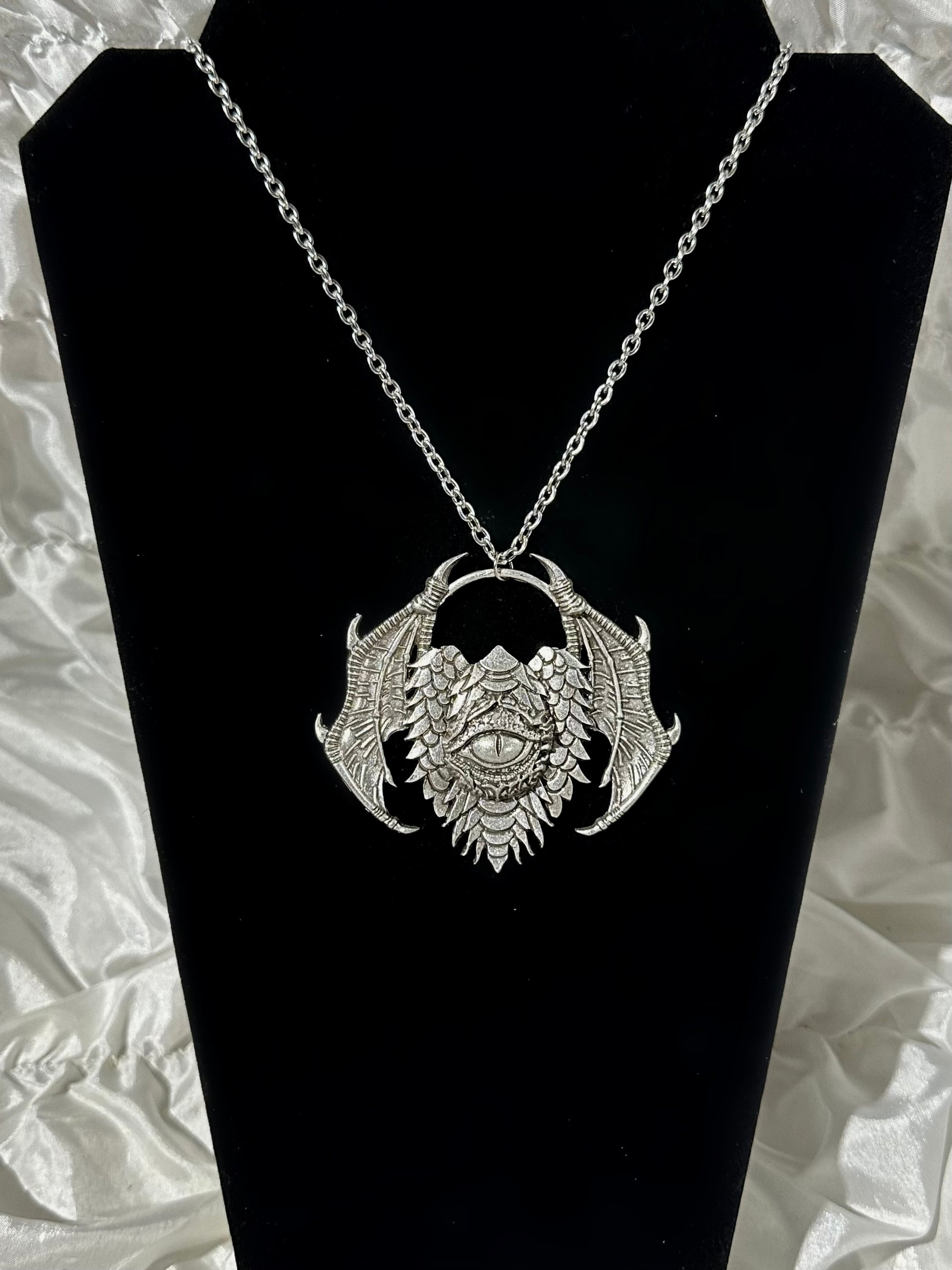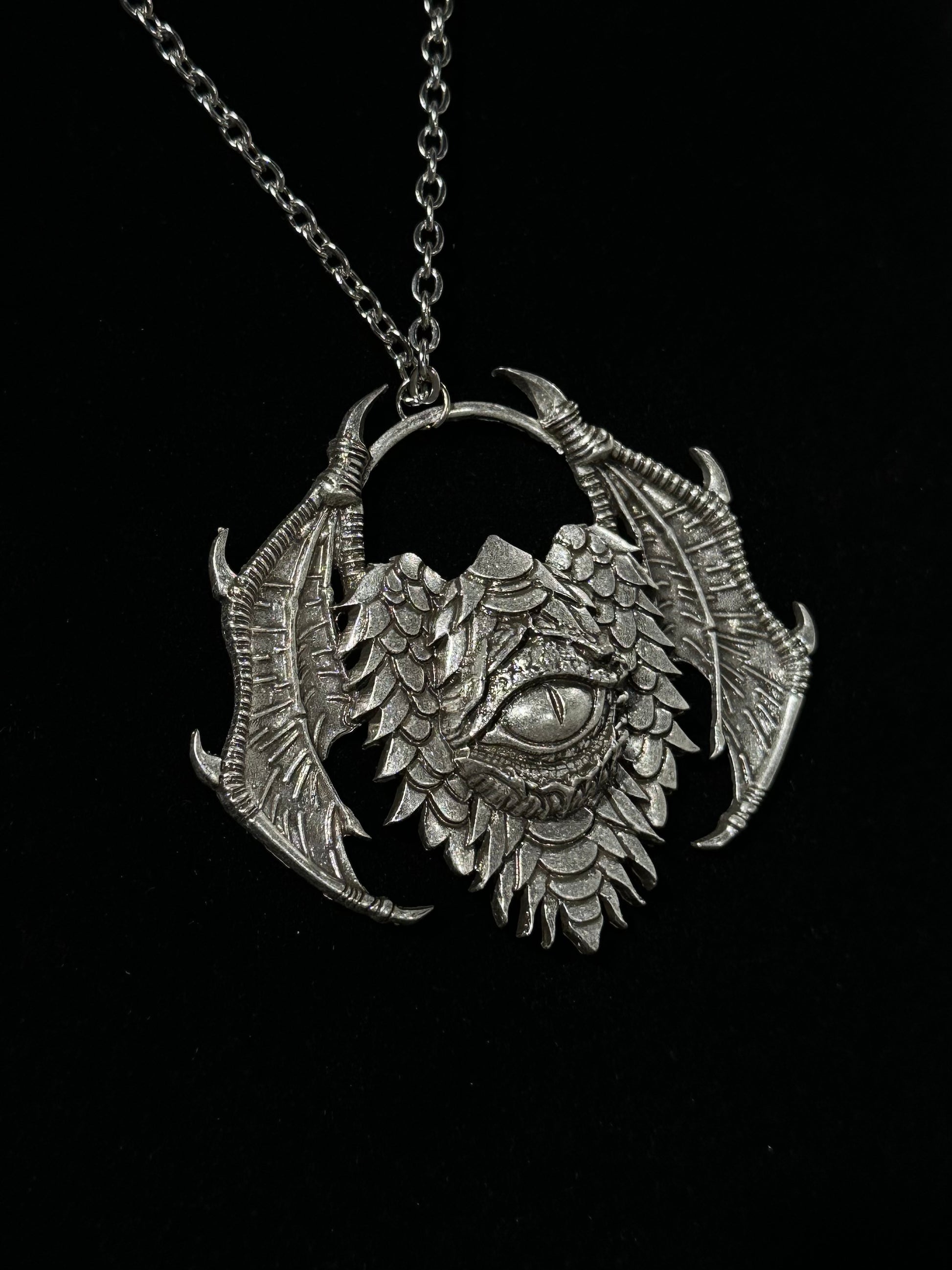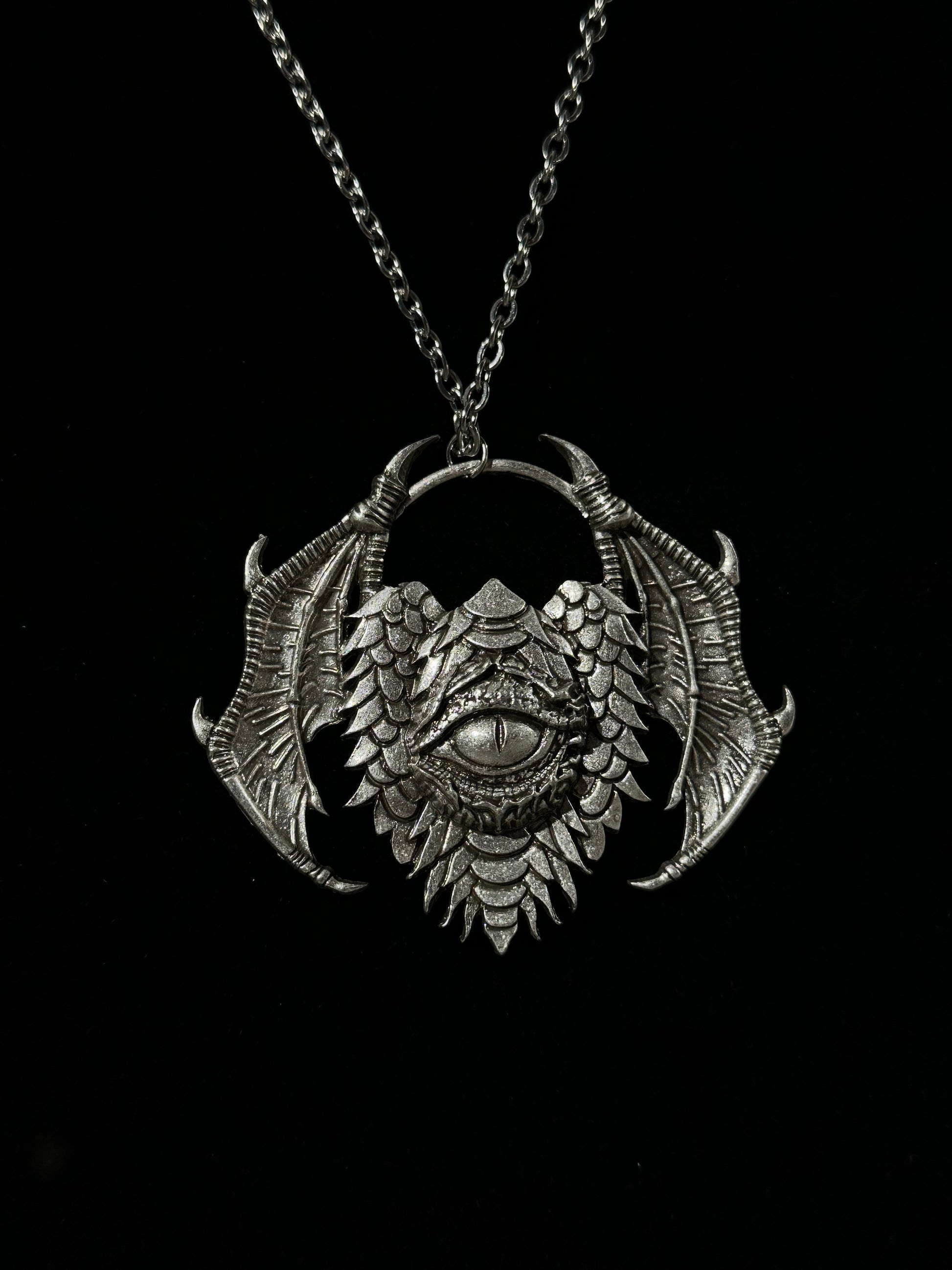 This cast alloy necklace features an ornate dragons eye adorned with brutal spiked wings.