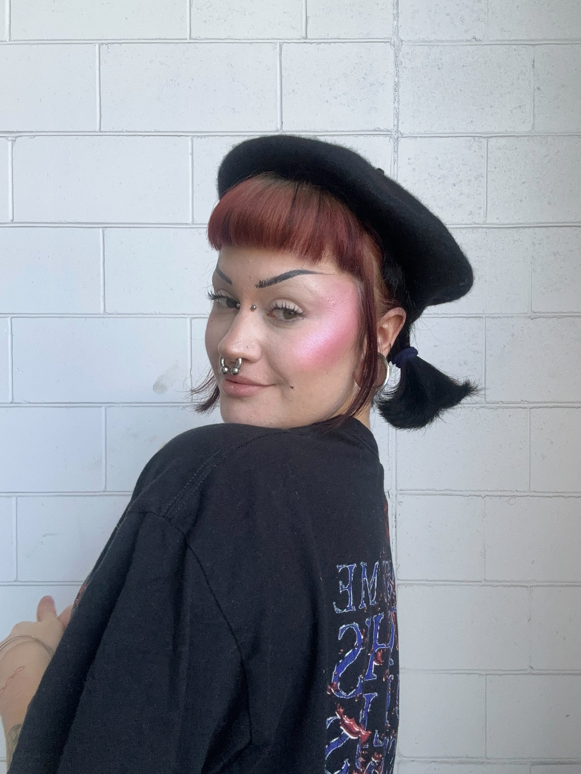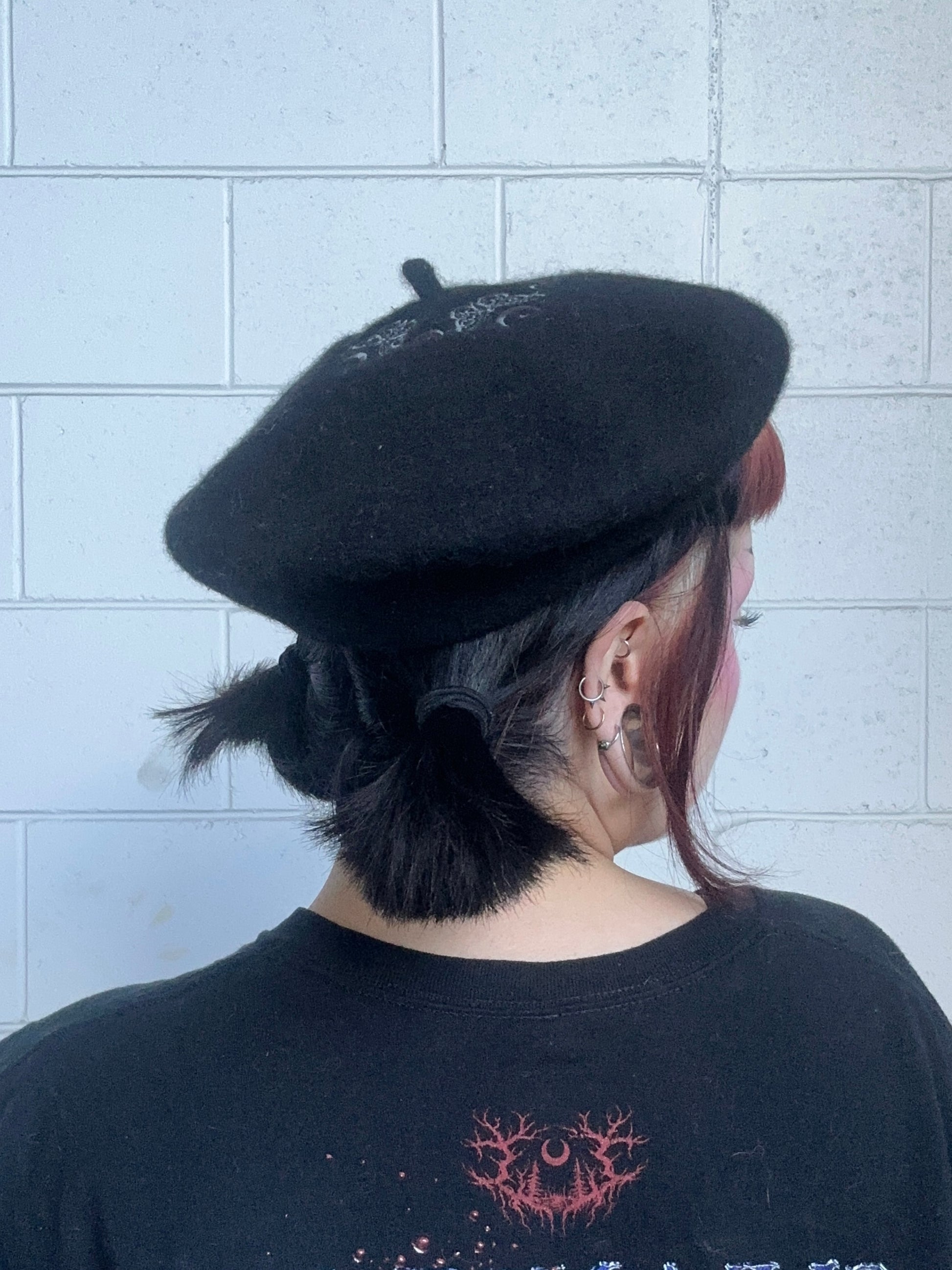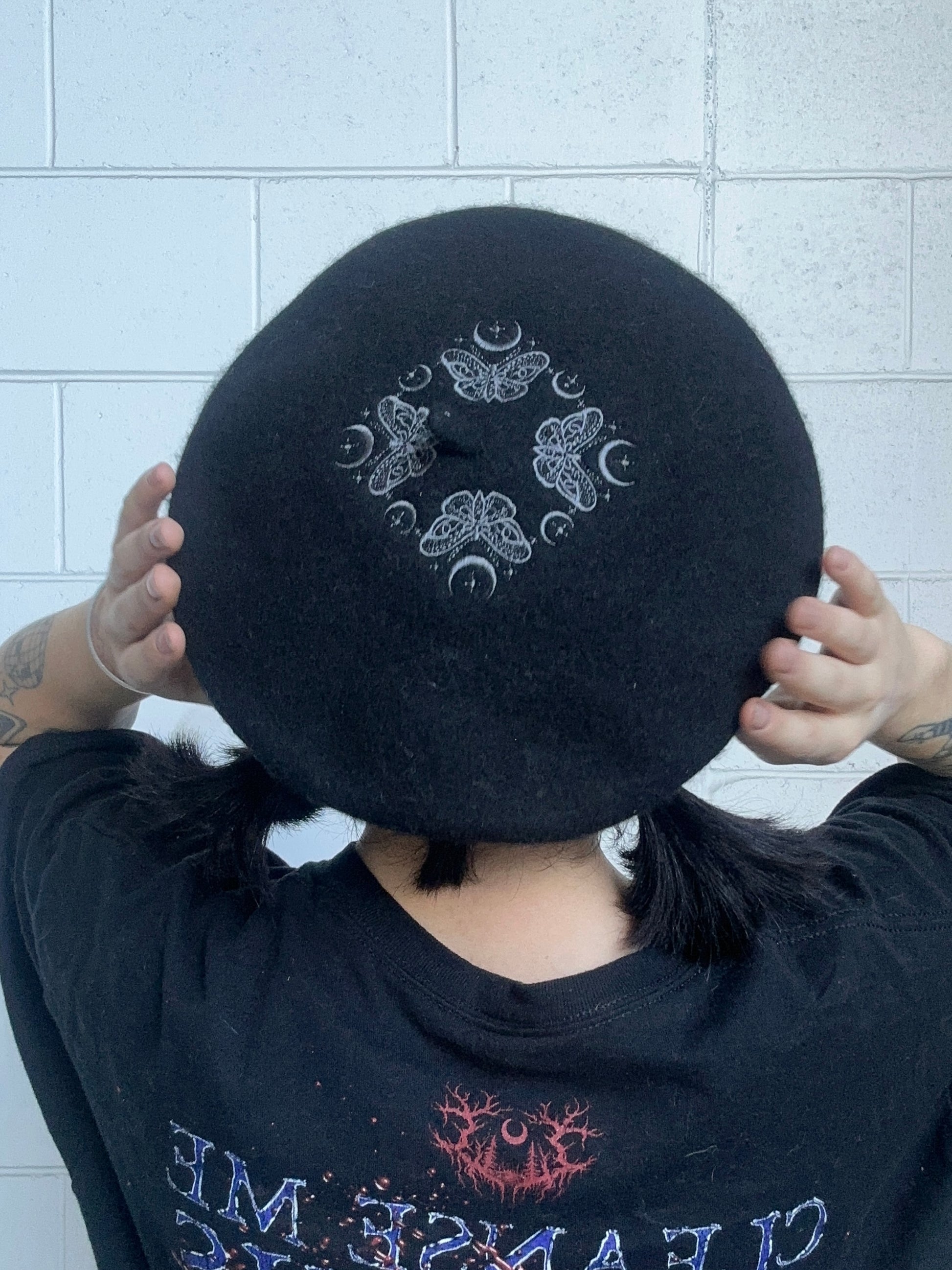 Beautiful moth and crescent moon design embroidered onto a classic style beret.