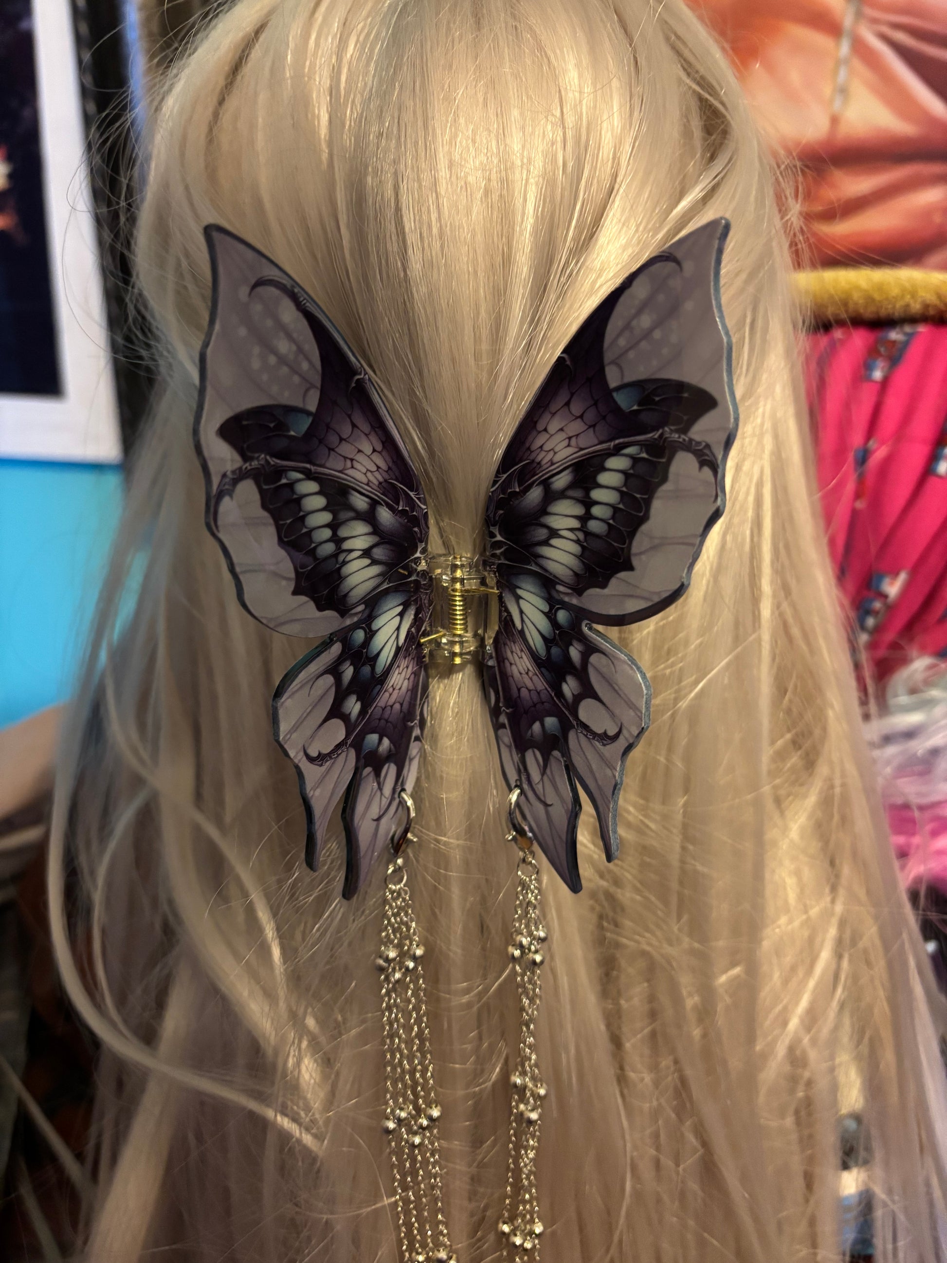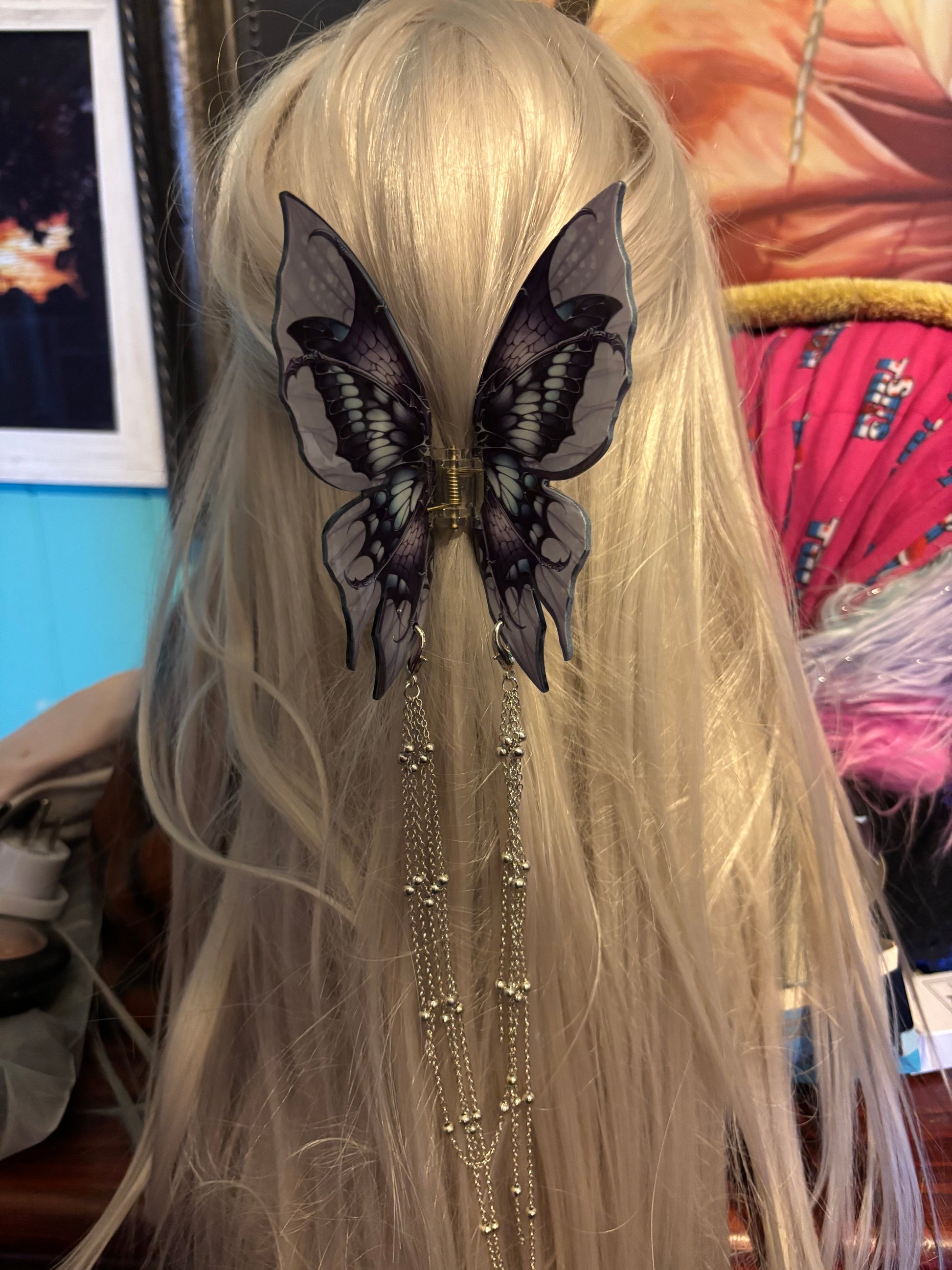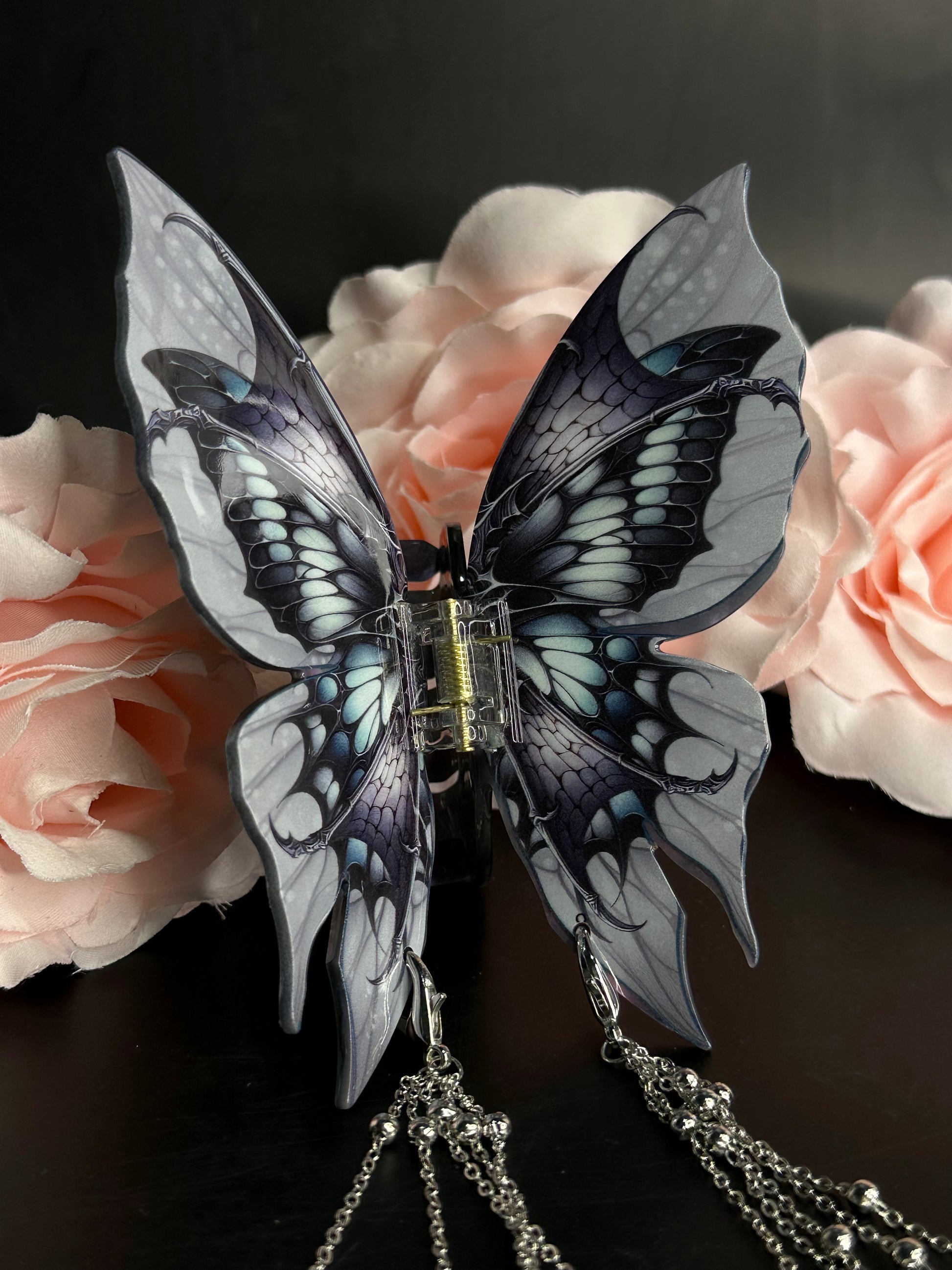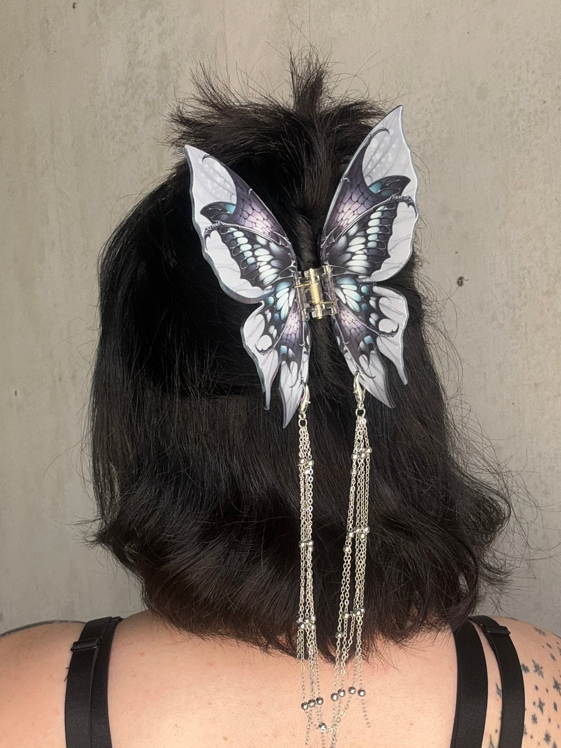 Gorgeous custom made butterfly claw clip with removable rosary chain style attachment. printed acrylic and alloy