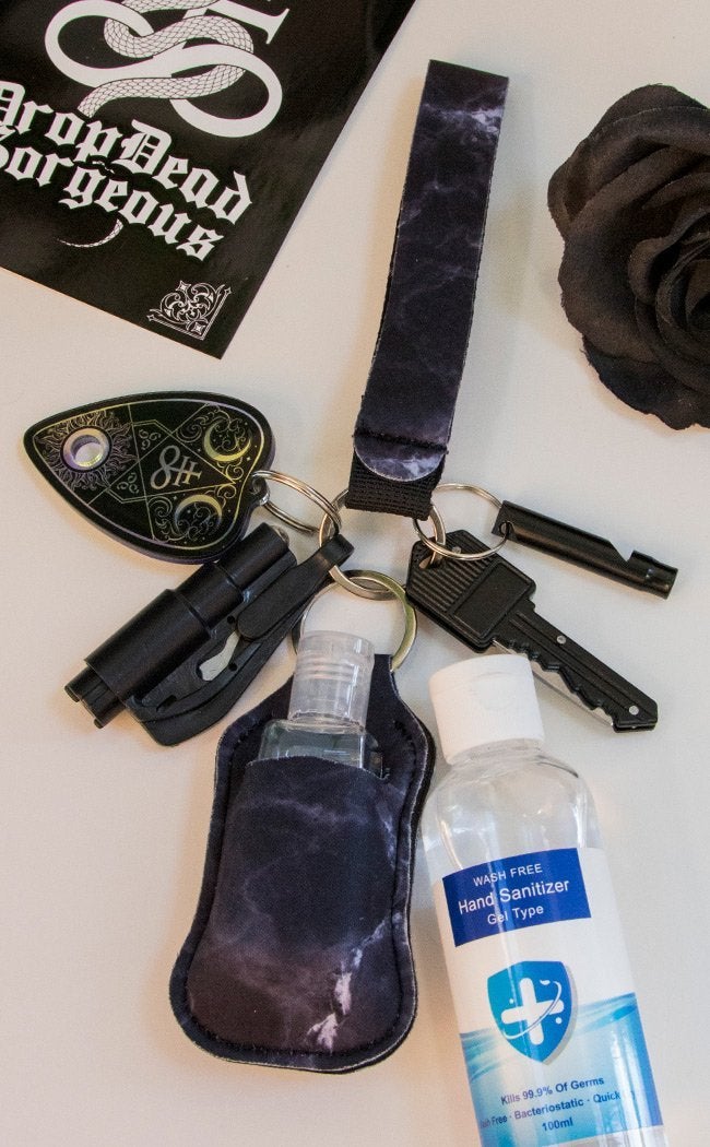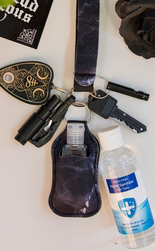 The bee safe utility keychain features a wrist strap with a whistle, a mini hand sanitiser bottle with pouch, a window breaker / zip tie cutter, super cute keychain charm and optional key shaped letter opener. All orders come with a 100ml hand sanitiser gel refill.