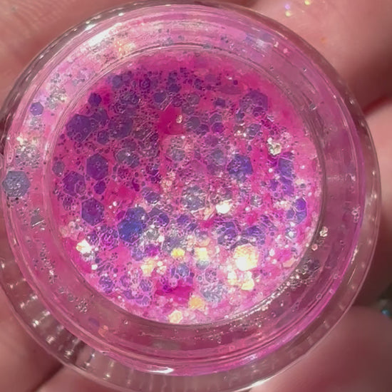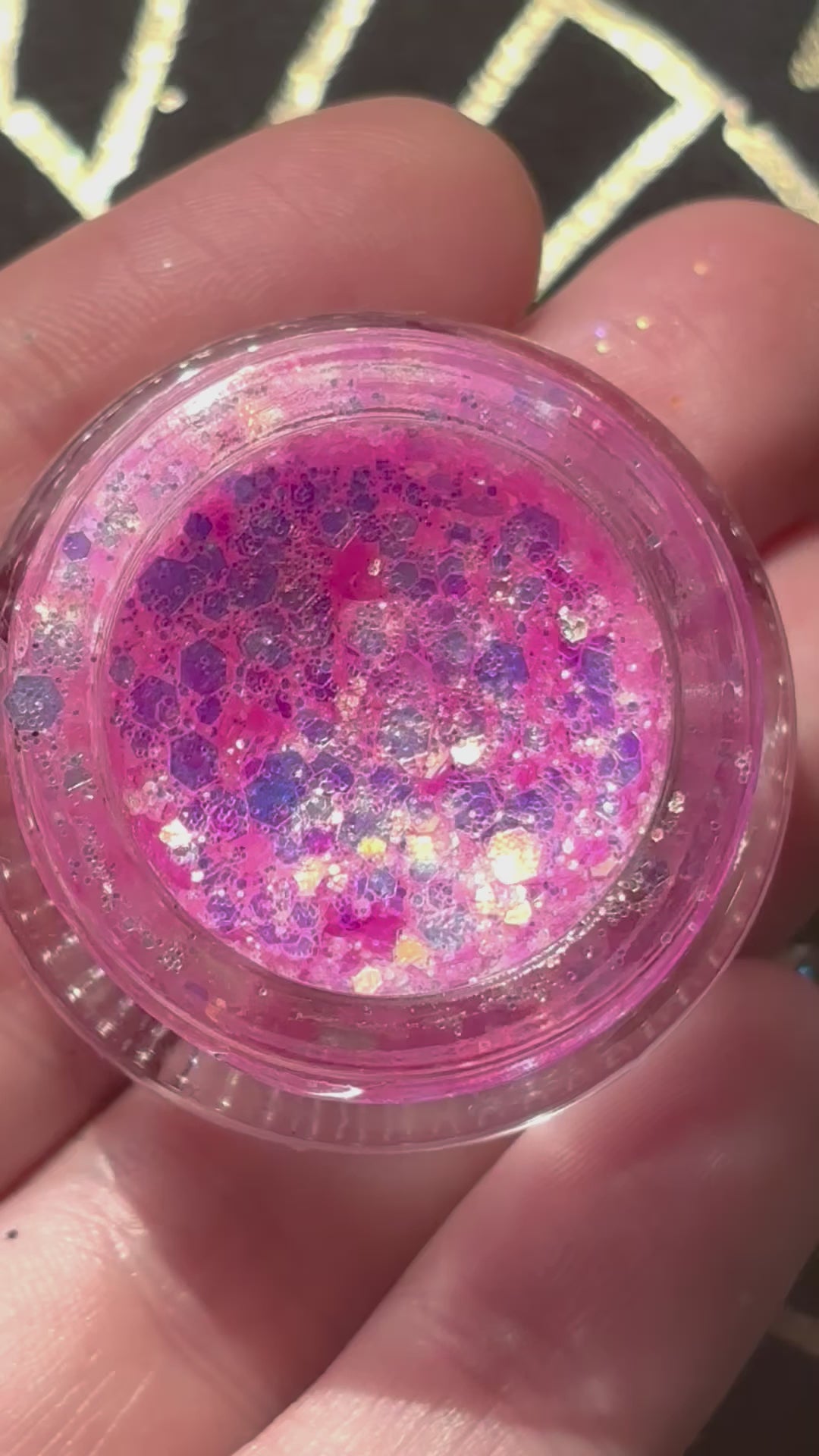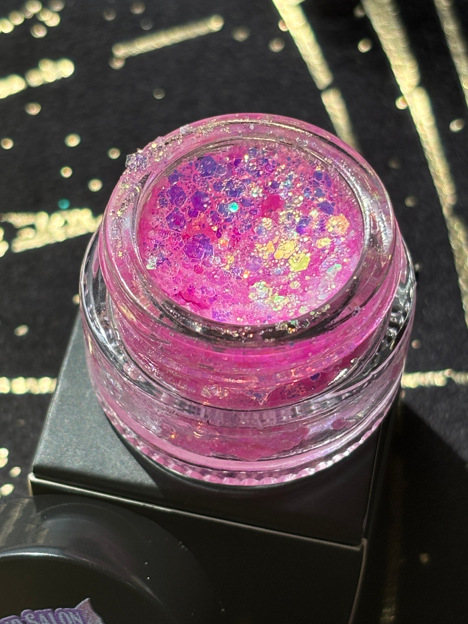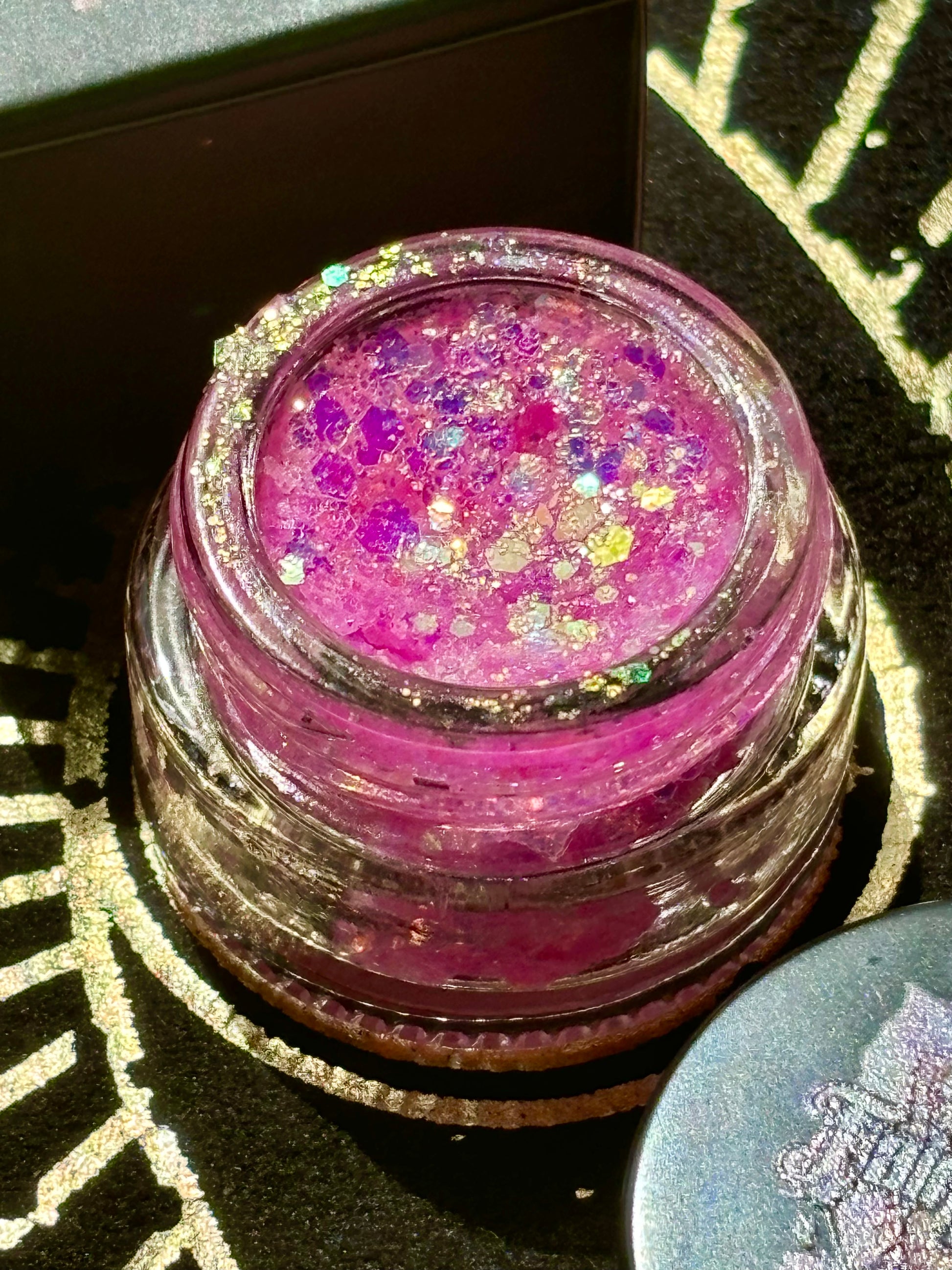 Self adhering mixture of glitter, Mylar and balm to add the perfect pop of ethereal glow.