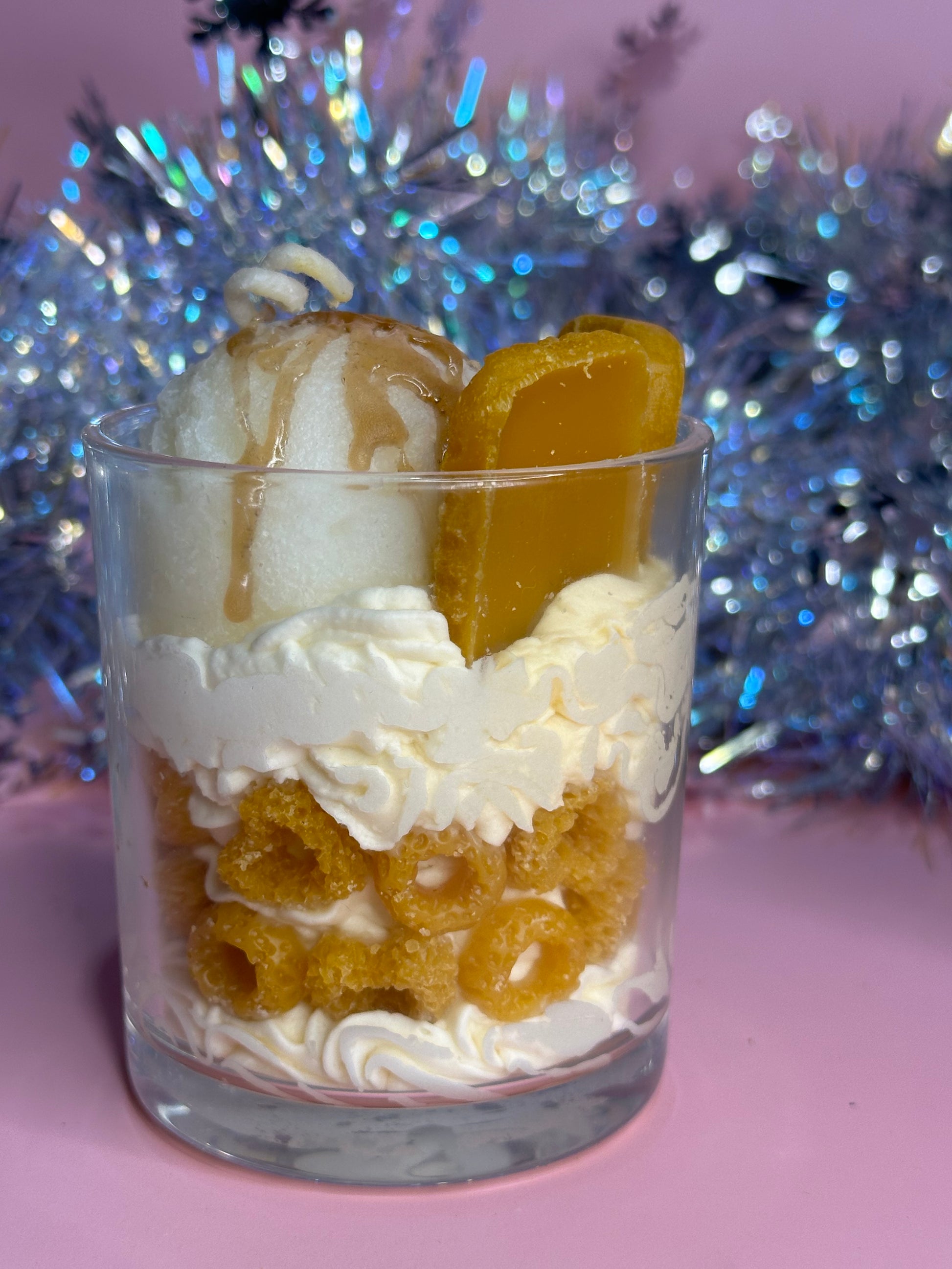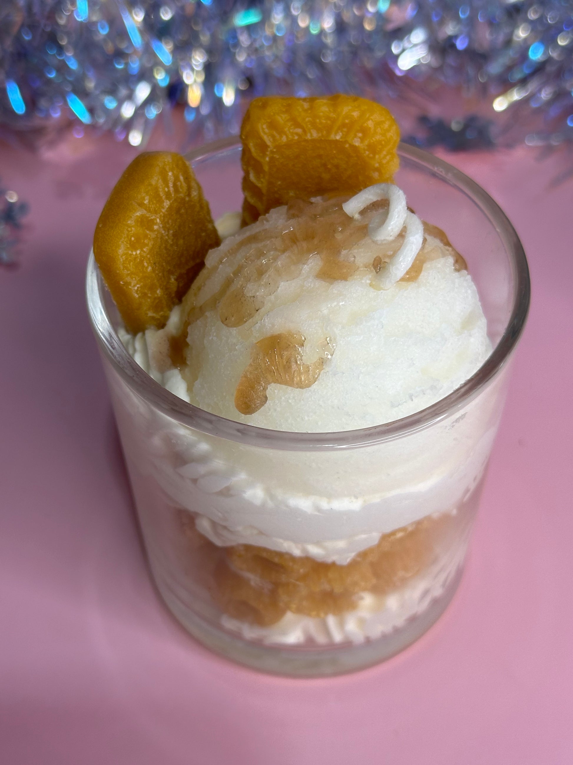 This super cute hand poured candle is 100% soy wax, topped with faux ice cream and syrup made of wax!