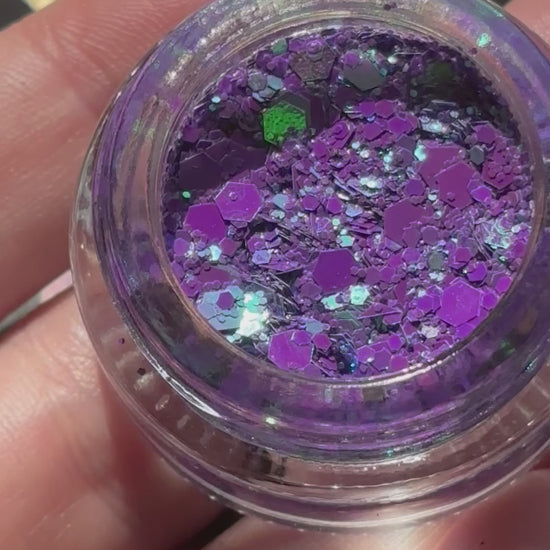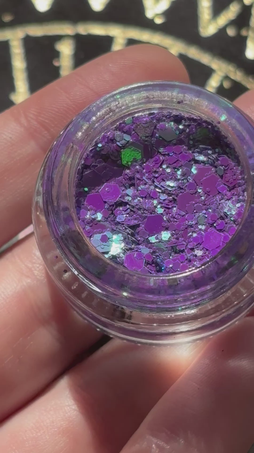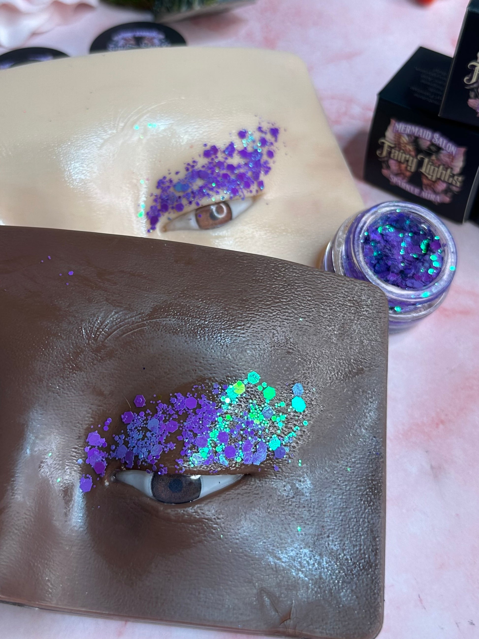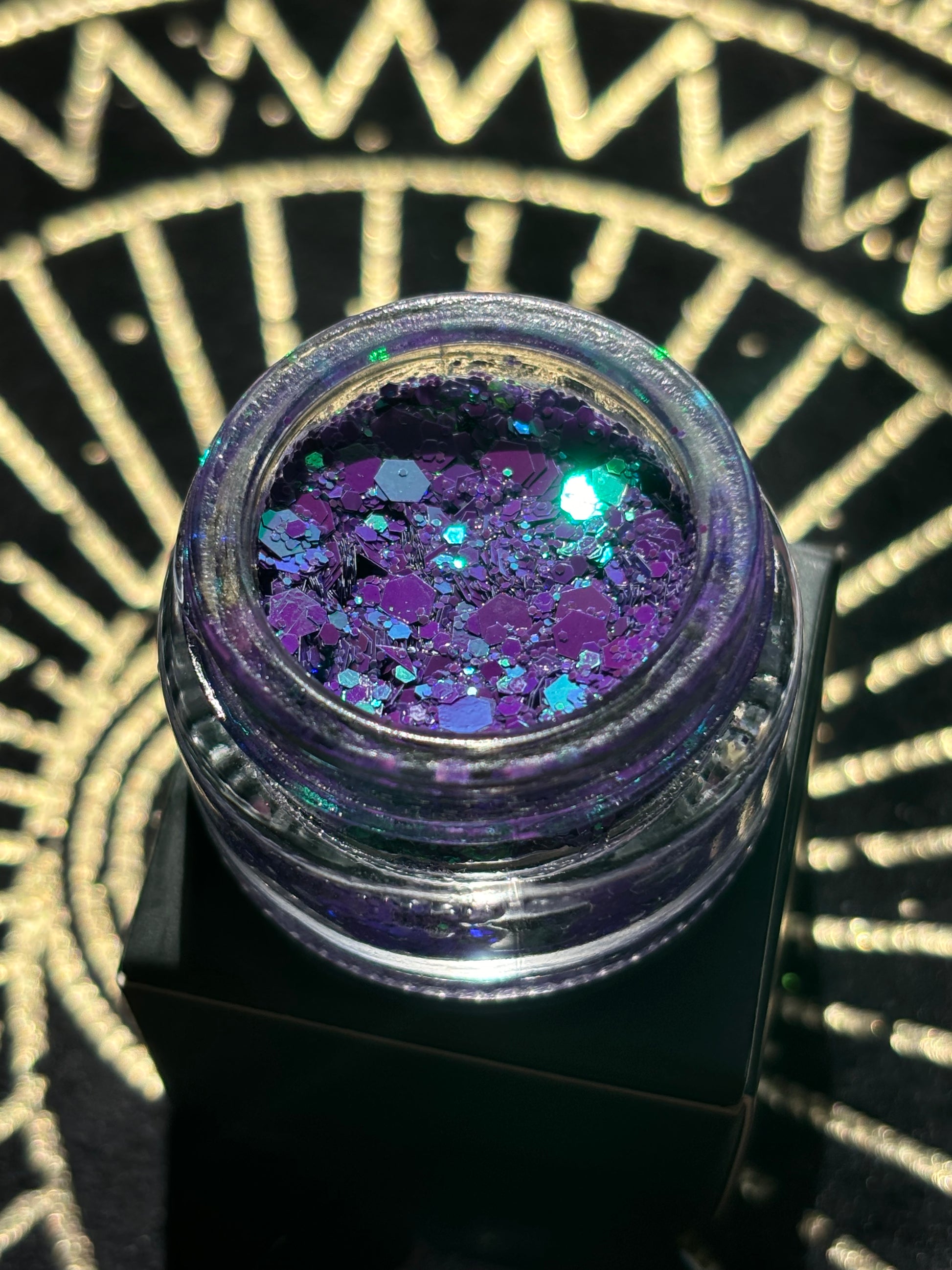 Self adhering mixture of glitter, Mylar and balm to add the perfect pop of ethereal glow.