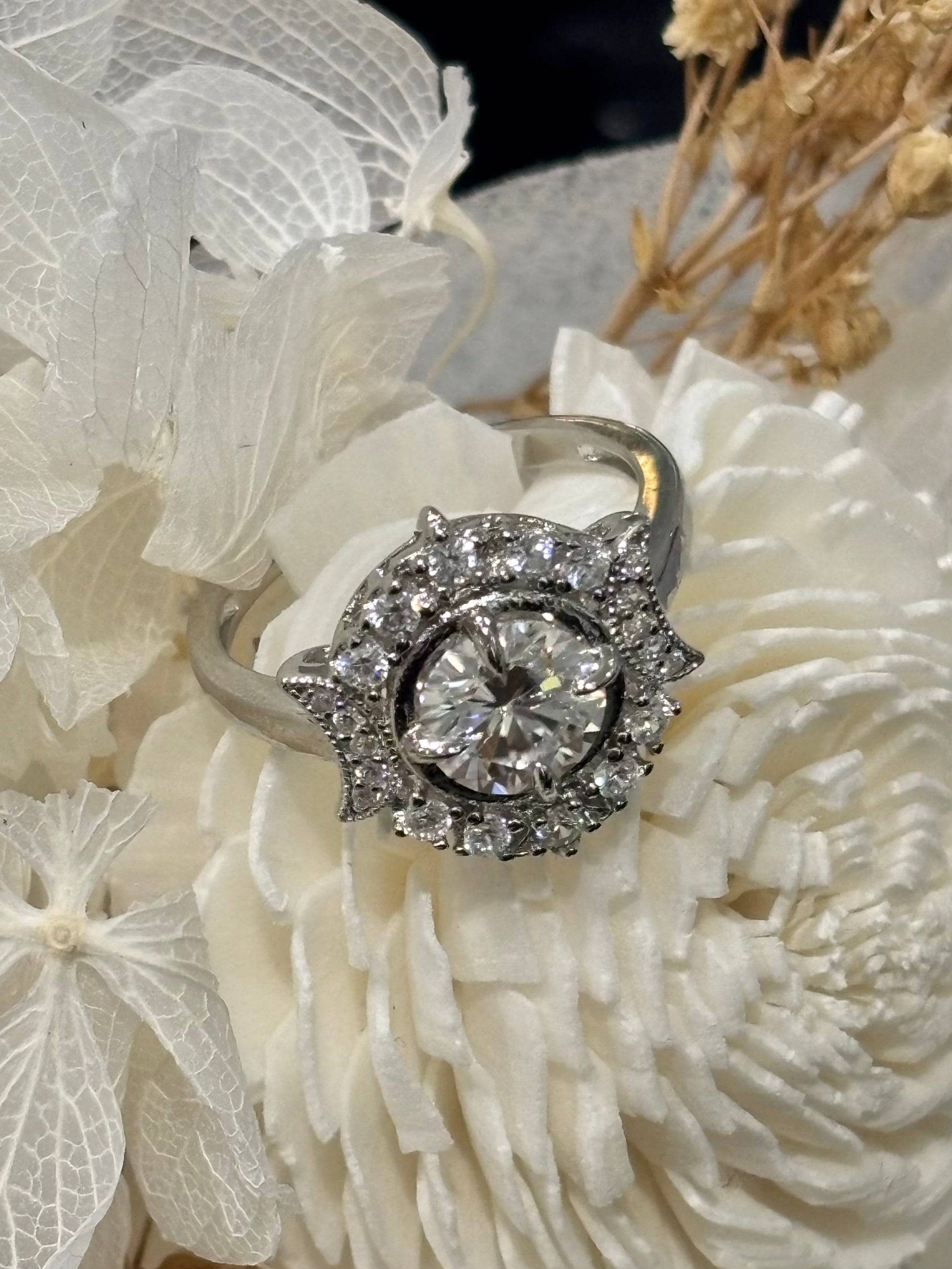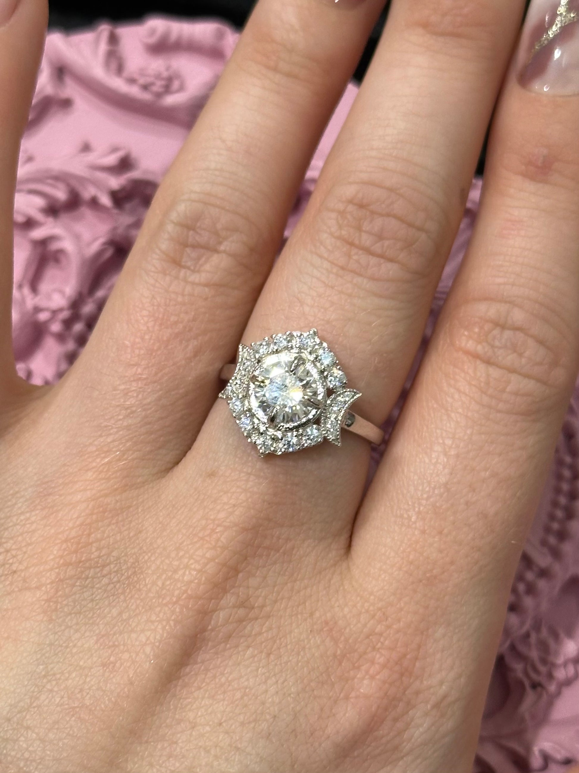 Moisonite feature stone surrounded with white cubic zirconia. Our stones are lab created - which means they are not glass, they are stones created in the same circumstances as a natural occurring stone is created , in a supervised lab to “grow” the stones. These stones are mine-free.