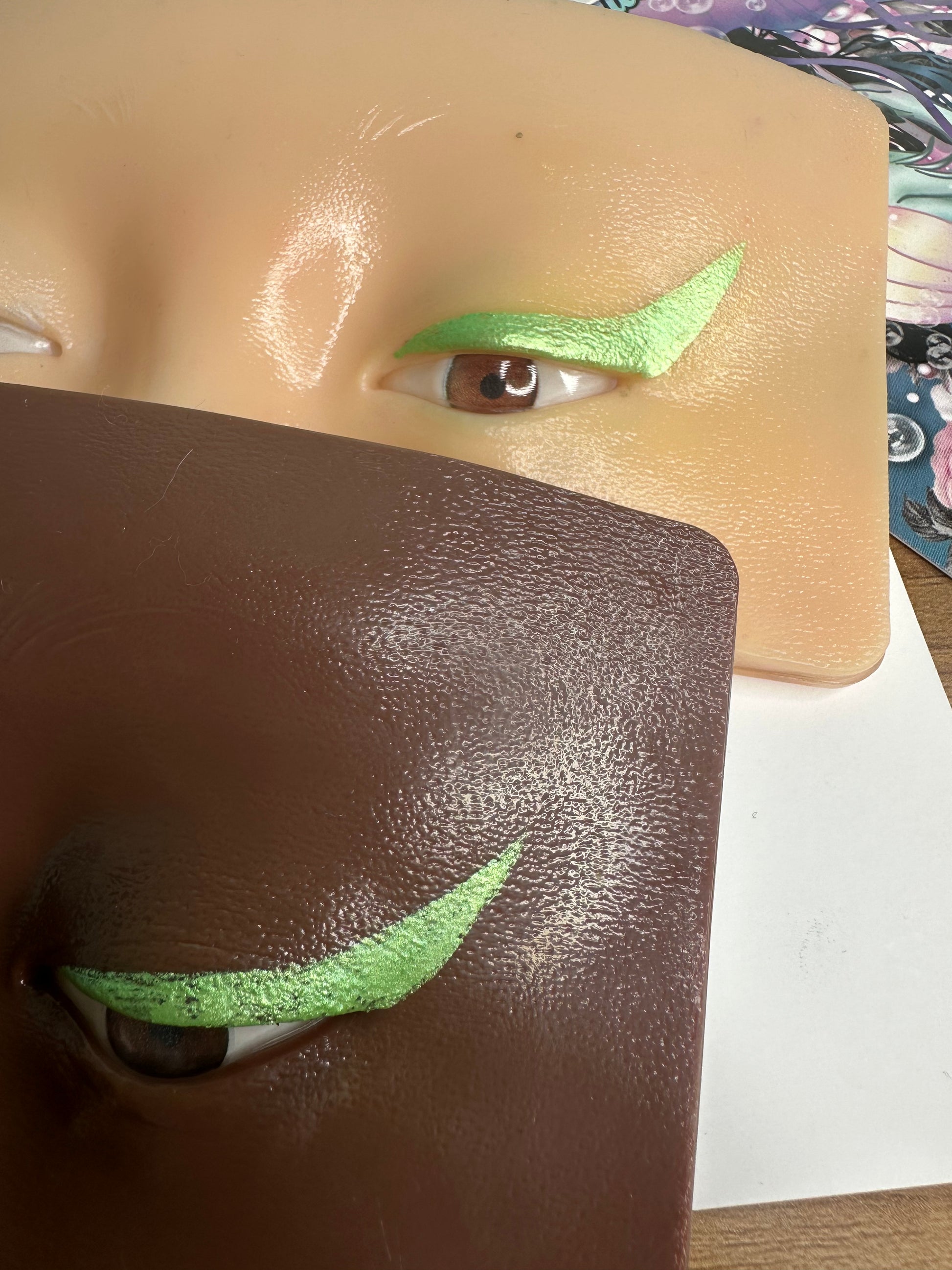Use a wet brush of desired size to mix water with the pigment cake to produce a creamy that is ready to apply! It can be used on your eyelid as a liner or as a faceaint.
