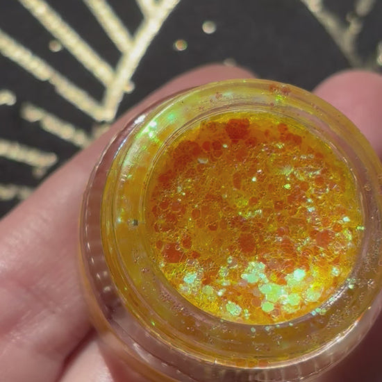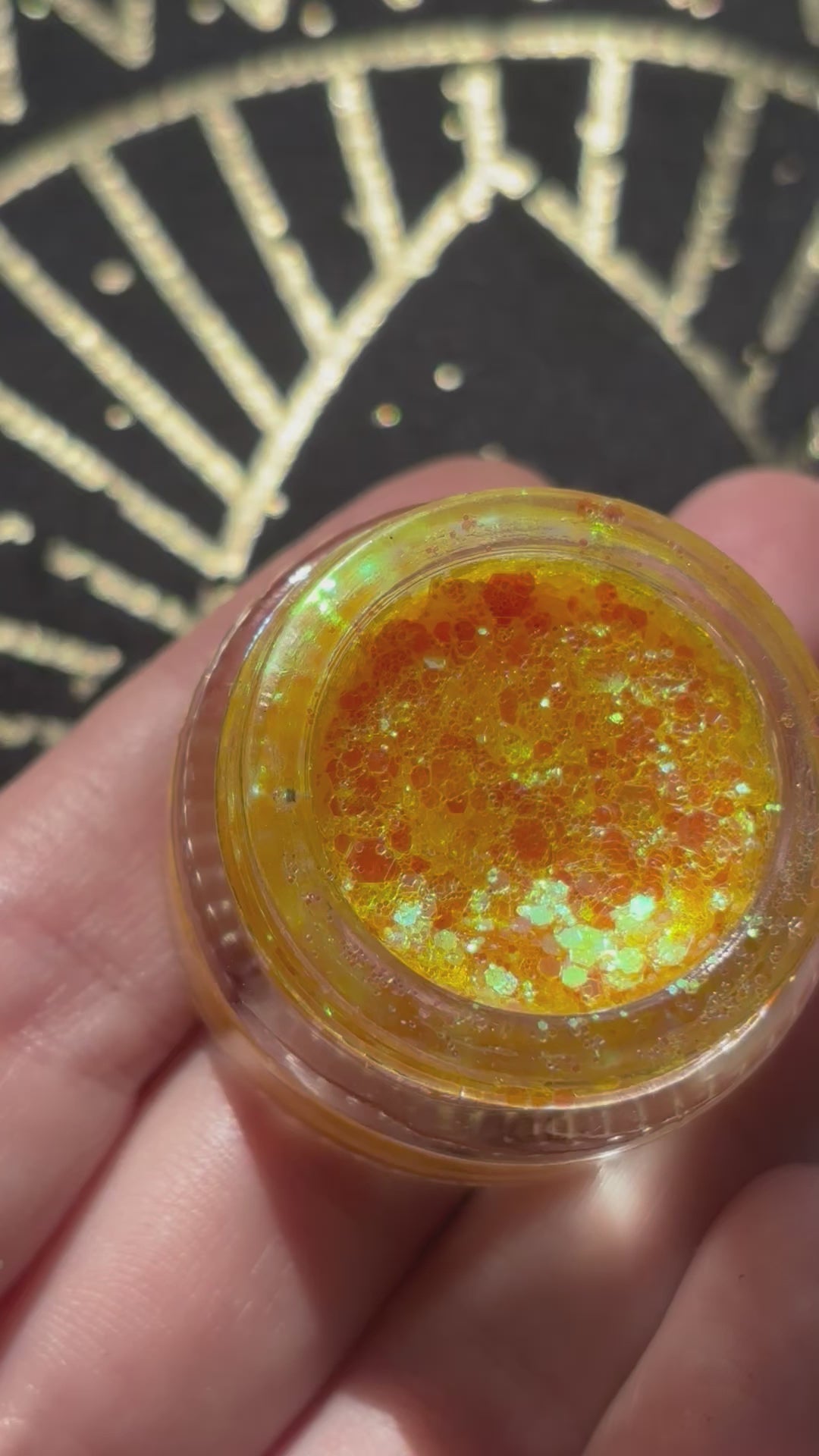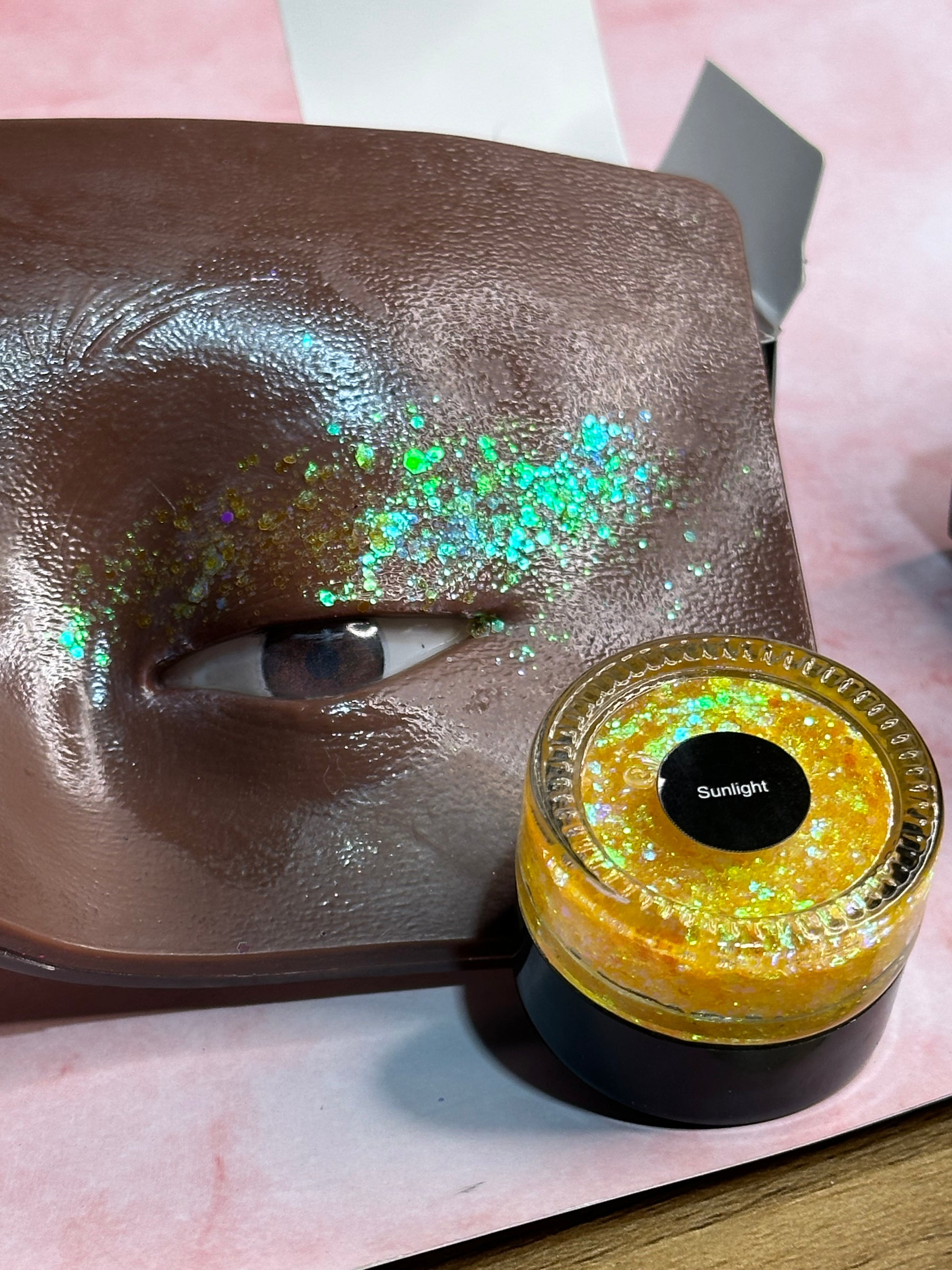 Self adhering mixture of glitter, Mylar and balm to add the perfect pop of ethereal glow.