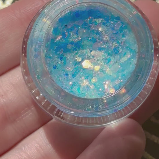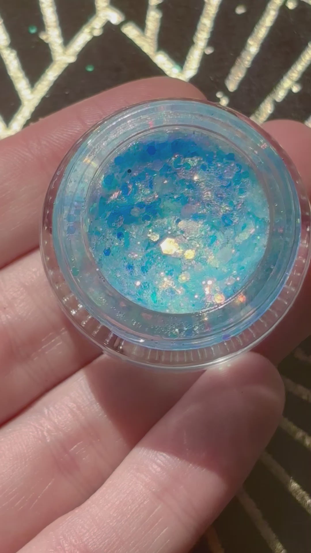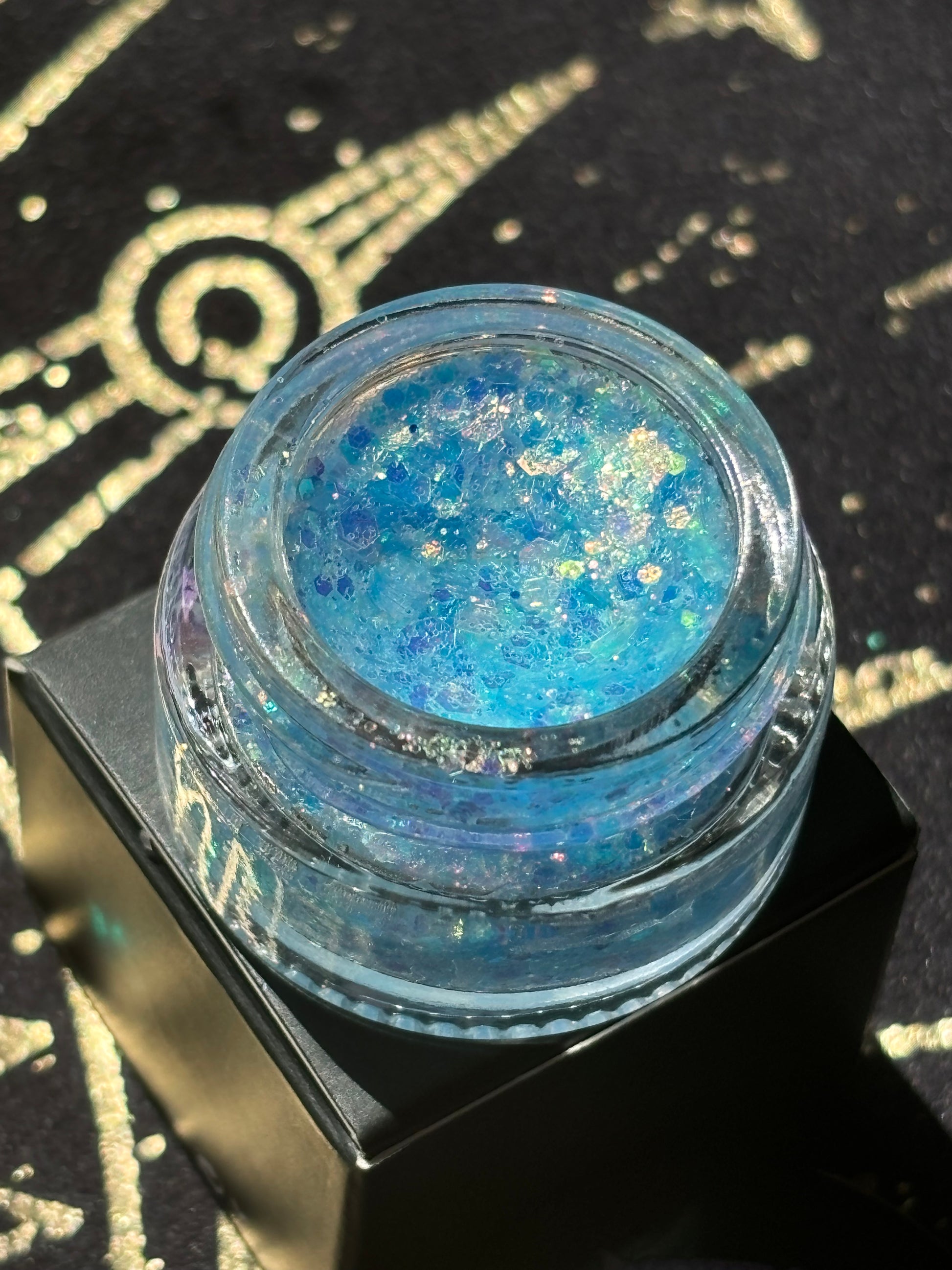 Self adhering mixture of glitter, Mylar and balm to add the perfect pop of ethereal glow.