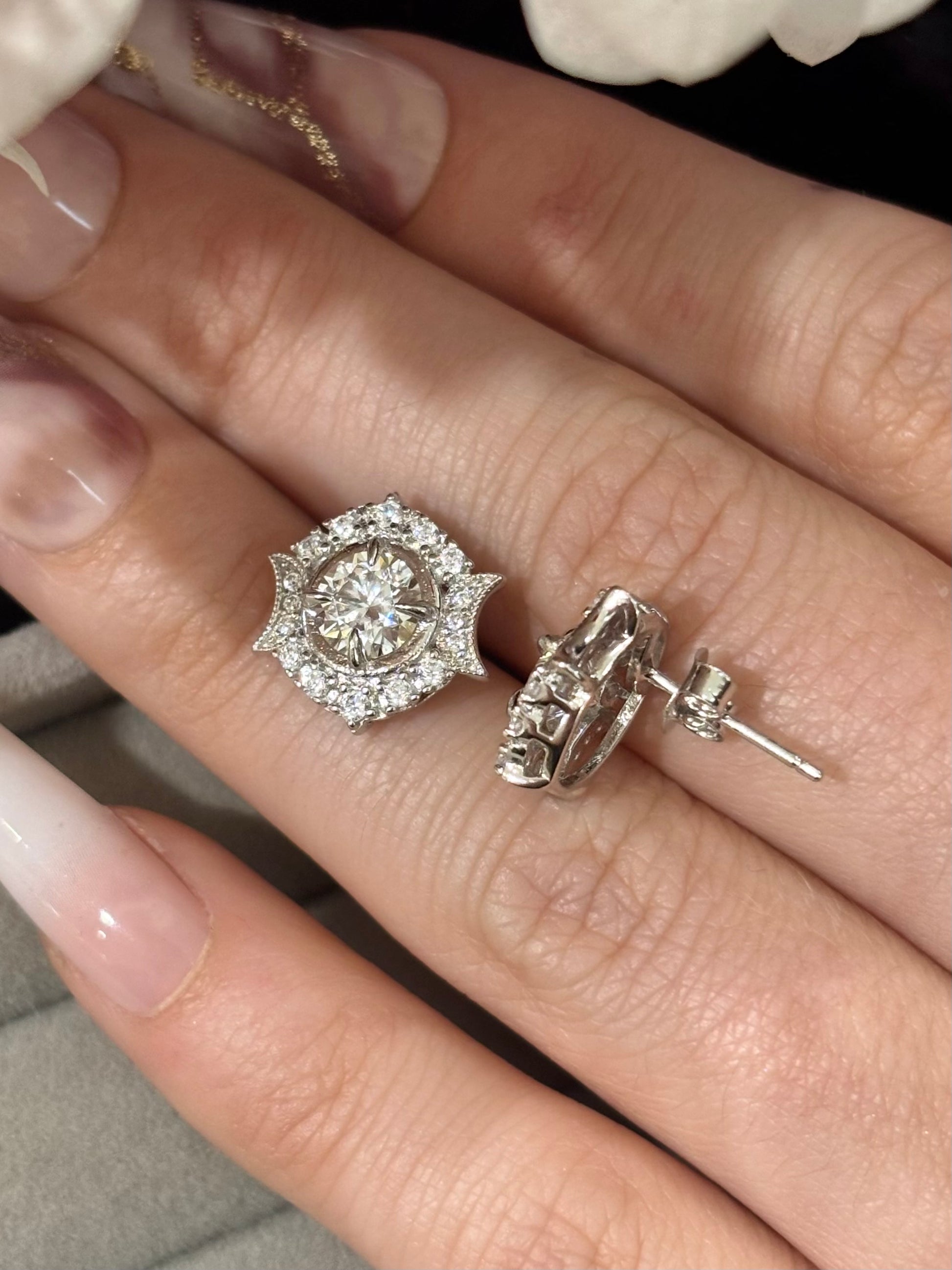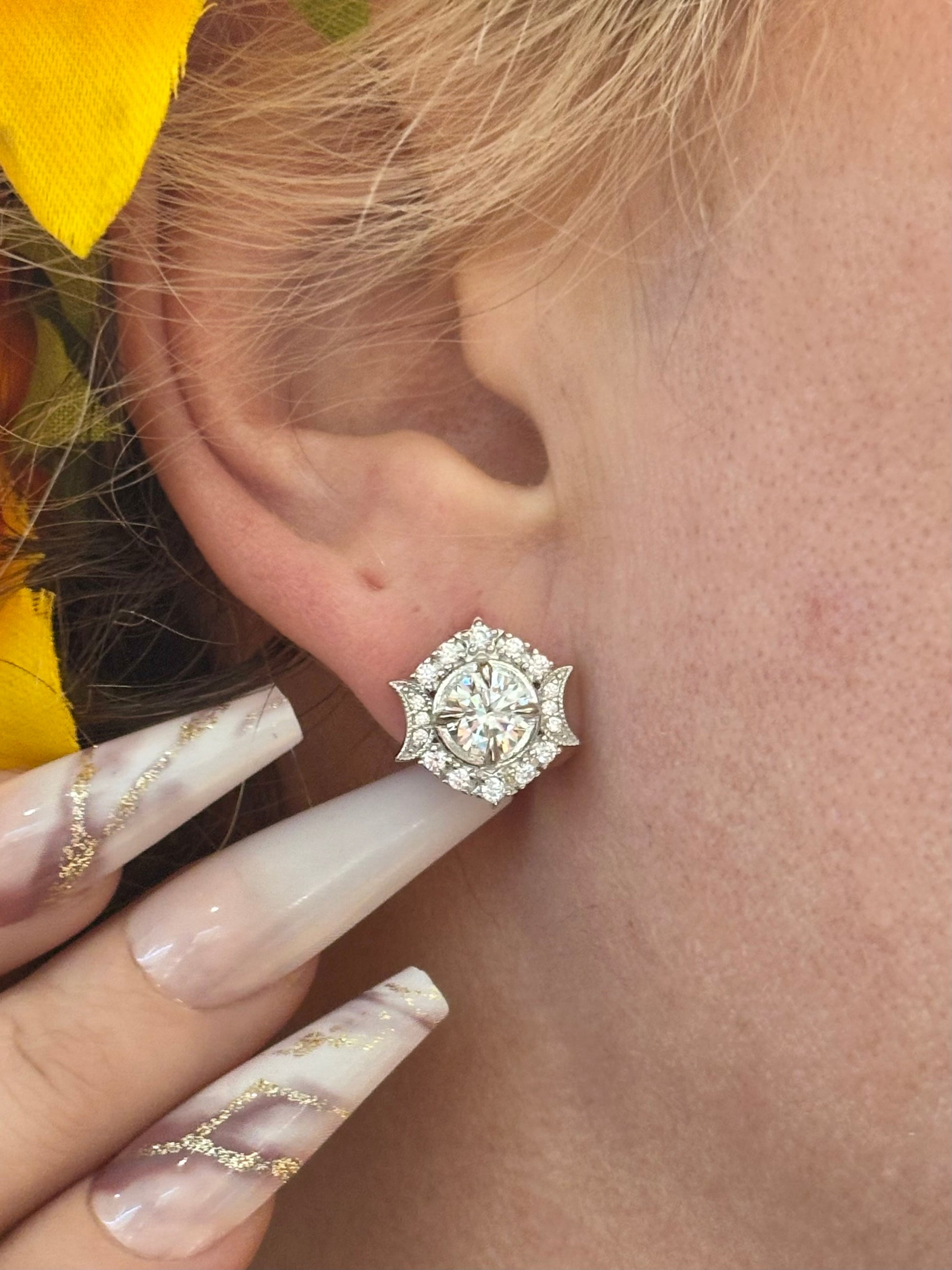 Moisonite feature stone surrounded with white cubic zirconia. Our stones are lab created - which means they are not glass, they are stones created in the same circumstances as a natural occurring stone is created , in a supervised lab to “grow” the stones. These stones are mine-free.