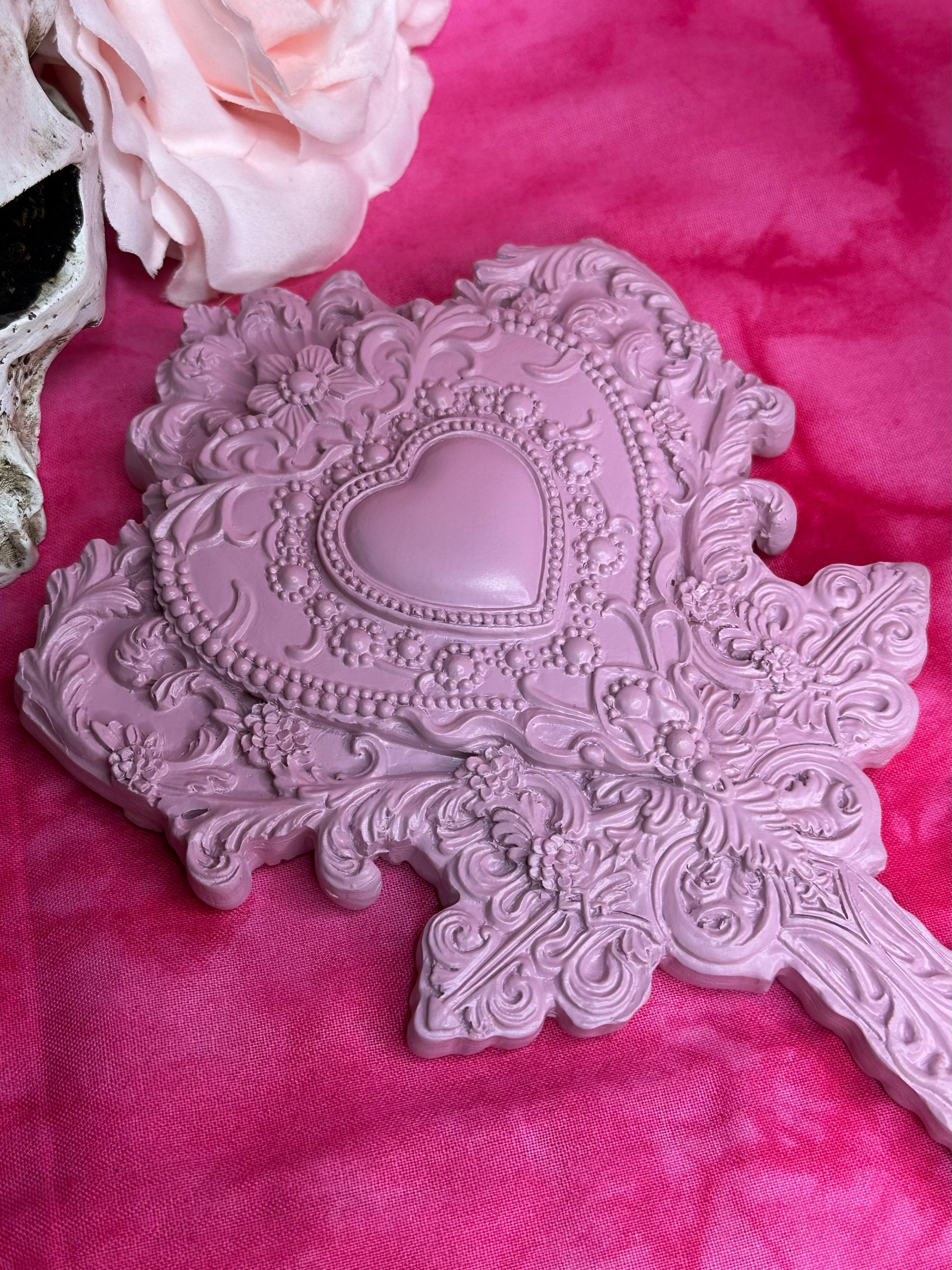 This absolute show stopping hand mirror is a cast replica of our original art piece titled “vanity valentine”. It is hand cast with museum quality matte rose resin.