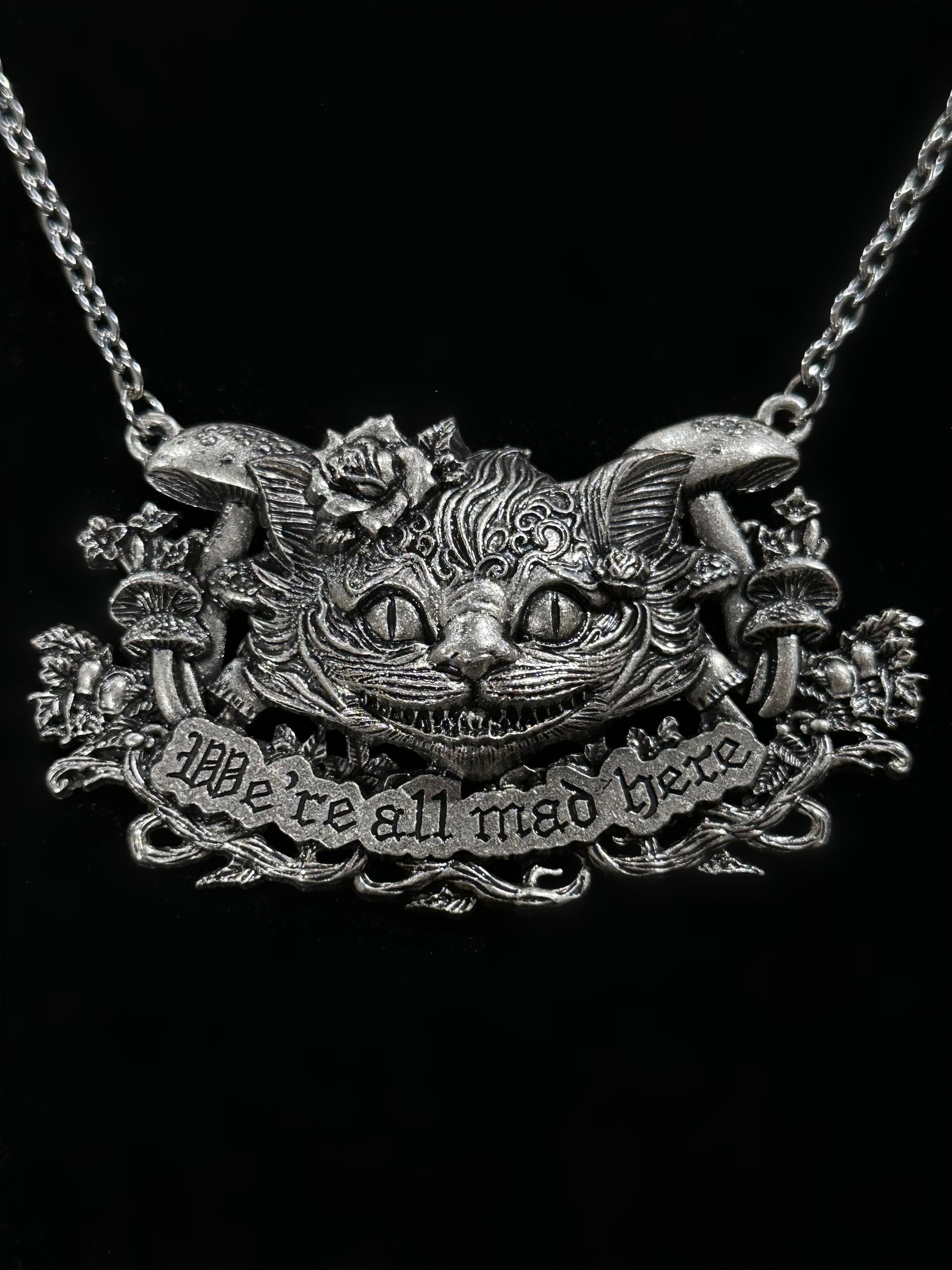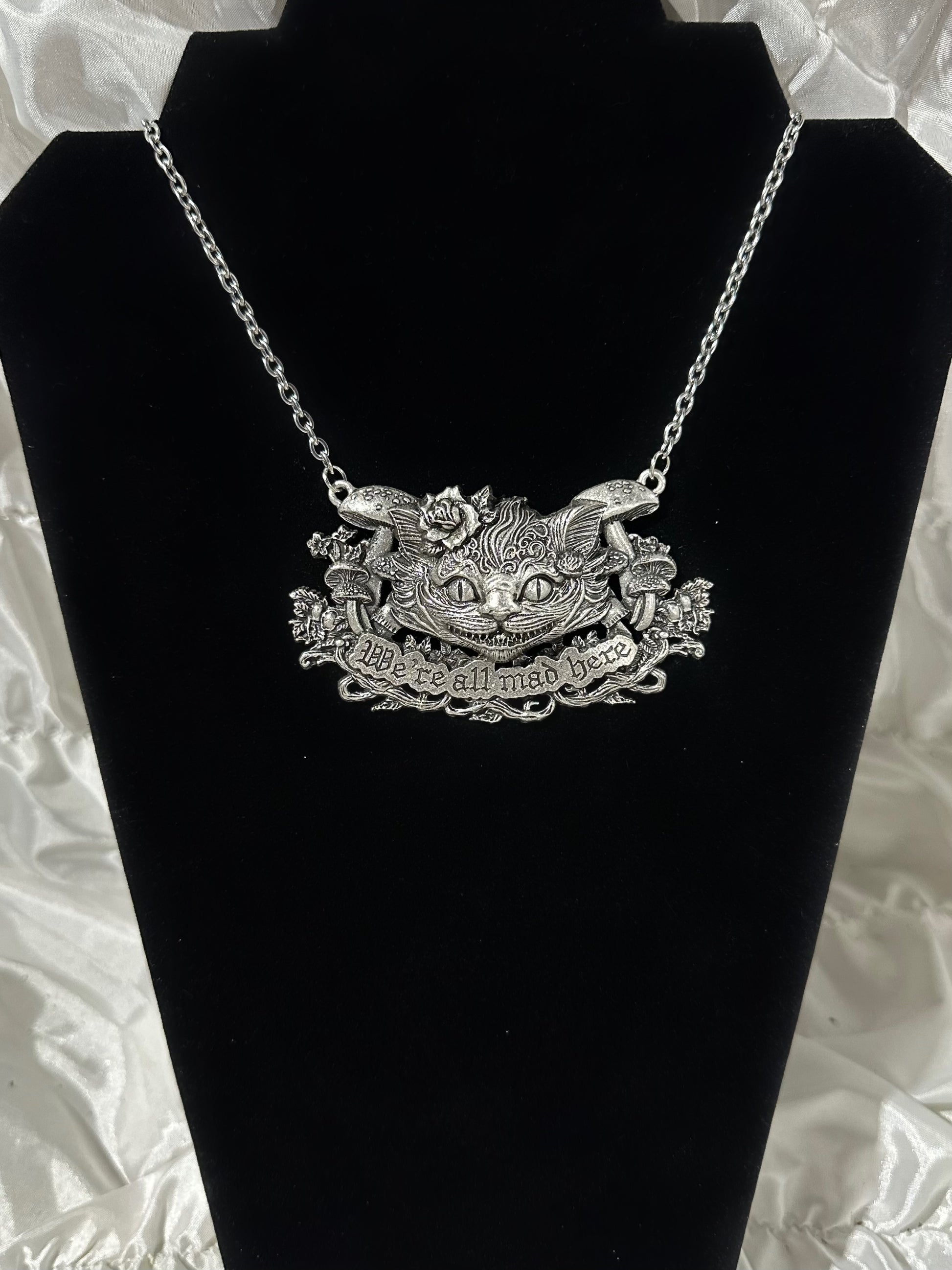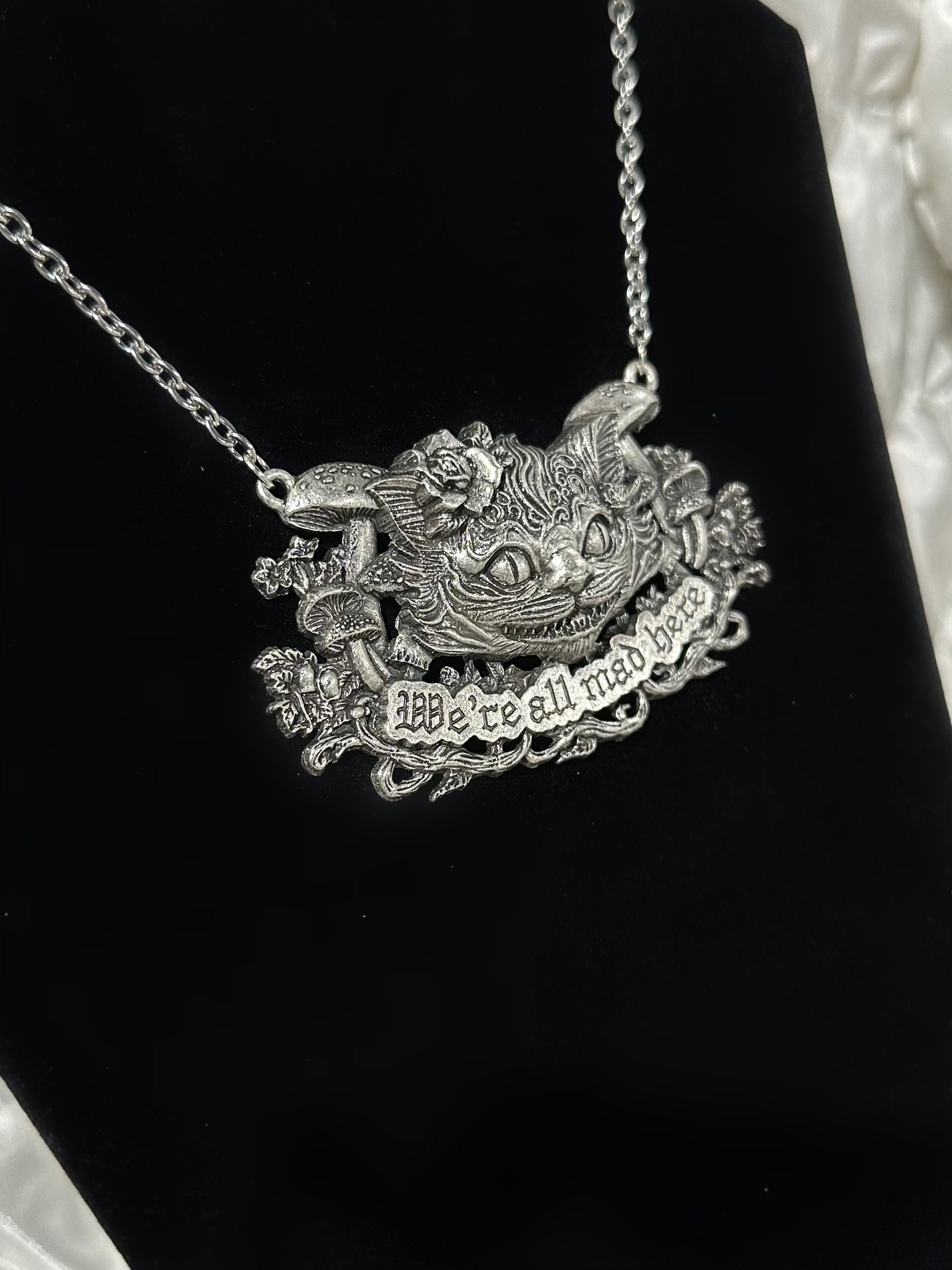 This cast alloy necklace features an ornate cheshire cat with the iconic tag like WE'RE ALL MAD HERE!