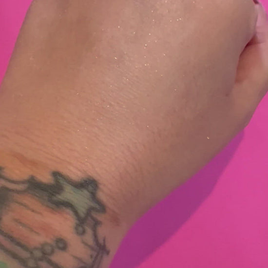 The Spooky Shimmer powder adds a unique shimmer finish that glitters with every turn of your head. Use as a regular setting powder or dust n your collarbones, cheeks, or all over for a Y2K glitter bomb look!